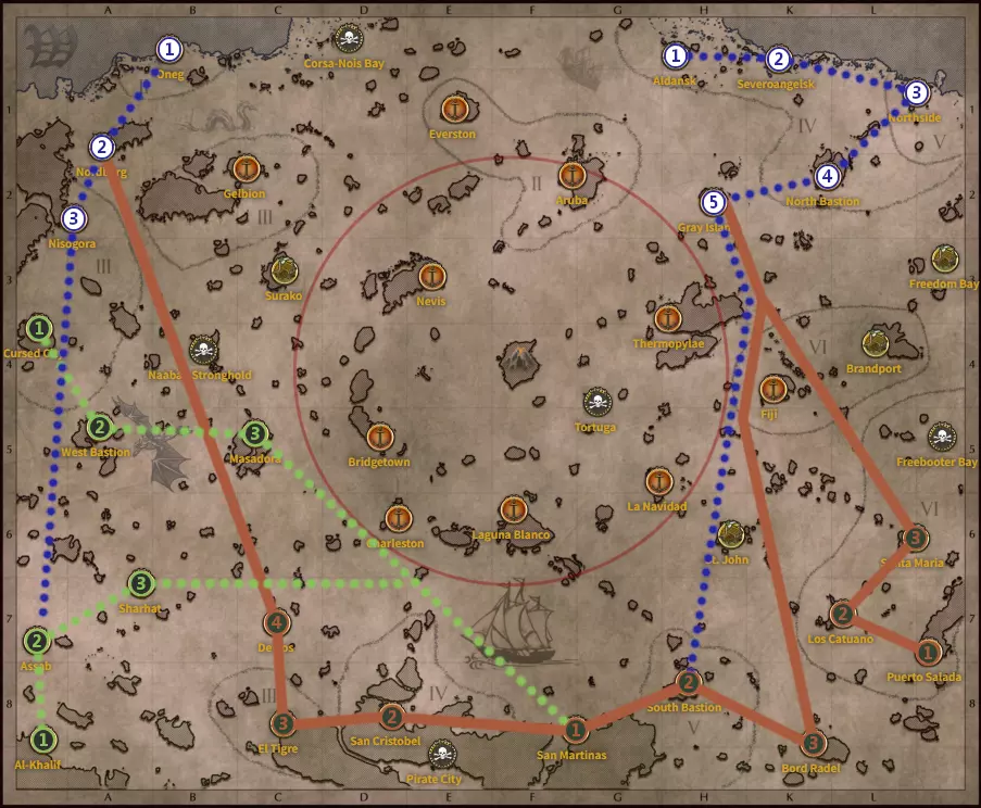 推奨設定 ESC > Setting で設定を変更する。 言語設定の反映にはゲームの再起動が必要なので、日本語を選択した後で一度ログアウトしよう。 一般・言語:JA - 日本語 ・水平線の傾き:OFF ・風向き:ミニマップに表示 ・表示時間:ローカル UTC+09:00 インターフェイス・ミニマップのサイズ:最大 ・ミニマップの回転:OFF ・弾薬を表示:ON ・照準スタイル:マーカー 操作・右クリックアクション:散布界(又は単発砲撃) チュートリアル 基本チュートリアルゲーム開始後、東部海域にスポーンする。 基本のチュートリアルをこなしつつ、フィジー(危険度2)周辺の上陸地点を調査して資材を集めよう。弱い敵船が多いので「〇〇を使って〇〇を倒せ」などのチュートリアルは簡単にこなせるはずだ。 NPC船を捕獲するチュートリアルは、他プレイヤーの横槍が入ると失敗する。できるだけプレイヤーの少ない場所を探そう。 捕獲した船は [Z] キーで指示を出せる。 アカデミー基本のチュートリアル終了後、以下の2つのアカデミーが開始される。 ・貿易アカデミー ・戦争アカデミー 戦争アカデミーを進めていって、「5等級の船を建造する」を達成すると序盤終了となる。これには大量の資材を必要とするため、しばらくは放置することになるだろう。 5等船には「梁材」、「隔壁」、「帆布」が必要だが、序盤は同じ街に複数の専門工房を建てることができない。複数の街に専門工房を建てて製品を輸送・集積しよう。 規模の小さい港では5等船は建造できないため、建造可能な港に移動しなければならない。また、船には派閥が設定されており、その派閥が支配する港で建造すれば 20% 割安である。 東部海域で最も栄えているのは「St. ジョン」だが、ここは派閥に属さない中立勢力であるため、割引を得るために遠出することになるだろう。 ※ 都市の所属派閥はギルド戦争によって常に変化しているため、場合によっては作りたい船と一致する派閥の都市が一つも無いこともある。この場合、ソロプレイでは割引を受けることはできないが、特定のギルドに加入すると割引を受けられる可能性がある。 私有島 工房Lv.9 になったら即座に私有島を確保し、島に工房を建てよう。 私有島の工房は街の工房よりも資材の必要数が 20% 少ない。 工房の生産品はいつでも変更できる。チュートリアルで「梁材」はどこかの街に既に建てているはずなので、最初は「鉄板」か「隔壁」がよいだろう。 ランクペナルティーキャプテンランクが Lv.10 になると私有島の建築物には倍の資材が必要になり、Lv.20 になると更に倍の資材が必要になる。遅くとも Lv.19 までには一つめの私有島の建物を全て完成させたい。 場所鉱山や農場から生産品を自動的に収集する機能があるので、各地の施設から 7000 距離内の場所に建てよう。海図を開いて [Ctrl] を押すとディバイダーを利用できる。こだわりがなければプレイヤーの多い「St. ジョン」周辺の深海域が便利だろう。浅海域は大型船が進入できないので不便 第二の私有島2つめの私有島を保有するためには、以下の2つが必要 ・スキル:「私有島」 ・実績 :「派閥布告」 「私有島」のスキル取得には 1 スキルポイントと 30万 ゴールドと「派閥布告」の実績が必要。 実績を取得するには、いずれかの軍事派閥の名声を 100 にする。なお、特定の派閥の名声を上げても、その他の派閥と敵対関係になるわけではない。全ての派閥の名声を 100 にすることも可能である。 東部海域の St. ジョン、サンタマルタ、プエルト・サラダ、ブランドポート は中立なので、ここの酒場でクエストを受ければ好きな派閥をチョイスして名声を上げることができる。 必要な名声は 100 なのでクエストを 100 回やる必要があるが、配達クエストなら狭いエリアを風に乗って巡回するだけなので、すぐに終わるだろう。 3つめの私有島にはブードゥー骸骨 1000 個と建造許可証が必要で、エンドコンテンツとなっている。 PvP PvPフラッグ平和フラッグ以外のフラッグを掲げた場合、他プレイヤーと戦闘になる可能性がある。 平和フラッグを掲げていても、危険海域に侵入して法の保護を外れた場合は他プレイヤーと戦闘になる可能性がある。 危険海域は ①マップ中央の円形エリア、②マップ外周の果て無き海、③ランダム生成される海戦エリアの3つ。 PvPフラッグの変更港や集落でフラッグの変更が可能 危険海域の港に入港すると平和フラッグは強制解除され、囮フラッグに変更される。この場合、安全海域の港に再入港するまで平和フラッグに戻すことはできない。 PvPフラッグのボーナス囮フラッグ、ブラックフラッグ、派閥フラッグ(通商連合以外)には戦利品ボーナスがあり、敵からの戦利品やクエスト報酬を増加させる。キャプテンマーク(プレミアムアカウント)やランタンなどの類似効果とは加算される。 例えば囮フラッグ(10%)、キャプテンマーク(40%)、赤ランタン(7%)なら 57% 増加する。 特徴として、PvPフラッグの戦利品ボーナスは自分が所有する鉱山
