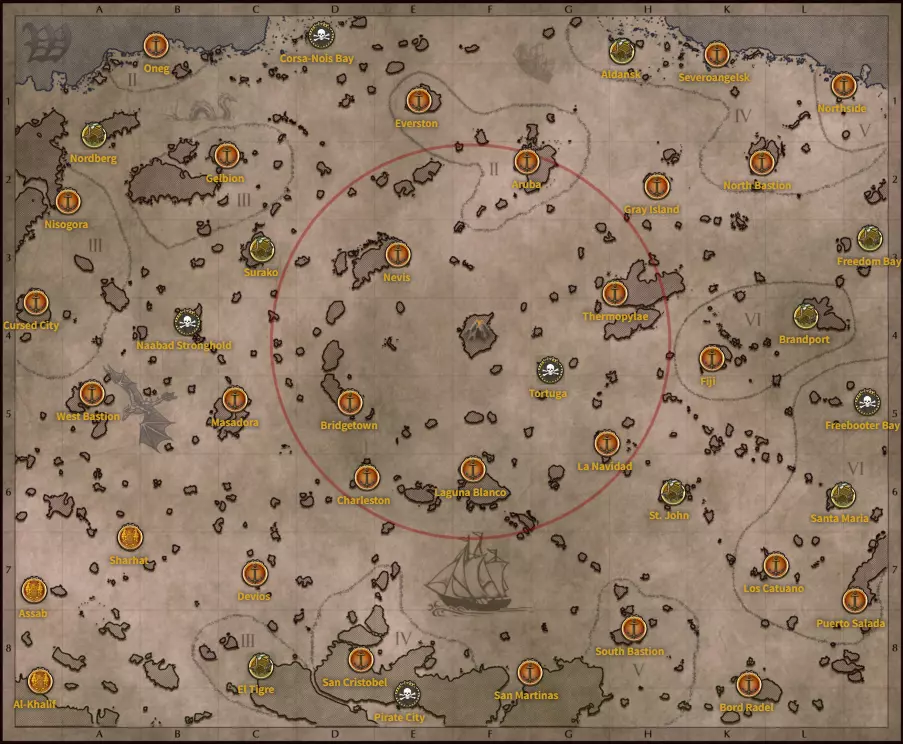 海图 Capt. Jahir制作的网页地图 海图上的罗马数字代表浅海域,数字相同等级的船只可以航行 例如V级海域,5级船可以正常航行。