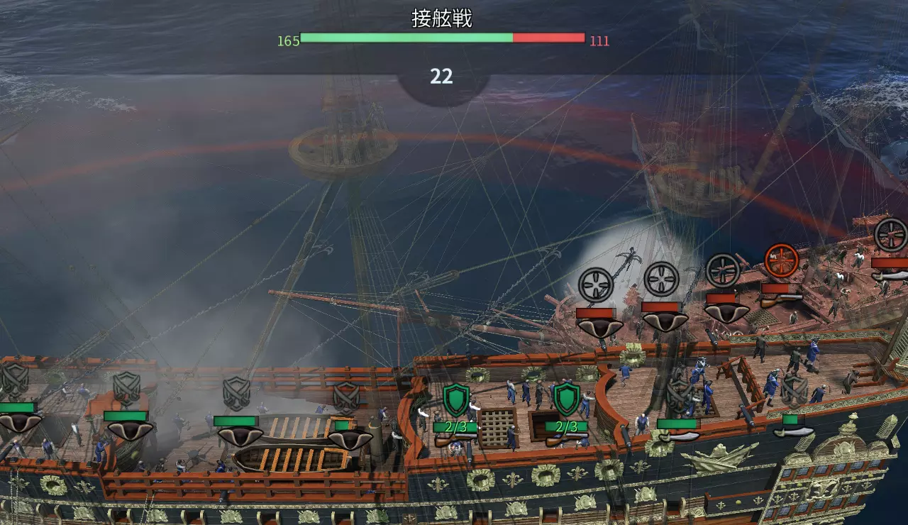 接舷战 接舷条件: - 敌船耐久值低于50% - 己方船只已对敌方船只造成足够伤害 - 己方与敌方船只的相对速度低于一定值 - 己方与敌方船只保持平行(船头与船尾方向相反也可) - 己方与敌方船只处于可接舷的距离内 分队编成: 分队规模约为20至30人 由于枪手最为重要,建议在满足分队人数的前提下优先编入枪手 例如,若船只可搭载20名分队成员和48名战斗人员,可先组建20名枪手、20名剑士的分队。对于剩余的8人: - PvE模式下,可编入能增加掠夺量的佣兵 - PvP模式下,建议组建由枪手或剑士组成的第二分队由于指挥的详细机制尚未公开,因此最优化的策略尚不明确。 在PvE中,常规的做法如下: ①集中攻击敌军的枪手单位 ②命令己方枪手单位进行防御 采用这种方式,除非发生特殊情况,否则应该不会失败。