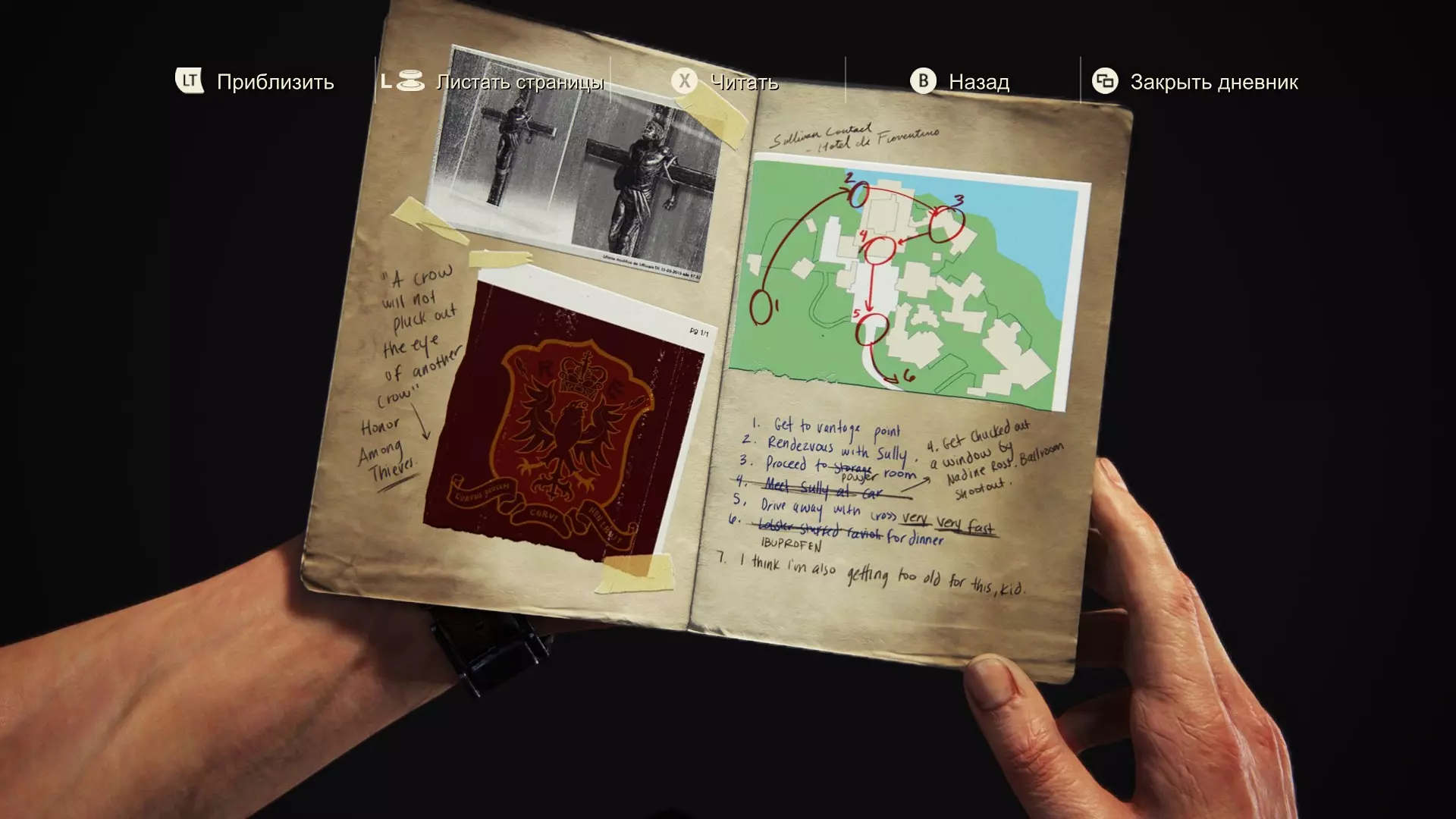 “黑吃黑”。 盗贼的荣誉。 [上方] 联络人沙利文 - 迪·菲奥伦蒂诺酒店 [下方] 1. 抵达观察哨 2. 与沙利会面 3. 抵达涡轮机房仓库 4. 与沙利在车旁会面 5. 在娜丁·罗斯的协助下破窗而出。宴会厅枪战。 6. 取走十字架并迅速撤离 7. 晚餐配虾和布洛芬 8. 我觉得,我也开始对这一切感到力不从心了。第7-8页