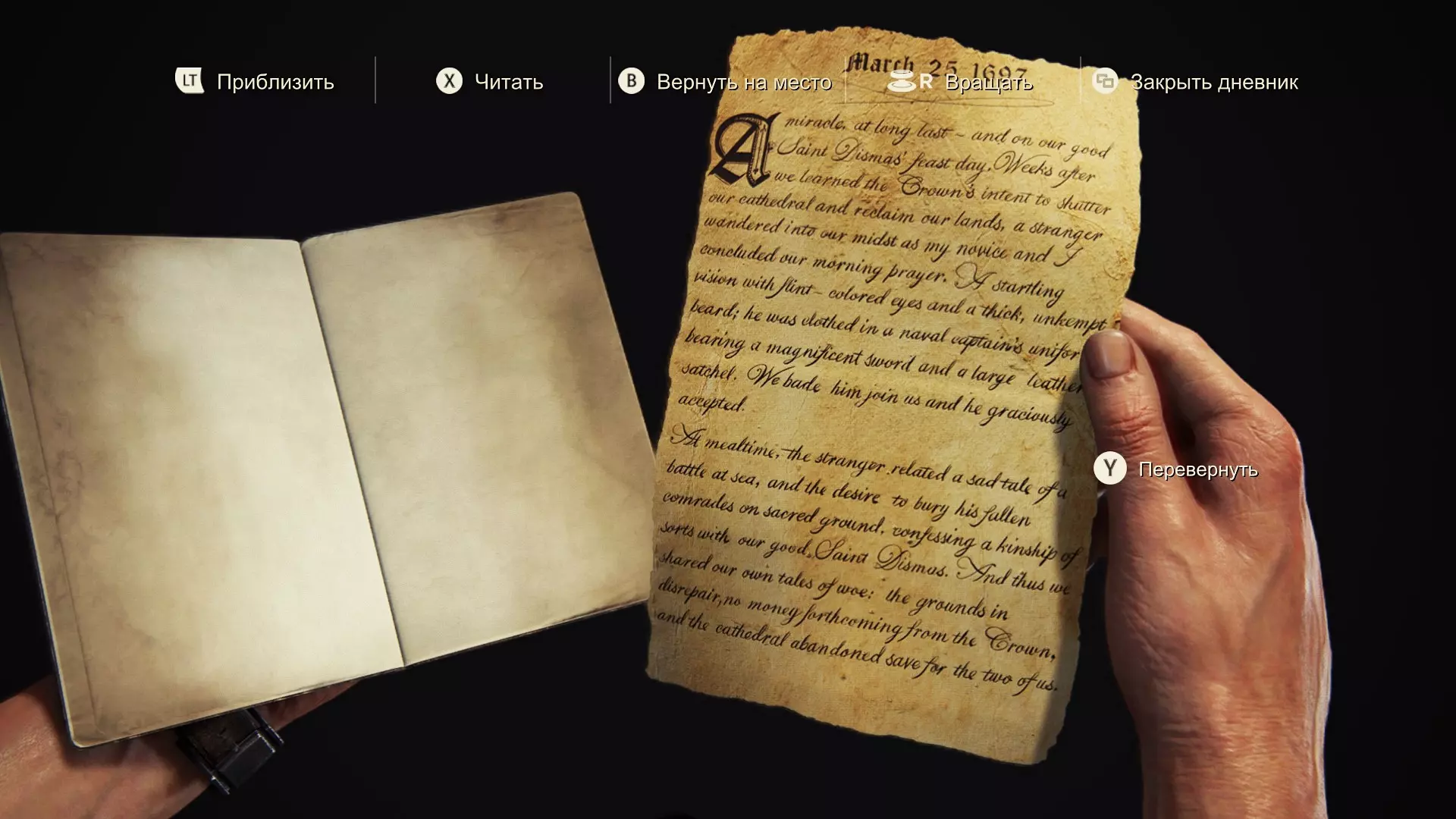 期待已久的奇迹——恰好在我们的圣迪马斯节当天降临。 几周前,我们得知王室打算关闭我们的大教堂并夺走我们的土地。就在那时,一个陌生人走进了我们的修道院。当时,我和耶稣以及门徒们刚结束晨祷。他的样子相当吓人——双眼空洞,胡须浓密蓬乱,有着海军船长般的身形,佩着一把精致的剑,还提着一个大大的皮袋。我们邀请他加入我们,他答应了。 饭后,陌生人讲述了一个关于海战的悲伤故事,并告诉我们他希望将战友安葬在圣地上,还承认自己与我们善良的圣人迪斯马斯有所谓的亲属关系。作为回应,我们向他诉说了我们的苦衷:一切都已破败不堪,王室方面没有提供任何援助,大教堂几乎被废弃——除了我们两人,所有人都离开了。 他露出理解的神情点了点头,从包里掏出一把我们从未见过的金币。他提出用这些黄金来换取我们的土地以及上面的所有建筑。尽管我的信念与愿望相悖,但最终我得出结论,放弃是愚蠢的。有了这些黄金,我们可以在别处做更多好事,远比在这片被上帝遗忘的海岸上多得多。至于那个陌生人——我不知道他为什么需要这片土地,但祝他好运。第17-18页