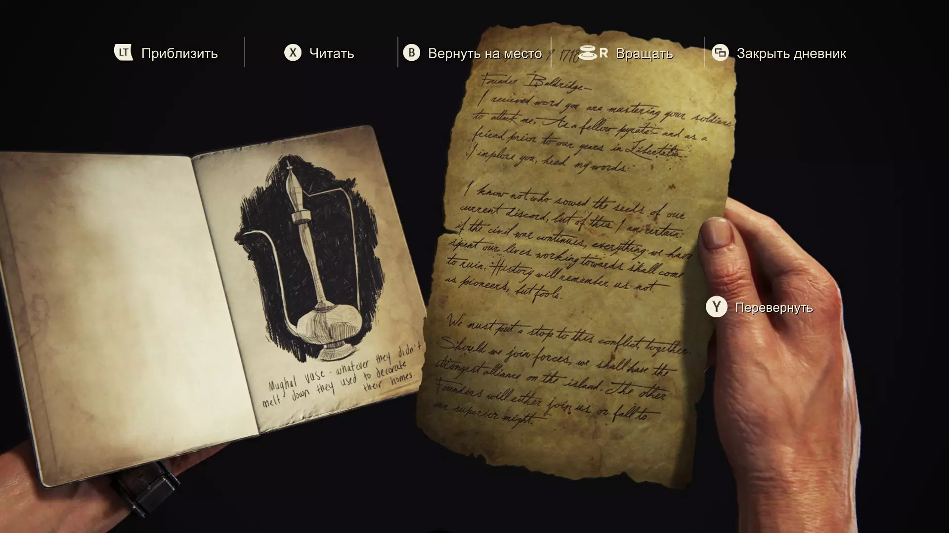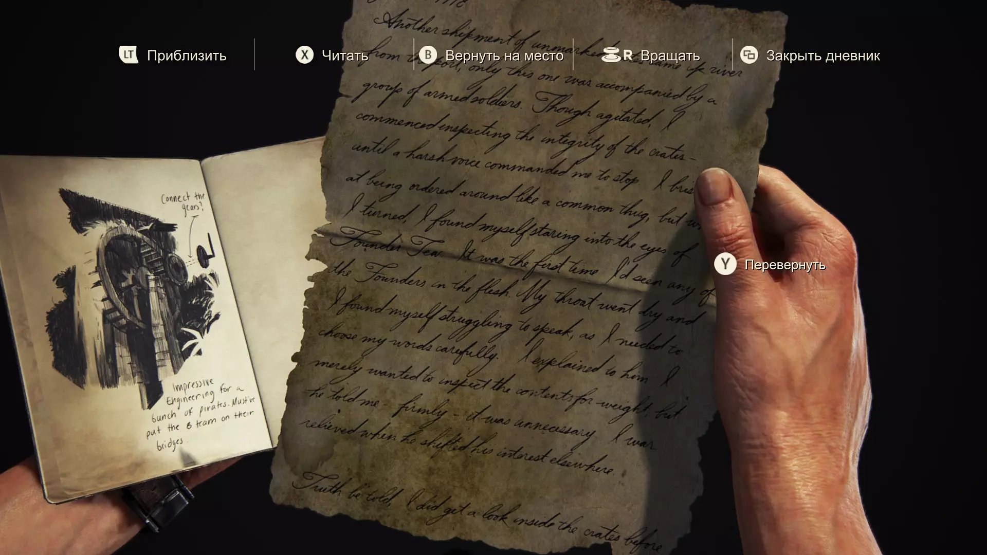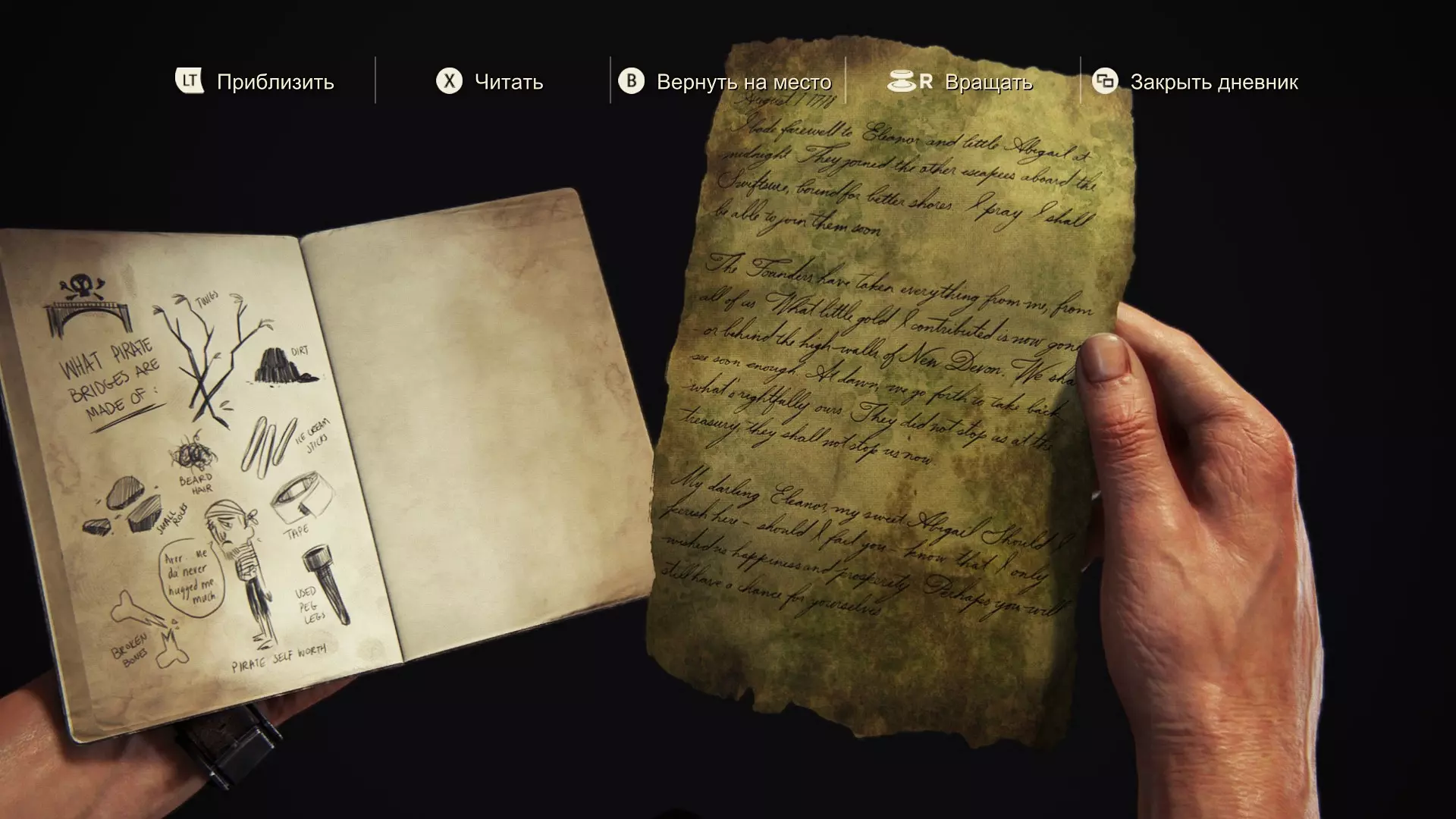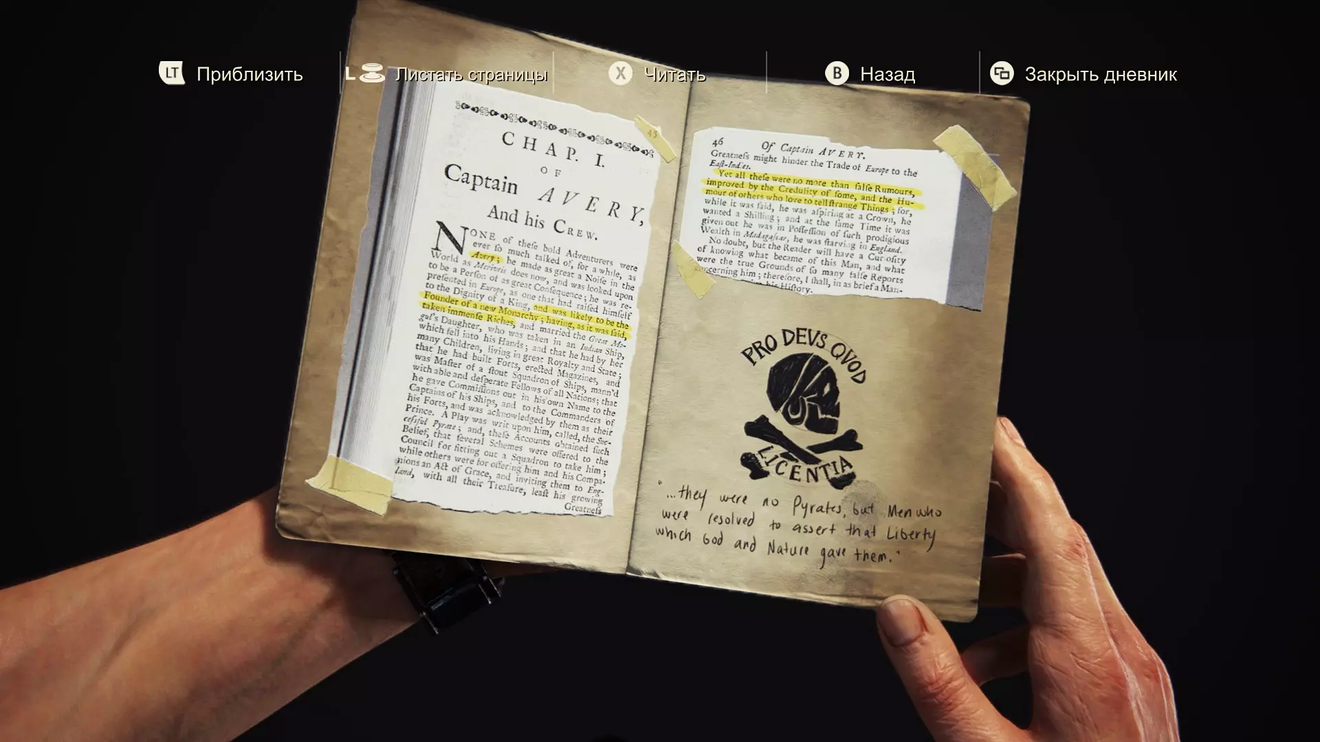 愿上帝宽恕我。他们曾是我的同伴,而我背叛了所有人。 我完全按照那个疯狂的卑鄙小人说的做了。如今我们曾经辉煌的殖民地已成一片废墟,而他却愈发沉浸在自己的妄想中,现在连我也开始用怀疑的目光看待。我肯定是他名单上的下一个。 他曾是我们的船长,而我是副官。这是我努力的成果,利伯塔利娅诞生了,我也会负责守护它的传承。最后的决定权不会在埃弗里手中。明天我会召集大家,彻底结束这一切。一劳永逸。 第93-94页