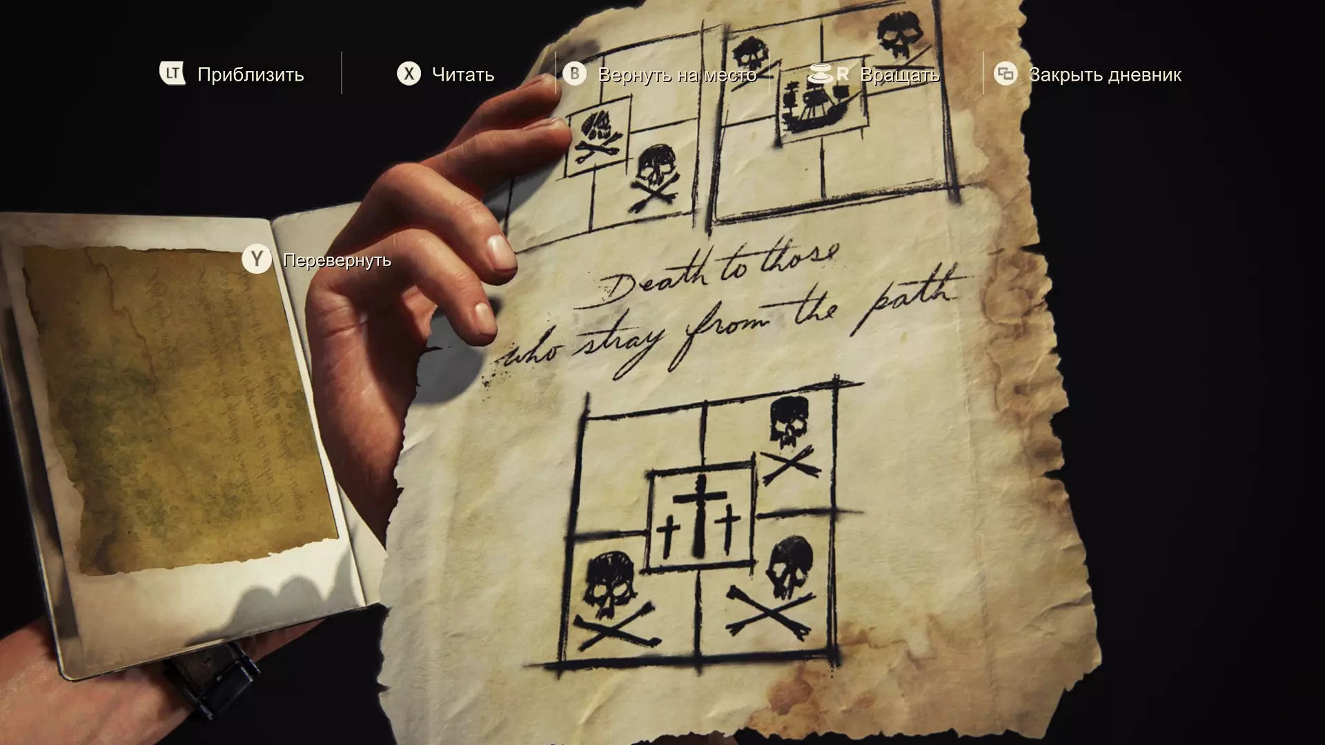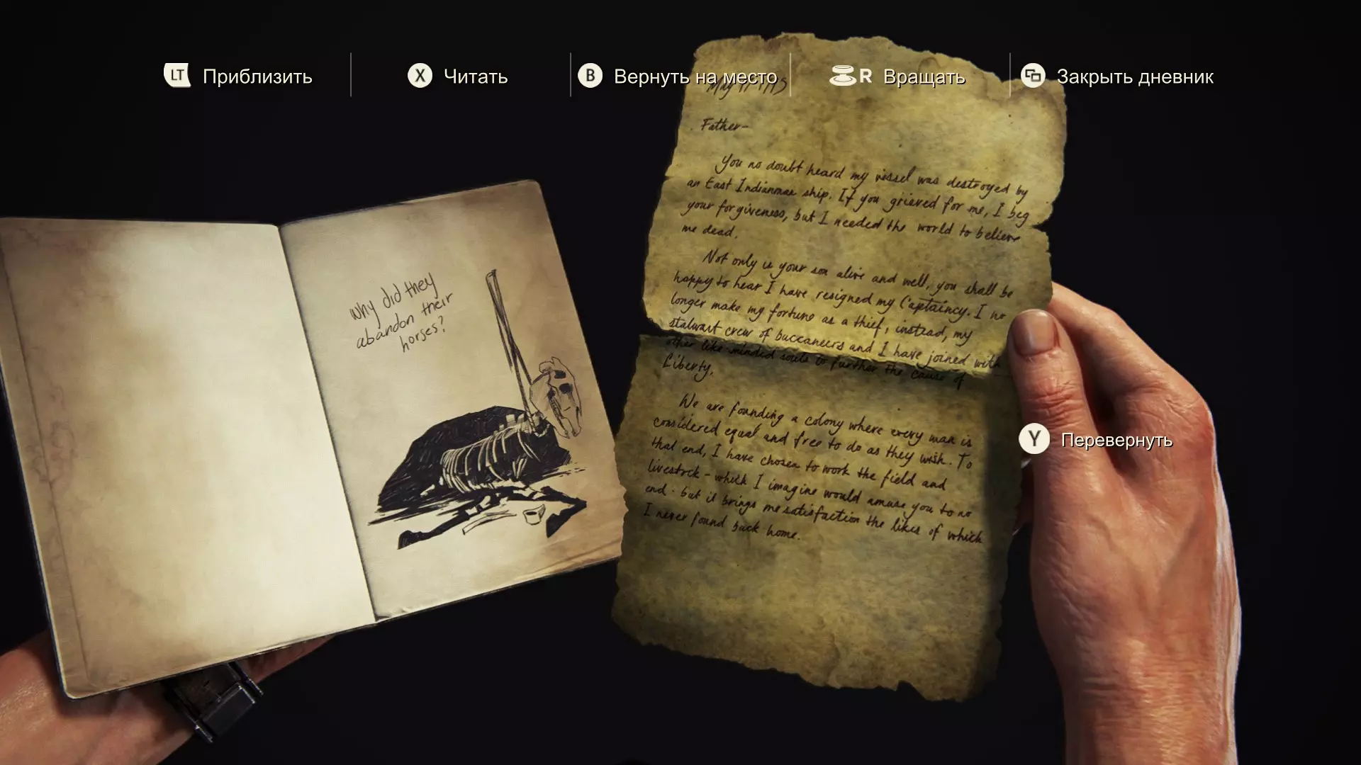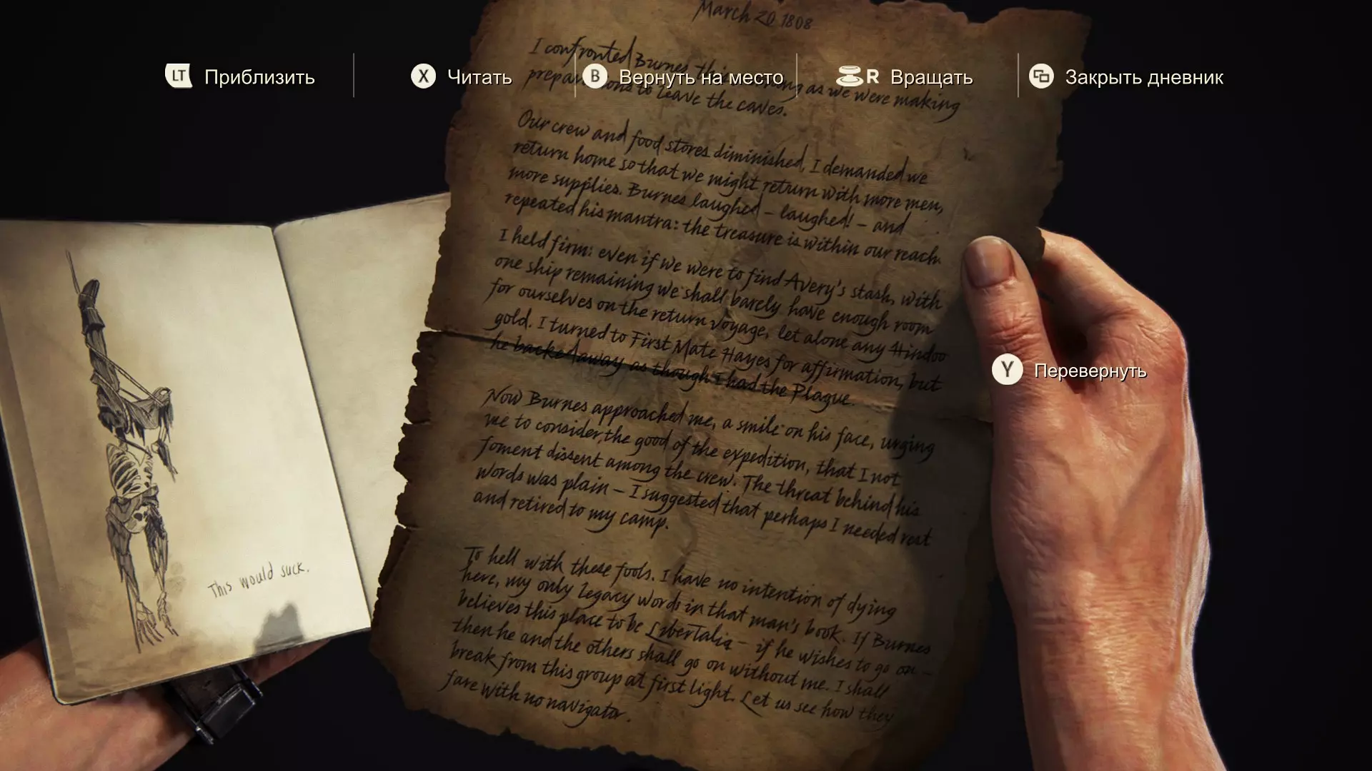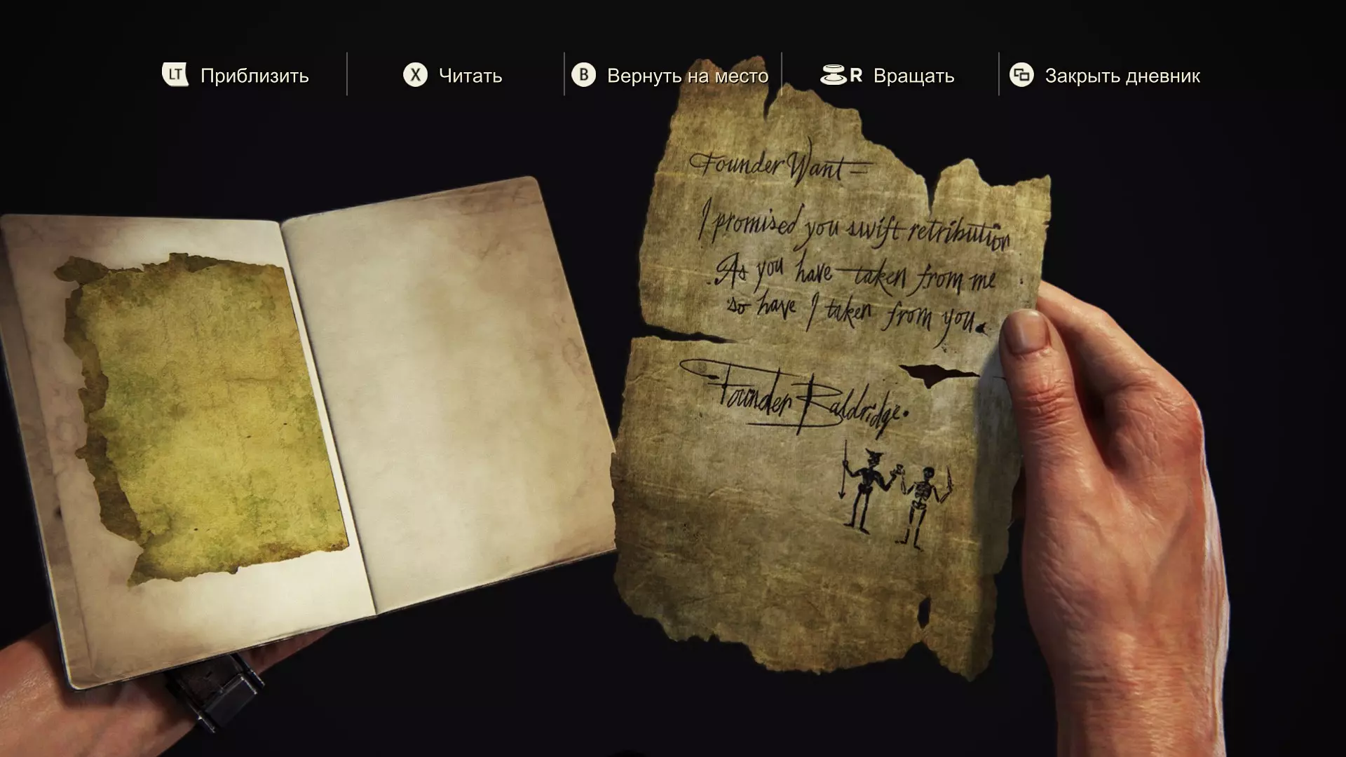 愿上帝宽恕我。他们曾是我的同伴,而我背叛了所有人。 我完全按照那个疯狂的卑鄙小人说的做了。如今我们曾经辉煌的殖民地已成一片废墟,而他却愈发沉浸在自己的妄想中,现在连我也开始用怀疑的目光看待。我肯定是他名单上的下一个。 他曾是我们的船长,而我是副官。这是我努力的成果,利伯塔利娅诞生了,我也会负责守护它的传承。最后的决定权不会在埃弗里手中。明天我会召集大家,彻底结束这一切。一劳永逸。 第93-94页