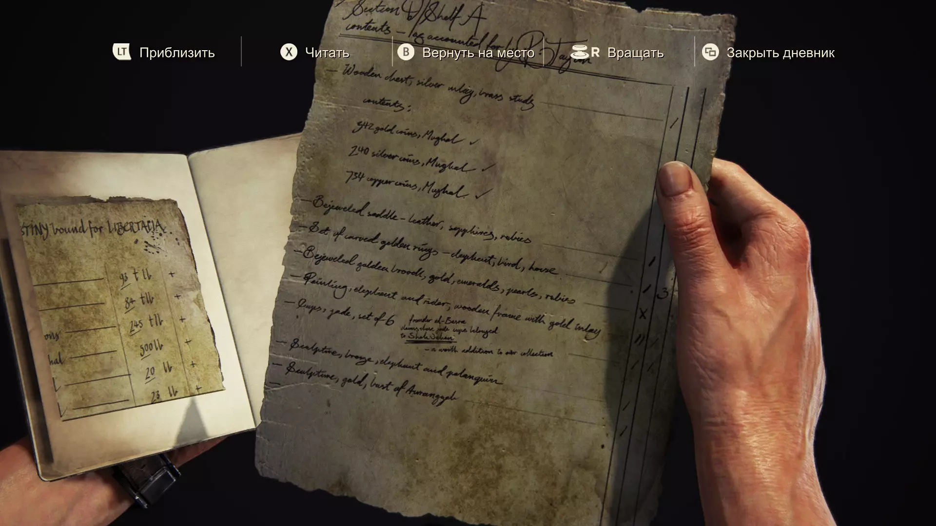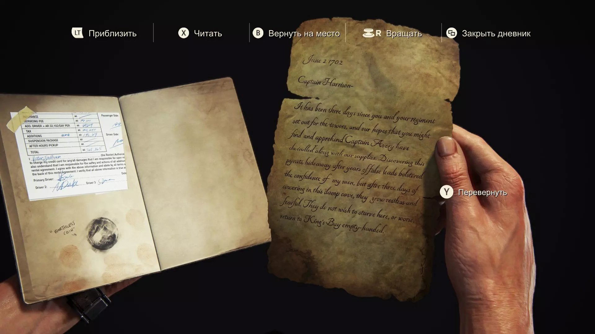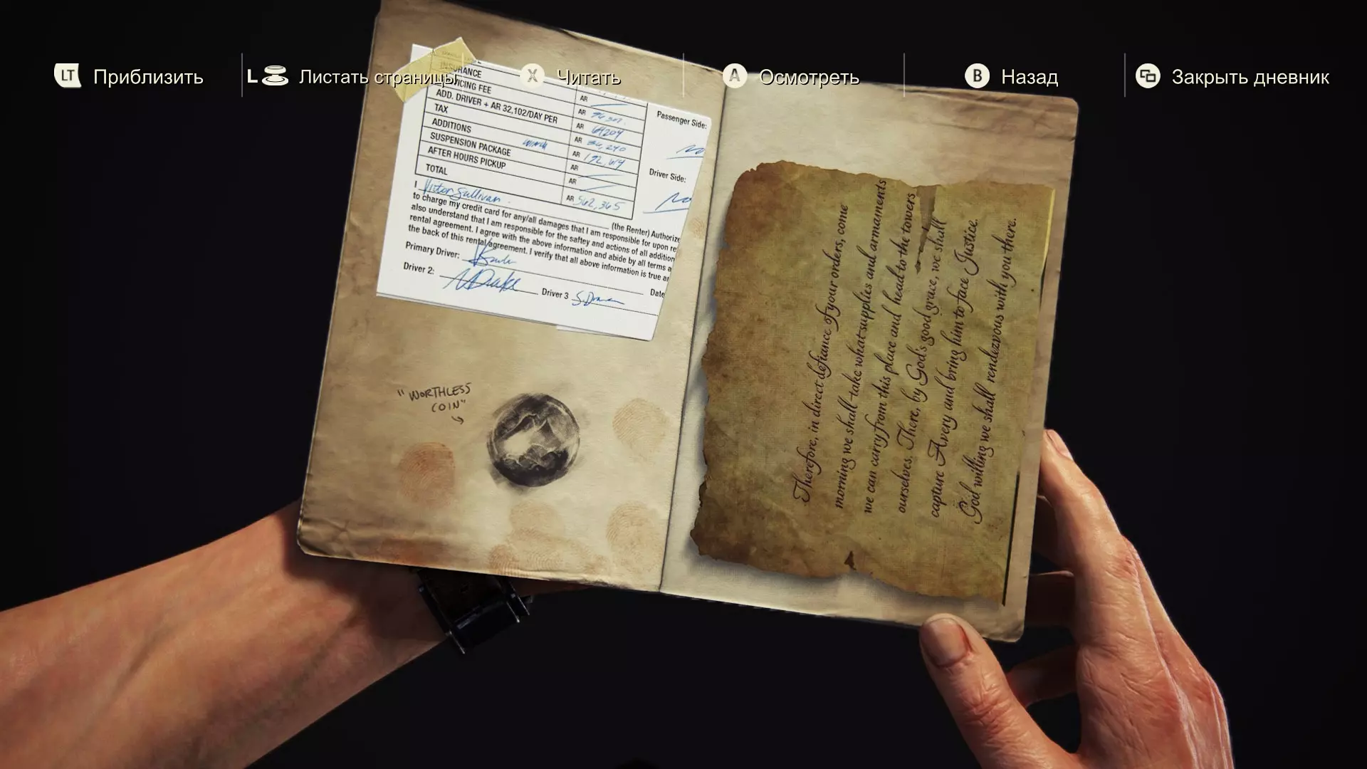 【吉普车租赁收据】 保险:无 服务费:96307 兰(RAN) 额外驾驶员:64204 兰(RAN) 税费:36240 兰(RAN) 附加项目:绞盘:192614 兰(RAN) 悬挂:无 非工作时间配送:无 总计:562365 兰(RAN) 主驾驶员:维克多·沙利文 驾驶员2:内森·德雷克 驾驶员3:山姆·德雷克 【硬币印记】 “无用的硬币”