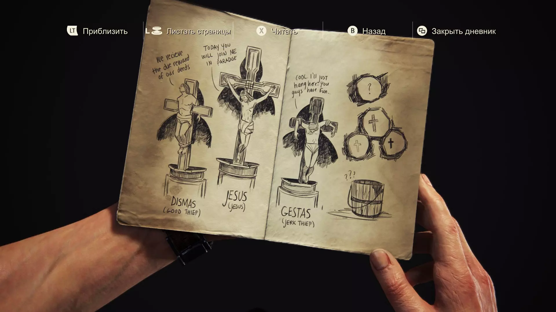 (从左到右,从上到下) 各人将按其行为得到报应。 今日你将与我同在乐园。 伙计们,你们玩得开心,我就先卡在这儿了。 【迪斯马斯(明智的强盗)】 【耶稣】 【盖斯塔斯(疯狂的强盗)】 第19-20页