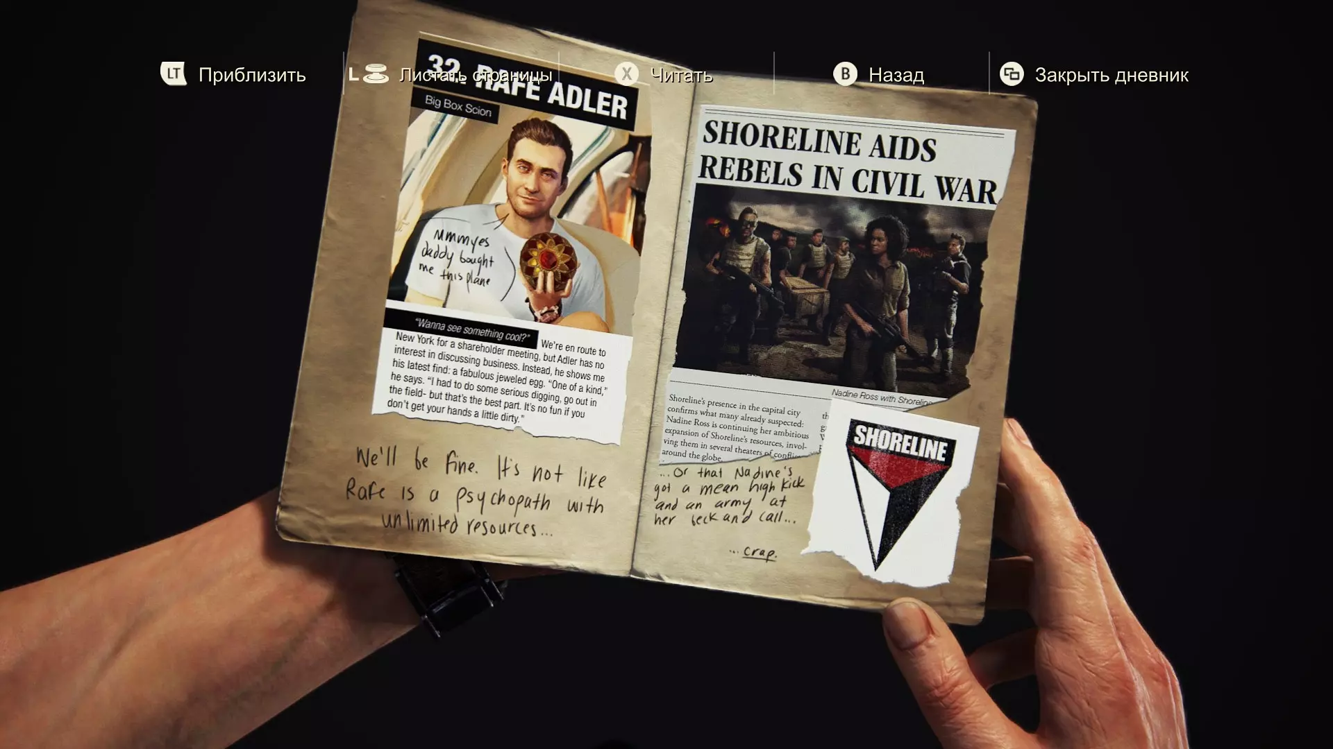 32. 阿德勒的突袭:富有的继承人 “看我找到了什么!”我们要去纽约参加股东大会,但阿德勒不想谈正事。相反,他向我展示了他最近的发现——一枚精美的珠宝蛋。“这可是手工艺品,”他说,“我得亲自‘出马’,在地里好好挖了一通,但这份工作的有趣之处就在于,有时候得把手弄脏一点。”【图片上的文字】 嗯,我爸爸给我买了个小飞机。 【文章下方】 一切都会好起来的。那又怎样,雷夫不过是个拥有无限财力的疯子…… “海岸线”开始向起义者提供援助 雇佣兵“海岸线”抵达首都一事证实了许多人早已猜测的情况:娜丁·罗斯正在继续其雄心勃勃的新市场征服计划,同时在全球多个热点地区部署她的士兵。……或者说娜丁像空手道选手一样手脚并用,而且她还有一支私人军队…… ……该死。 第5-6页