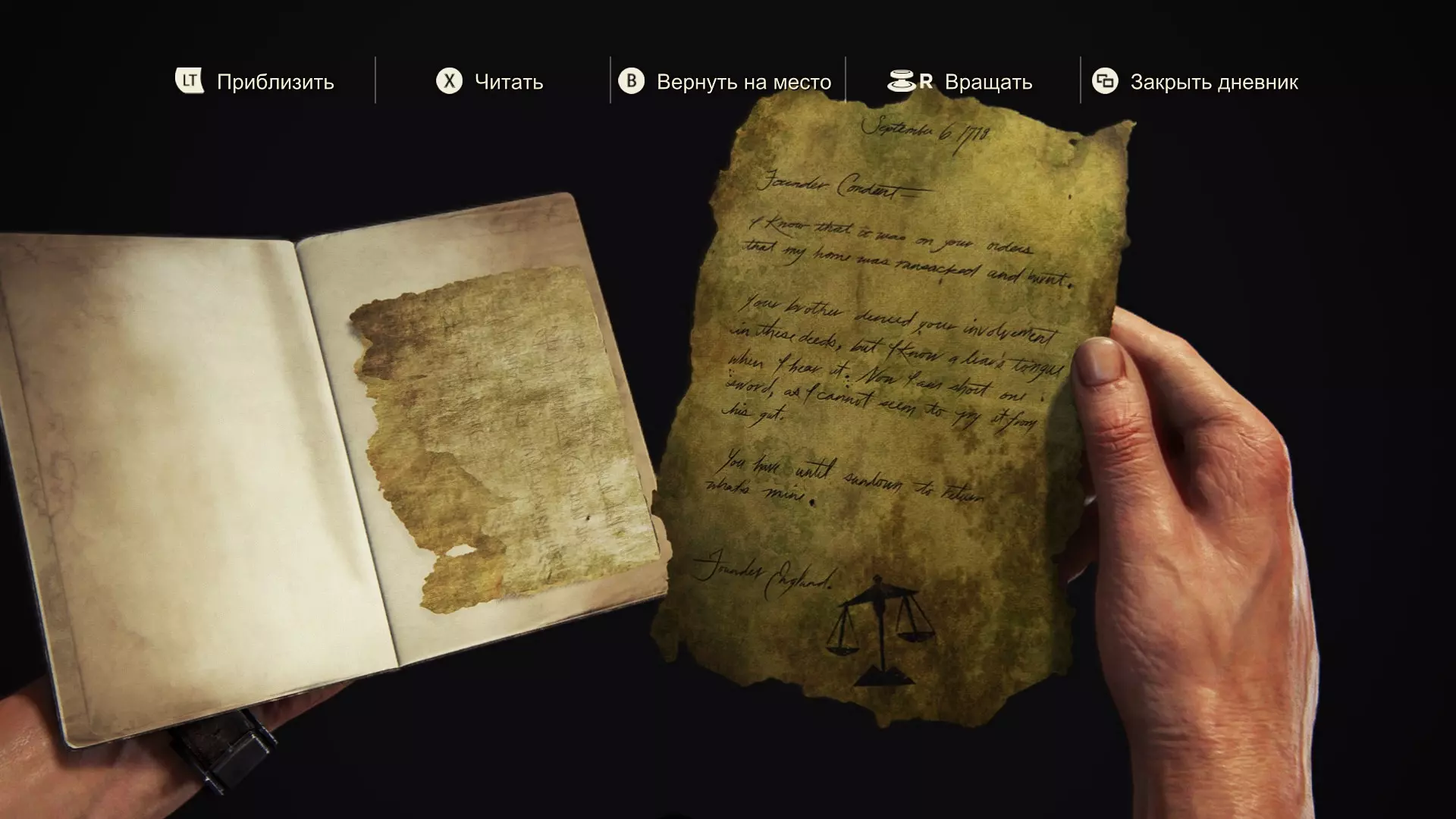 1718年9月6日 康登特创始人 我知道是奉您的命令,我的房子才被洗劫并烧毁。 您的兄弟否认您参与此事,但我能分辨出谎言。现在我需要一把新剑,因为我的剑牢牢卡在了他的内脏里。 我给您时间到日落前,归还理应属于我的东西。 英格兰创始人