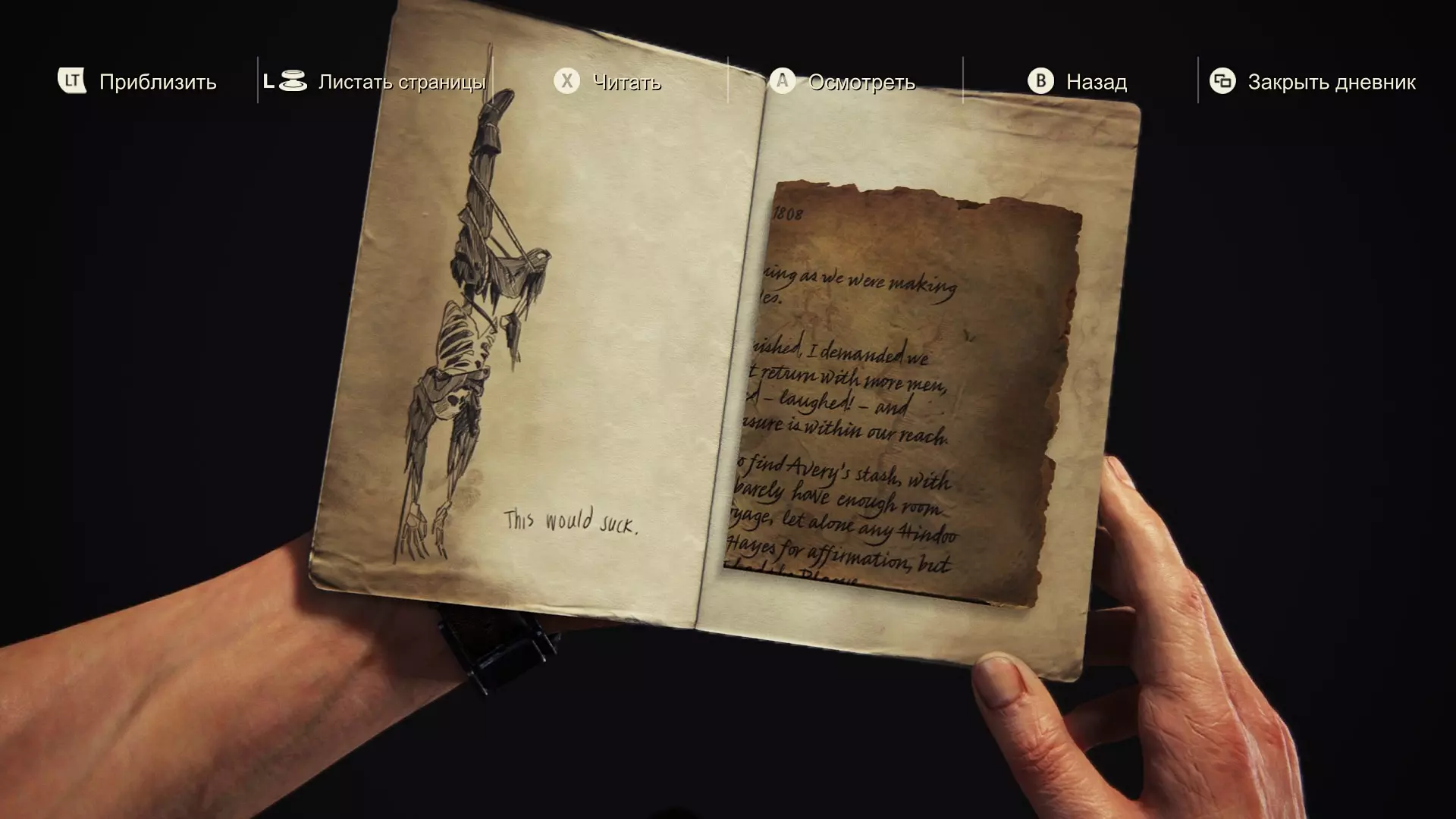巴顿中尉! 埃弗里正准备逃跑。如果我们让他离开这片海岸,他就会永远消失——我们的宝藏也会随之消失。 这把钥匙能打开通往洞穴的大门,但要小心,中尉:毫无疑问,他正等着我们去追捕他。你和你的人搜查隧道时,我会带领一小队人穿过山谷,切断他所有的退路。若主赐予我们胜利,明日黄昏时分,我们将再次成为海盗,满载宝藏驶向未知的海岸。海风会鼓起我们的船帆,我们将自由地过上心中向往的生活。 愿上帝保佑。 托马斯·图船长