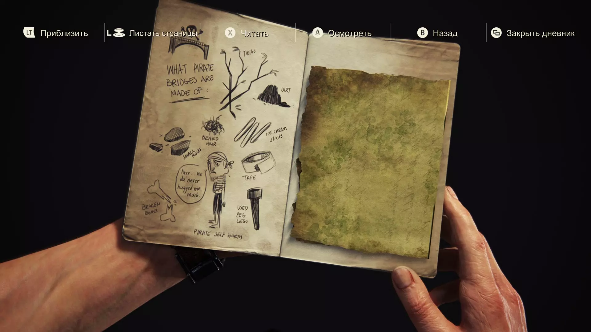 海盗之桥由什么构成: 树枝 泥土 小石子 胡子上的毛发 冰棍棒 绝缘胶带 断裂的骨头 旧木腿 自尊心 “啊——……我爸爸很少抱我。”