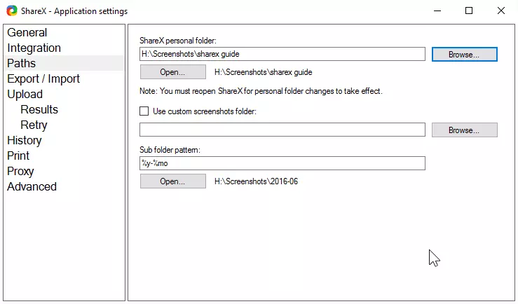 首先,你需要确定截图的保存位置。 打开应用设置,选择路径选项。 然后点击浏览按钮,在任意硬盘上选择你喜欢的位置。 注意:现在你必须关闭并退出ShareX,然后重新打开ShareX,这样个人文件夹的更改才能生效。 只需点击右上角的[x]关闭此窗口即可。 操作完成!