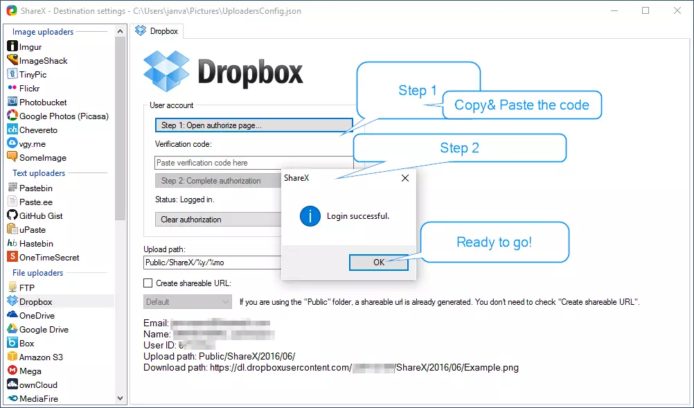 区域(精简):与“区域”功能相同,但不包含额外的视图选项。使用此选项可在屏幕任意位置进行拖动和捕获。 区域(透明):与上述功能类似,仅影响文本的可读性。 多边形:绘制多边形;在不同位置点击三次,所见即所得。 自由手绘:有点不稳定?不建议使用。 上次区域:显示您上次捕获的图片。 屏幕录制:首先需要配置目标设置。在此示例中,我们使用Dropbox。您必须拥有Dropbox用户账户。如果已拥有账户,请在ShareX主菜单中依次进入【目标】>>【目标设置】,选择Dropbox并执行验证。关闭屏幕[X]。然后从ShareX主菜单依次选择【捕获】>>【屏幕录制】。你可以调整屏幕录制的大小;捕获区域下方会显示一个计时器。点击停止后,文件(mp4格式)将保存到你的Dropbox文件夹中。