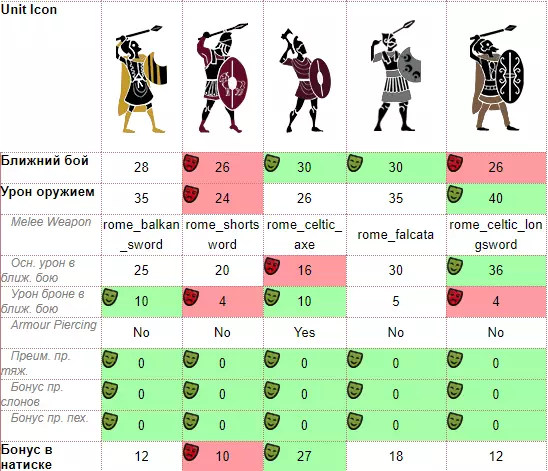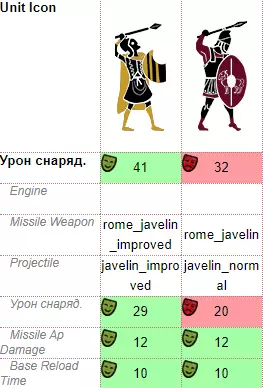 Пробежимся по статам. «Урон оружием». Смотрим на строчку с названием Melee Weapon. Снова видим тут различия. Причем существенные. Оказывается, аж 5 различного рода пельтастов присутствует в игре. Названия строк тут уже представлены думаю в понятном виде (т.к. на русском). Единственное, что строка Armour Piercing – это урон сквозь броню. В общем все, как и с уроном снарядов. Тут на самом деле я и сам для себя открыл кое-что. Во-первых, чем это отличается от строчки выше, ведь переводиться будет одинаково. А во-вторых, где-то написано No, где-то Yes. Как я понимаю – это разрешение на урон сквозь броню, который идет по стандарту, скорее всего что-то типа бонуса у самого оружия. У всех пельтастов он отключен, но агрианского топорника не зря я выделял по-особенному, у него включен этот показатель. В общем добавим ему еще один плюсик в копилочку. Ладно, возвращаемся к нашим слонам, ой т.е. пельтастам. Срвнение в показателях я думаю вы можете проанализировать сами. И сделать вывод, кто лучше для ближнего боя в атаке. Только тут я еще намеренно ввел такие статы как «Ближний бой» и «Бонус в натиске». Оба прямо пропорционально влияют на показатели атаки. Ближний бой – это шанс попадания, а бонус в натиске – это бонус в натиске. В общем чем больше натиск, тем лучше конкретно в период столкновения юнитов друг с другом. По итогу кто сильнее, кто слабее – это уже долгая тема, т.к. я и так затронул тематику типов оружия, которая подходит для отдельного раздела. А ведь еще есть показатели брони, здоровья, щита. В общем, если хотите посмотреть остальные статы представленных пельтастов и покопаться в прочих всякостях, то вот ссылочка https://www.honga.net/totalwar/rome2/units_compare.php?l=ru&v[]=rome2&f[]=rom_getae&u[]=Mer_Thr_Peltasts&v[]=rome2&f[]=rom_carthage&u[]=Car_Libyan_Peltasts&v[]=rome2&f[]=rom_macedon&u[]=Gre_Agrianian_Axemen&v[]=rome2&f[]=rom_masaesyli&u[]=dk_num_heavy_numidian_skirmishers&v[]=rome2&f[]=rom_getae&u[]=Dac_Heavy_Skirm Выделите все, что выделено подчеркнутым курсивом и вставьте в адресную строку в браузере, просто Steam не позволяет почему-то сделать полную ссылку по клику. Кстати говоря сайт очень полезный, в нем прекрасно видны скрытые статы. Хотя можно воспользоваться программой Pack File Manager, но тут, пожалуй, все доступнее или понятнее. Да и с программой надо разбираться, она не для новичков уж точно. Хотя возможно я к ней когда-нибудь притронусь для некоторых гайдов. Краткий вывод по поводу оружий. Помните я писал о том, что Пельтасты порой равны мечникам? Дак вот из предложенных юнитов. Дакийский тяжелый застрельщик имеет тоже самое оружие, что и «Кельтский воин», хотя я взял слишком мелкую сошку для сравнения. Как у Мастеров Меча, что у Свебов, а это на секундочку элитный мечник! Другие сравнения с пельтастами и мечниками делать уже не буду, т.к. боюсь слишком много текста лишнего будет. Но суть вы должны понять. И напоследок по типу оружия – большинство пельтастов имеют тип оружия как у Ливийских пельтастов. А это самый худший меч из всех пельтастов, но тем не менее они вывозят за счет своих остальных характеристик. Опять же броня, здоровья и т.д. Итог один – все они очень хороши в ближнем бою. Применение в бою Теперь поговорим об их использовании. Если говорить о начале схватки, когда у них есть боеприпасы, то это юнит поддержки. Например, вводите своего мечника в бою, встали где-нибудь желательно сбоку, чтобы меньше были урона по своим и пуляете по вражескому мечнику, чтобы ваш быстрее освободился, и в