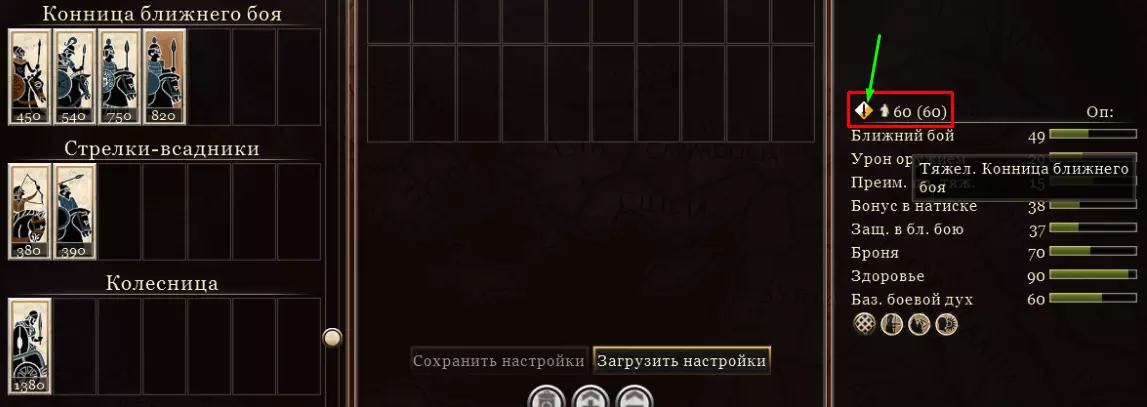 Если вы выбираете какой-то отряд, то справа отображаются его характеристики. А дальше уже наводим свою мышку на указанную стрелочку из скриншота. Нажимать туда не надо, просто наводим и сохраняем местоположение нашего курсора. Теперь распишу краткое сведение о том, что значит тяжесть для конницы (опять-таки тут не буду затрагивать остальные категории юнитов, все строго для кавалерии) и том, как влияет тяжесть на выбор вашего состава. Легкая конница Кратко: Так как этот отряд обладает самым малым весом, то это значит, что он является самым маневренным в игре. Вообще маневренность отражается в таком параметре как скорость, но вес отряда по сути и определяет во многом быстроту самого отряда. Чем выше показатель этого параметра, тем быстрее передвигается кавалерия на поле боя. Ничего сложного. Подробно: Вообще лучше стоит избегать выбор легкой конницы. Потому что игрок, как правило, сохраняет всю свою армию в едином строе. А легкой кавалерии из-за этого просто-напросто не куда будет «влетать» своим натиском. Ведь легкая кавалерия не предназначена для сражения с отрядами не стрелками. А что сделает соперник? Просто будет держать возле своих стрелков кавалерию по тяжести выше чем легкая и ..., вуаля, при любом заходе легкой конницы, вы ее теряете в ближнем бою. Конечно, противник может не успеть увидеть ваш маневр, пропустить натиск по стрелкам с тыла или фронта, но никогда не стоит полагаться на то, что соперник не заметит ваш отряд. Иначе это может обернуться для вас плачевно. Легкая конница поэтому и применяется крайне редко, обычно, если и берется этот отряд, то в количестве 1-2 штуки ну максимум. Если все же и берете ее, то старайтесь ей ловить стрелков, но опять-таки это сложно будет сделать. Также ее можно использовать вторым темпом против вражеской конницы. Например, вы производите натиск своей кавалерией (не легкой), а потом поводите свою легкую конницу (желательное в тыл), тем самым вы и не дадите нормально выйти из-под ближнего боя вражеской кавалерии, а если и зашли в тыл, то и вовсе враг будет окружен и сломлен по морали в кратчайшие сроки. Тут учитывайте, конечно же, против какой конницы вы деретесь. Если это элитная кавалерия, то сокрушить ее будет крайне сложно. Если вы спросите, почему не стоит ей встречать в лоб натиском кавалерию? То ответ прост, при натиске на натиск, легкая кавалерия будет погибать, если она выживает при натиске, то, в последствии, имеет гораздо меньшее количество численности в отряде, а посему и в ближнем бою никуда не годится. Да и сюда стоит приплести еще раз стрелков. Т.к. у нашего героя броня малая, то и какой-нибудь пращник соответственно будет выносить нашу «легкотню» легко! И быстро! Средняя/Тяжелая конница/Очень тяжелая Три «веса» конницы возьму под одну гребенку, потому что функционал их один и тот же, да и принципиальной разницы нет, т.е. если вы и берете «среднюю» конницу, то только из-за вынужденных мер. Либо это ограничение юнитов у самой фракции, либо это вполне нормальная конница из-за своих характеристик. И если у вас остаются деньги, а вы думаете какую конницу взять «Среднюю» или «Тяжелую», то берите тяжелую, если выбор между «Тяжелой» или «Очень тяжелой», то берите очень тяжелую. В общем и целом, данная весовая категория - это и есть ваш основной выбор в коннице, т.к. опираемся на ценник, а он у этой кавал