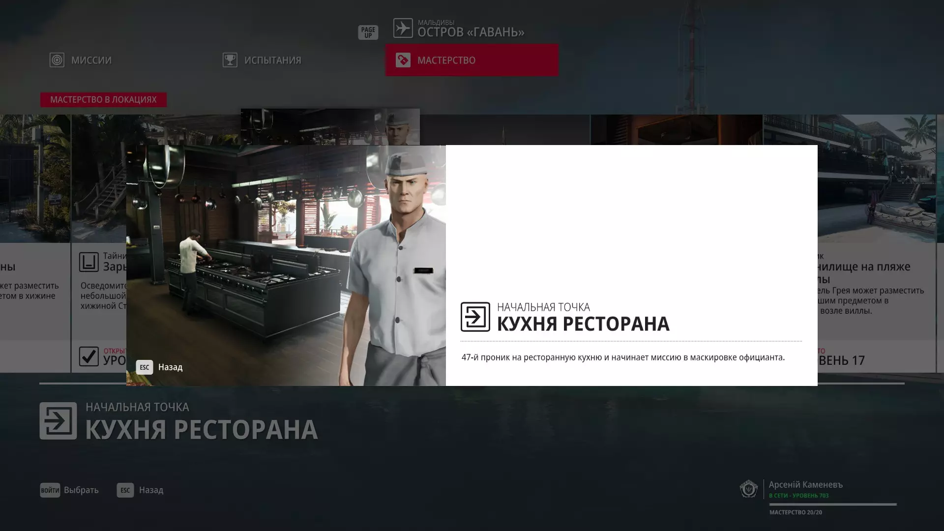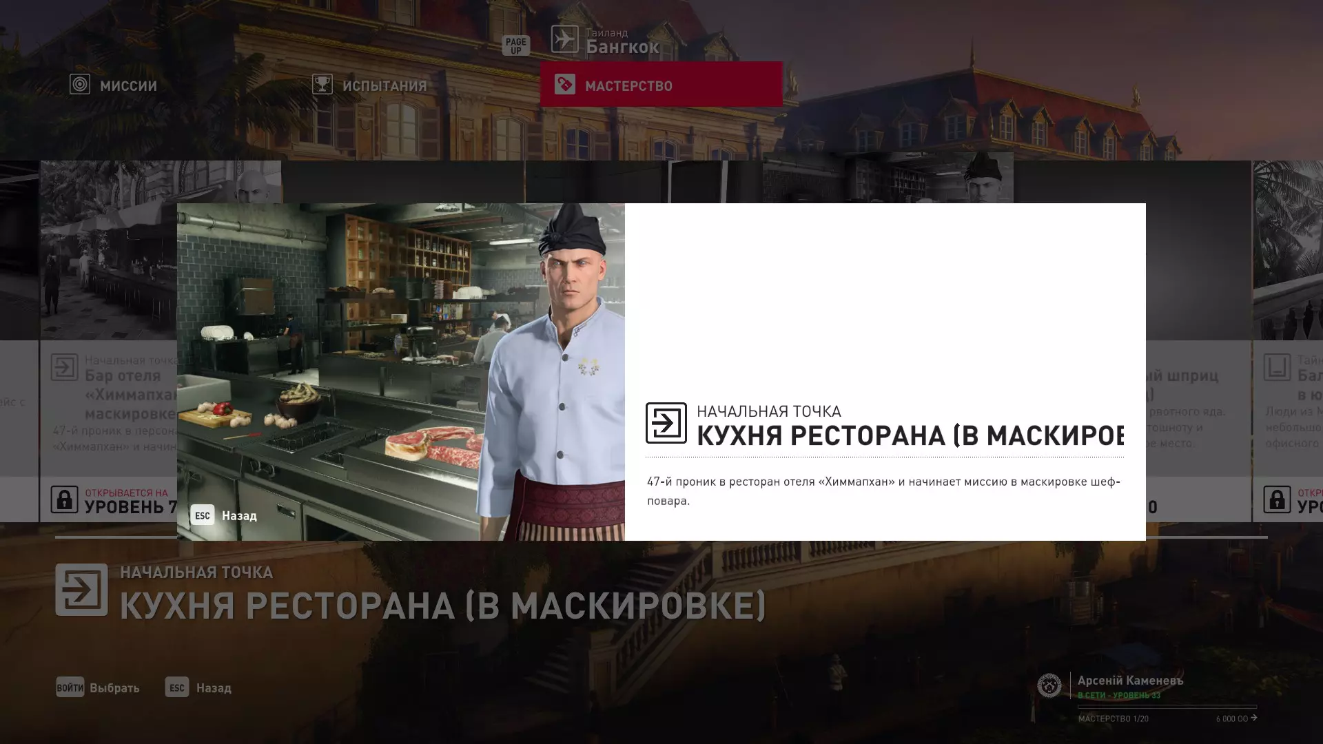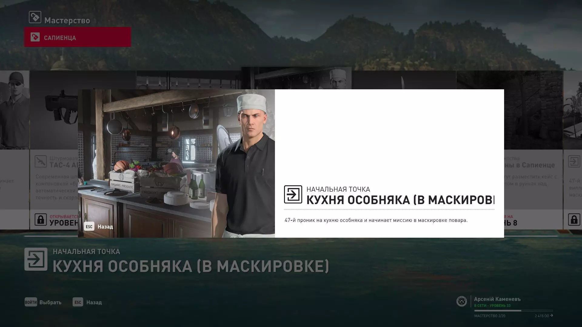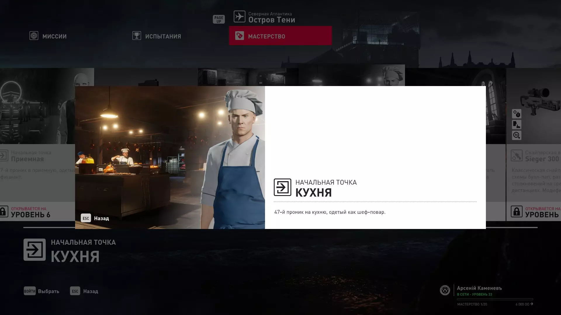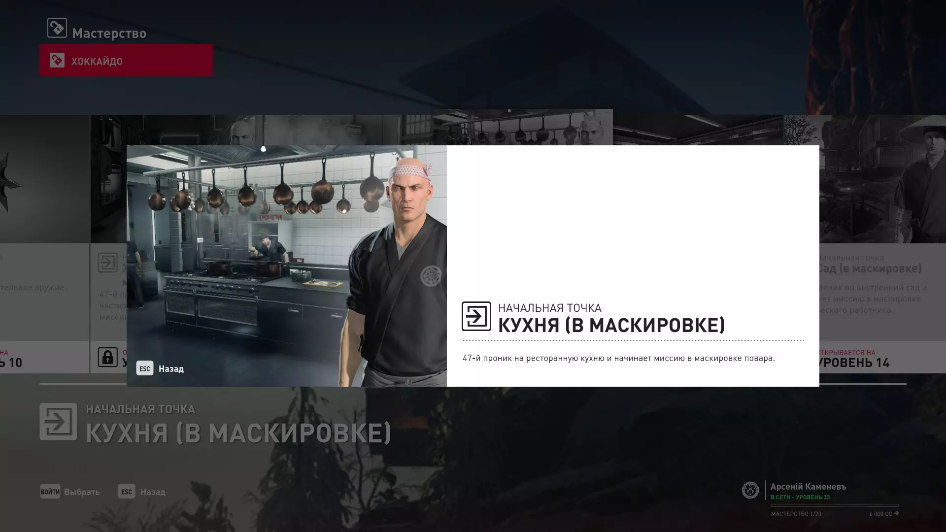 7级熟练度:在厨房的初始位置,伪装成厨师并持有战斗刀
