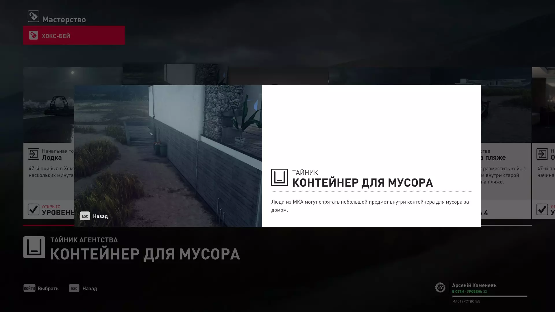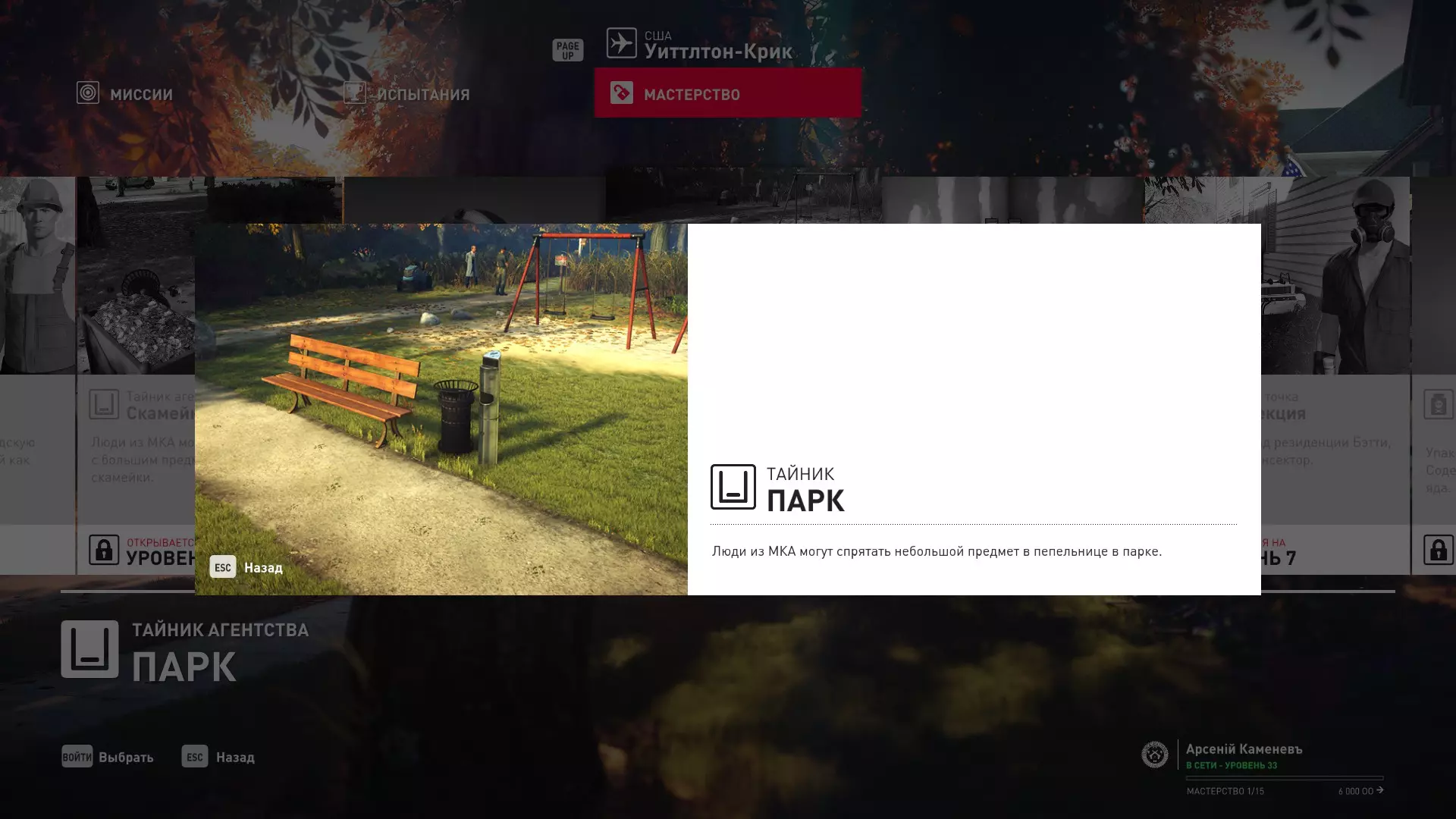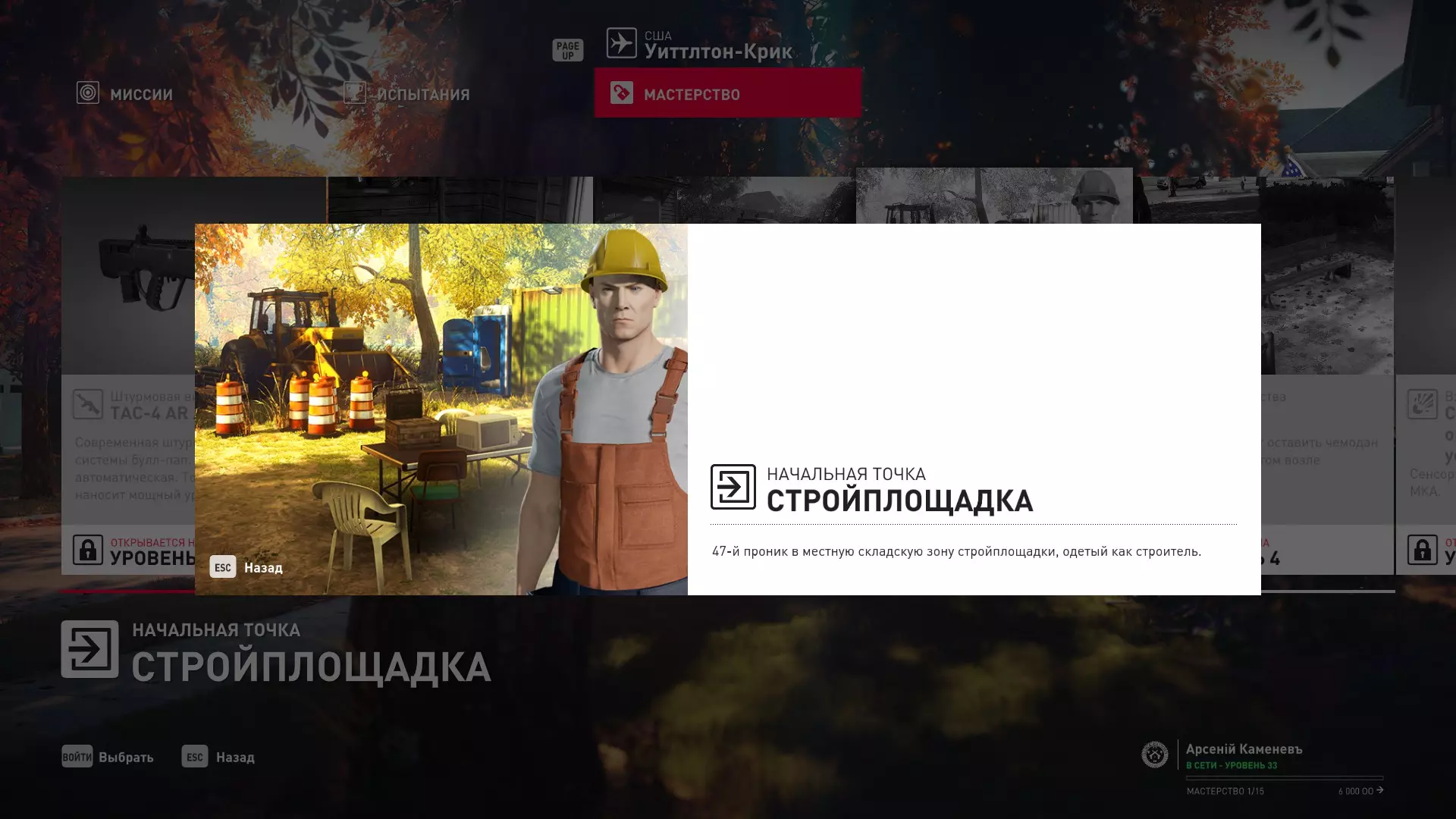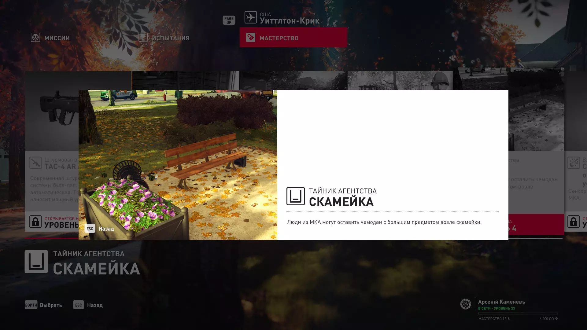 4级熟练度:伪装成建筑工人在建筑工地的初始点,以及长凳旁的MKA藏匿点