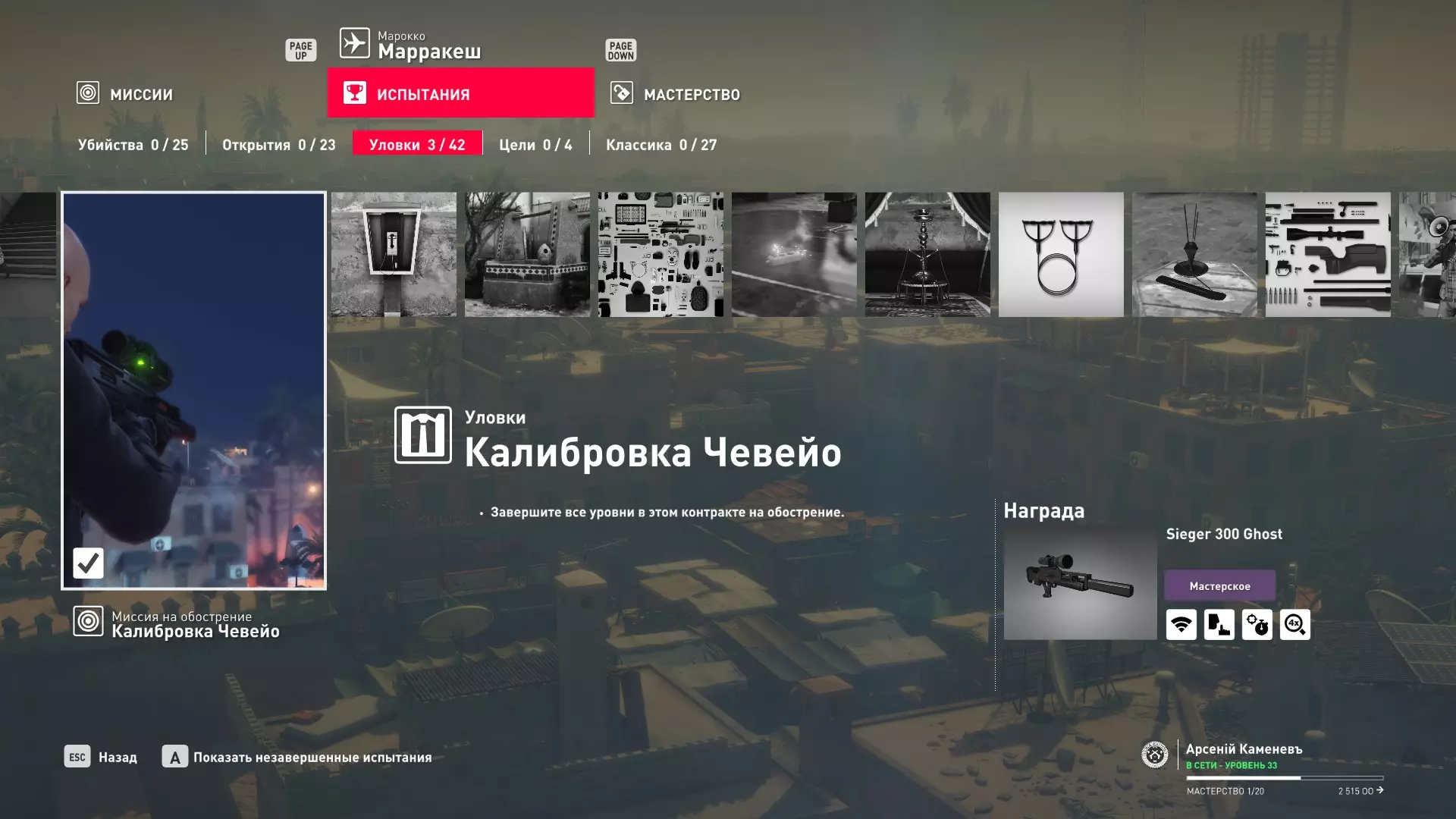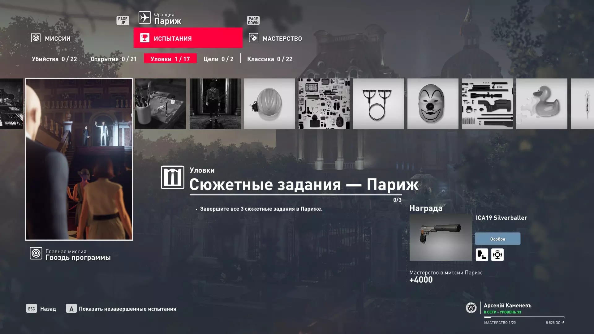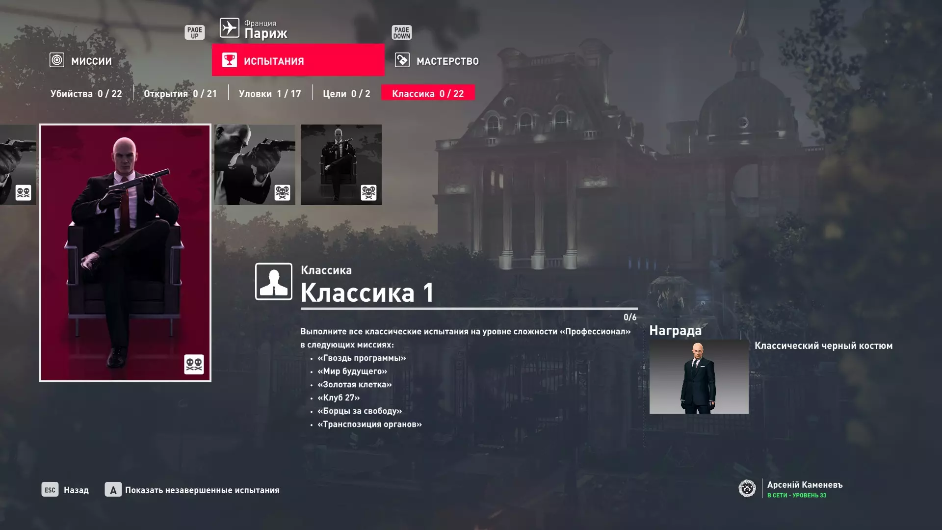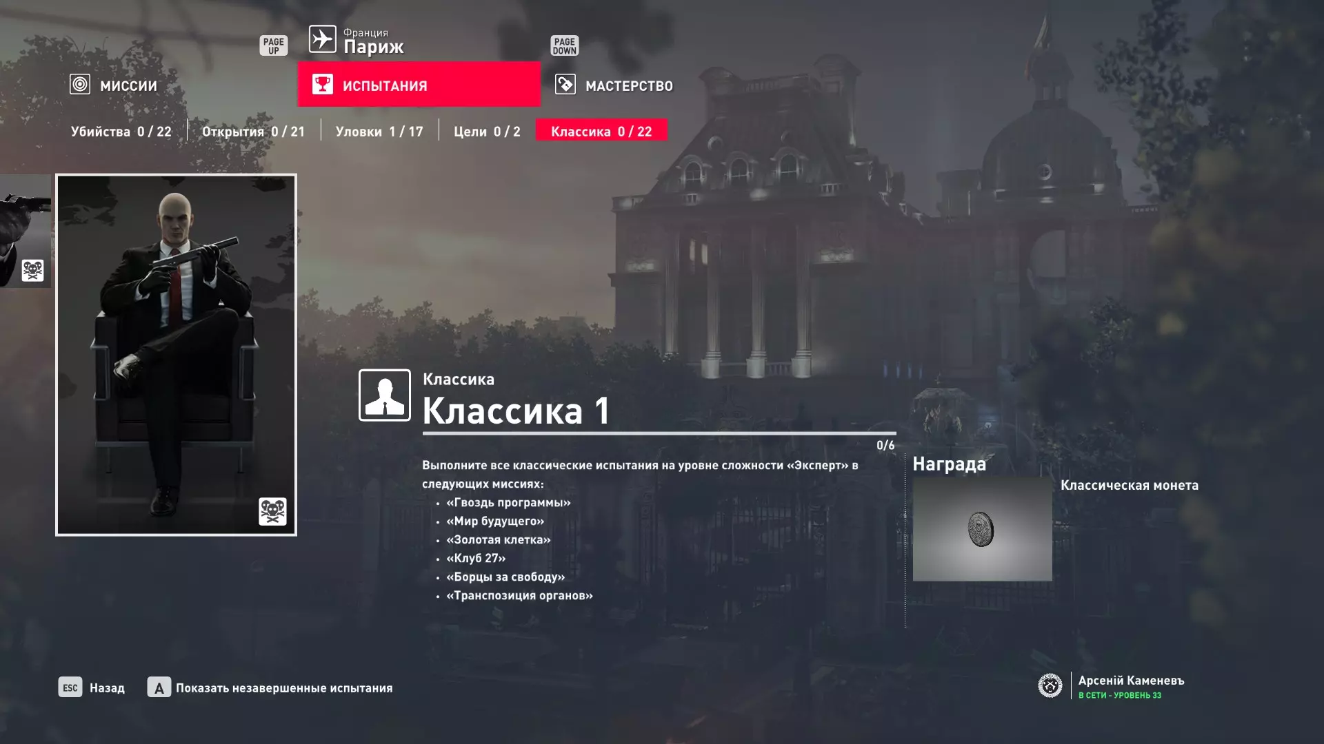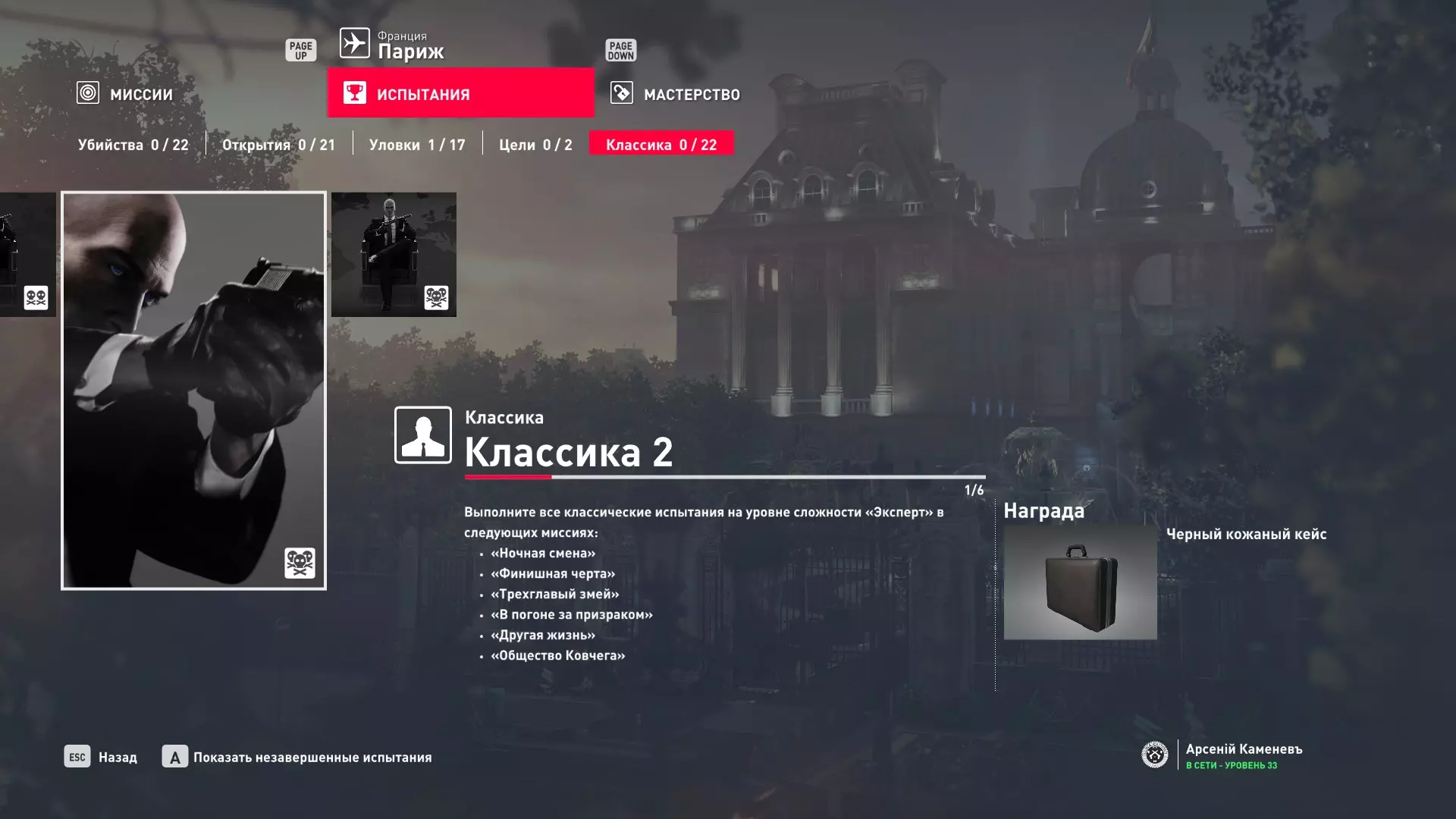 这里提供了关于技能等级奖励、难以捉摸的强化目标和试炼的综合信息。展示了通过游戏可以解锁什么以及如何解锁。信息截至2019年5月3日。 引言 为了方便玩家,我决定制作一份关于所有装备解锁的综合指南。是的,我知道所有信息都可以在游戏内获取,但游戏内的呈现方式不太方便——需要切换到不同页面并滚动水平列表。而这里不仅包含了所有内容,还以更直观的形式呈现。 重要说明 1. 这里仅描述可在游戏内获得的奖励。付费解锁内容不在此讨论范围内(除了GOTY Legacy Pack中包含的通关强化模式奖励)。 2.要完全访问第一季内容,需拥有GOTY Legacy Pack(若您没有《杀手6》)或GOTY Legacy Pack Upgrade(若您拥有《杀手6》但非年度版)。 3. 所有关于第一季内容的信息均适用于第二季推出的Legacy Pack。因此,2016年推出的第一季所有者提出的“内容不符”相关反馈将不予受理。 4.本指南不涉及以技能点形式发放的奖励(因此此处没有关于带有技能点奖励的强化和试炼,以及希姆莱施泰因和汉图港等级的信息,因为这些地方没有装备解锁)。 5. 所有信息均完全基于菜单中的描述。如果您发现这些描述与游戏实际内容不符,请告知我,我会进行修正。 6.第一季挑战奖励的描述基于《杀手6》指南中的现有信息。如果在该版本游戏中获取奖励的方式不同,请告知我。 7. 我不回答关于如何完成某项挑战的问题,因为我自己也不知道如何100%通关游戏。这方面请参考其他指南。 8. 截图中部分解锁内容的名称未完全显示,因为那里有滚动文本。9. 我已经解锁了一些内容,因为我已经开始玩游戏了。因此,有些奖励显示为已获得,有些则显示为正在获取中。 10. 2018版中所有任务和合约的物品栏是通用的。但与2016版游戏没有同步,2016版的玩家需要从头开始玩。试炼与强化 序章与通用试炼 提示:如果一开始就在【专家】或【大师】难度下完成经典试炼,那么较低难度会自动解锁。不同难度的通用试炼内容相同。因此,最合理的做法是在最高难度下完成这些试炼。提示:在【专家】难度下“从零开始”以【沉默刺客】评价完成任务#2,根据附加挑战的完成情况可获得10-12级熟练度(已在巴黎和萨皮恩扎的任务中亲自验证)。