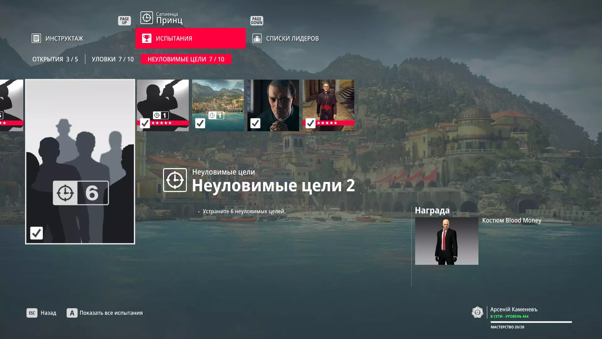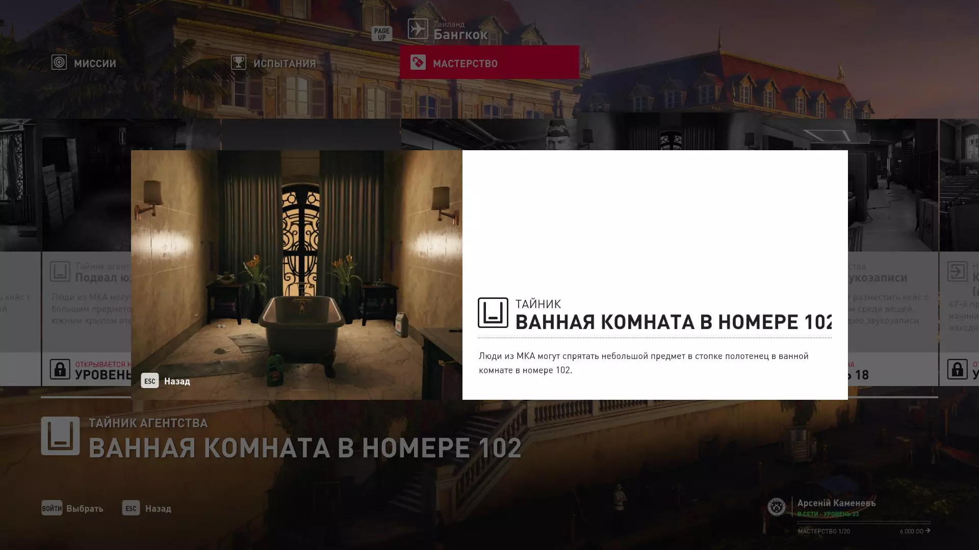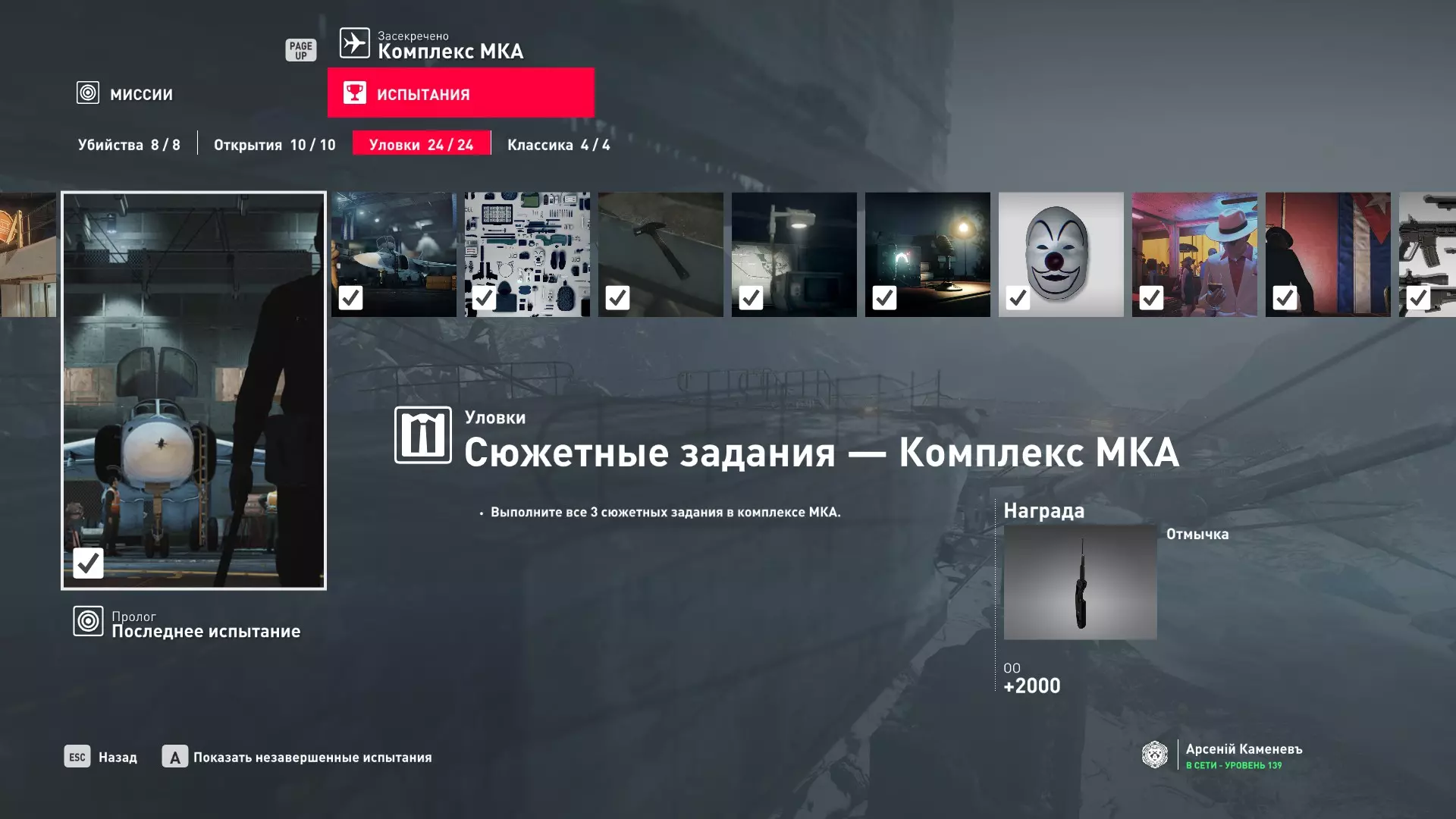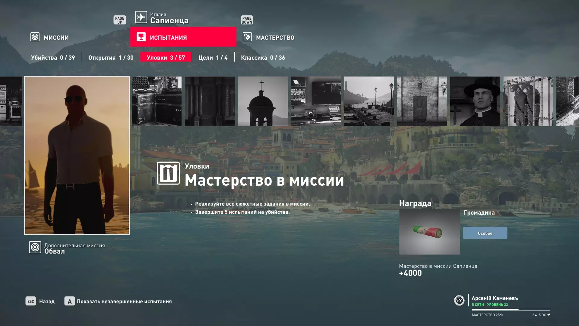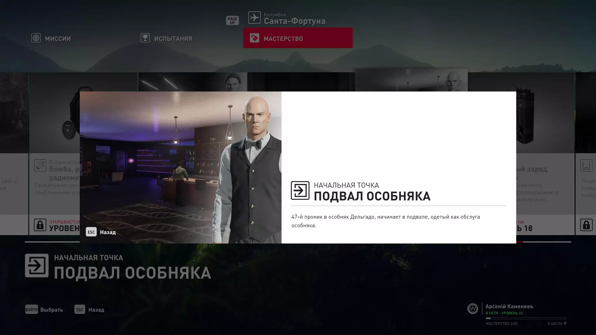 这里提供了关于技能等级奖励、难以捉摸的强化目标和试炼的综合信息。展示了通过游戏可以解锁什么以及如何解锁。信息截至2019年5月3日。 引言 为了方便玩家,我决定制作一份关于所有装备解锁的综合指南。是的,我知道所有信息都可以在游戏内获取,但游戏内的呈现方式不太方便——需要切换到不同页面并滚动水平列表。而这里不仅包含了所有内容,还以更直观的形式呈现。 重要说明 1. 这里仅描述可在游戏内获得的奖励。付费解锁内容不在此讨论范围内(除了GOTY Legacy Pack中包含的通关强化模式奖励)。 2.要完全访问第一季内容,需拥有GOTY Legacy Pack(若您没有《杀手6》)或GOTY Legacy Pack Upgrade(若您拥有《杀手6》但非年度版)。 3. 所有关于第一季内容的信息均适用于第二季推出的Legacy Pack。因此,2016年推出的第一季所有者提出的“内容不符”相关反馈将不予受理。 4.本指南不涉及以技能点形式发放的奖励(因此此处没有关于带有技能点奖励的强化和试炼,以及希姆莱施泰因和汉图港等级的信息,因为这些地方没有装备解锁)。 5. 所有信息均完全基于菜单中的描述。如果您发现这些描述与游戏实际内容不符,请告知我,我会进行修正。 6.第一季挑战奖励的描述基于《杀手6》指南中的现有信息。如果在该版本游戏中获取奖励的方式不同,请告知我。 7. 我不回答关于如何完成某项挑战的问题,因为我自己也不知道如何100%通关游戏。这方面请参考其他指南。 8. 截图中部分解锁内容的名称未完全显示,因为那里有滚动文本。9. 我已经解锁了一些内容,因为我已经开始玩游戏了。因此,有些奖励显示为已获得,有些则显示为正在获取中。 10. 2018版中所有任务和合约的物品栏是通用的。但与2016版游戏没有同步,2016版的玩家需要从头开始玩。试炼与强化 序章与通用试炼 提示:如果一开始就在【专家】或【大师】难度下完成经典试炼,那么较低难度会自动解锁。不同难度的通用试炼内容相同。因此,最合理的做法是在最高难度下完成这些试炼。提示:在【专家】难度下“从零开始”以【沉默刺客】评价完成任务#2,根据附加挑战的完成情况可获得10-12级熟练度(已在巴黎和萨皮恩扎的任务中亲自验证)。
