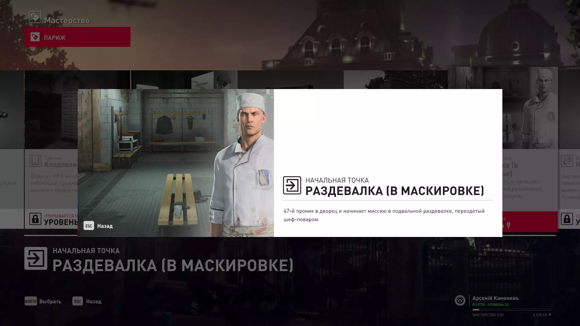 9级熟练度:伪装成厨师在更衣室的初始位置
