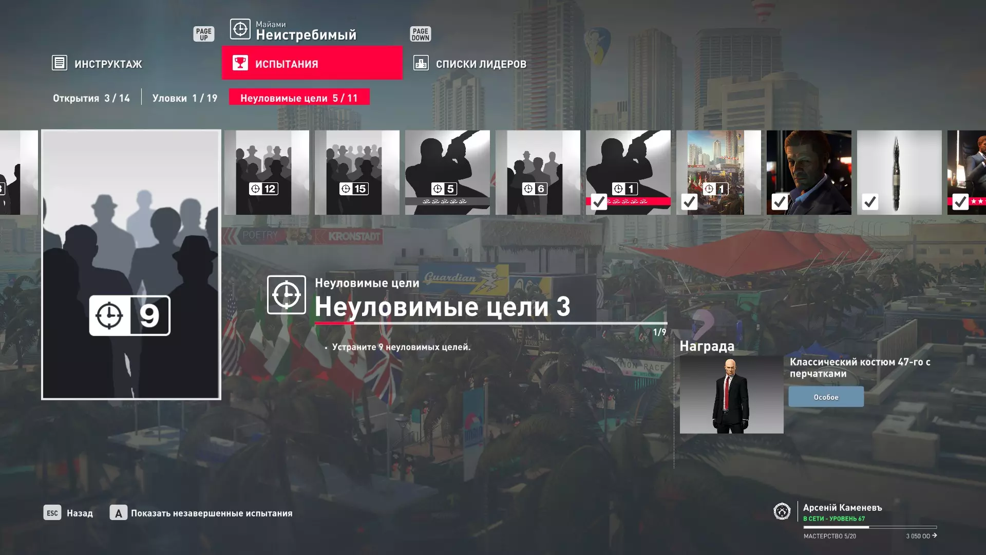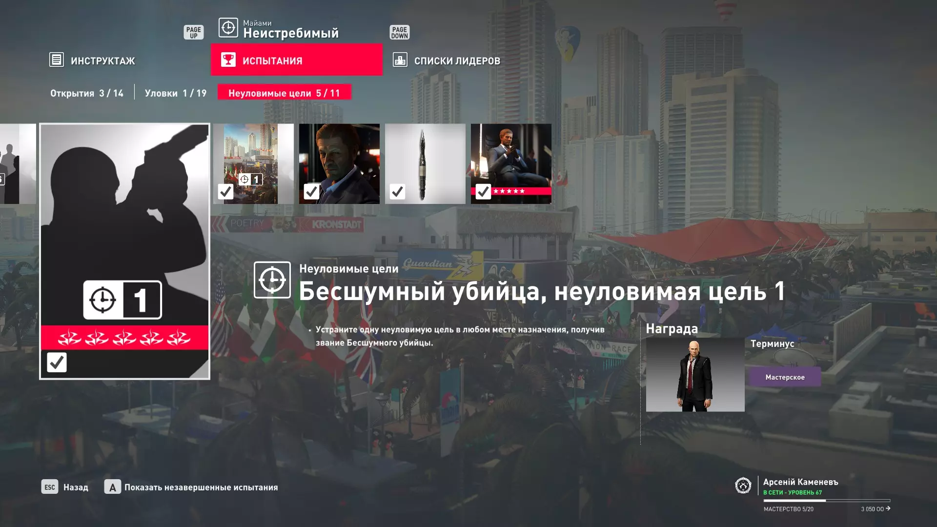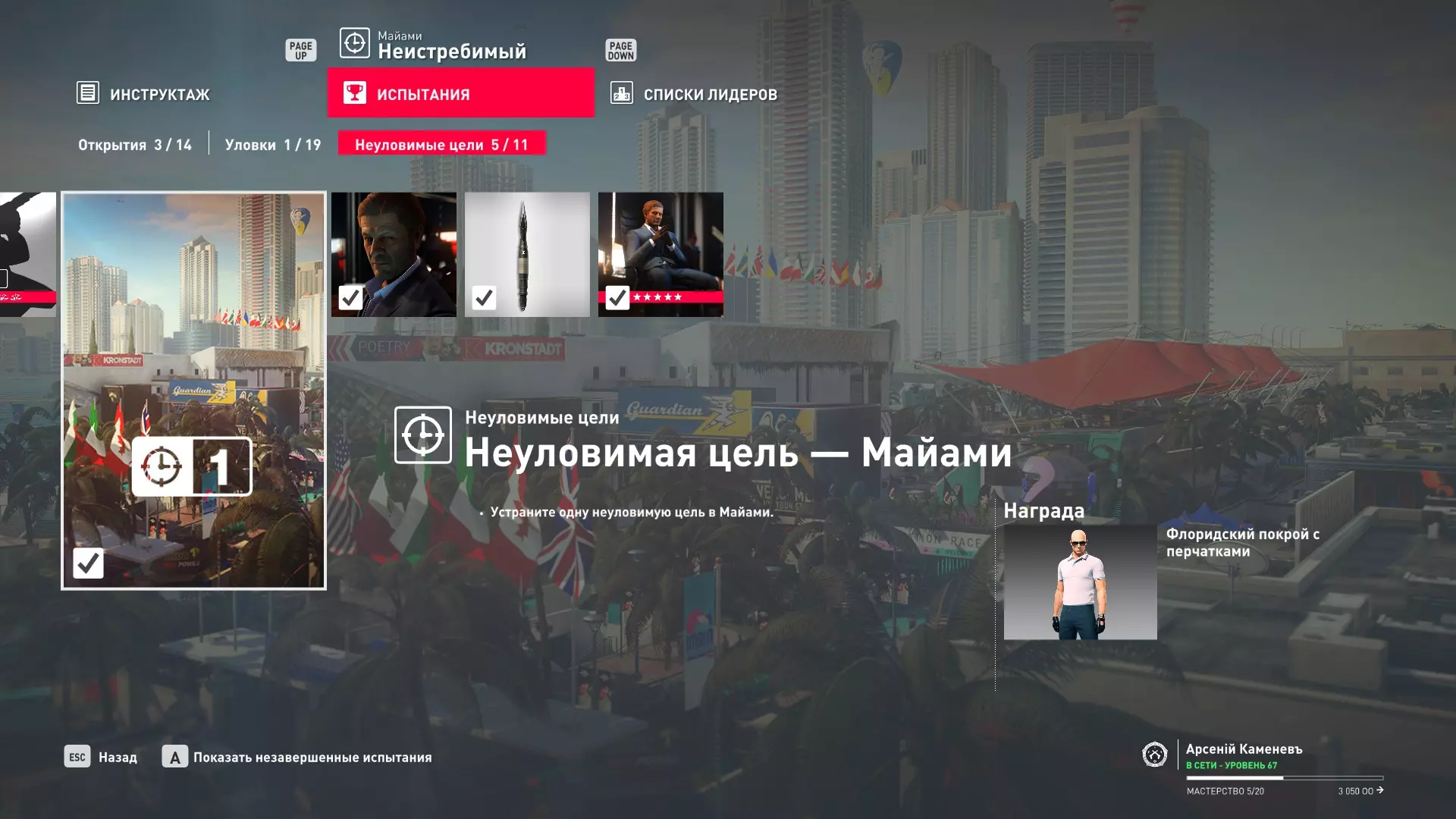 试炼:难以捉摸的目标 - 迈阿密 描述:在迈阿密消灭一个难以捉摸的目标 奖励:佛罗里达伪装与手套