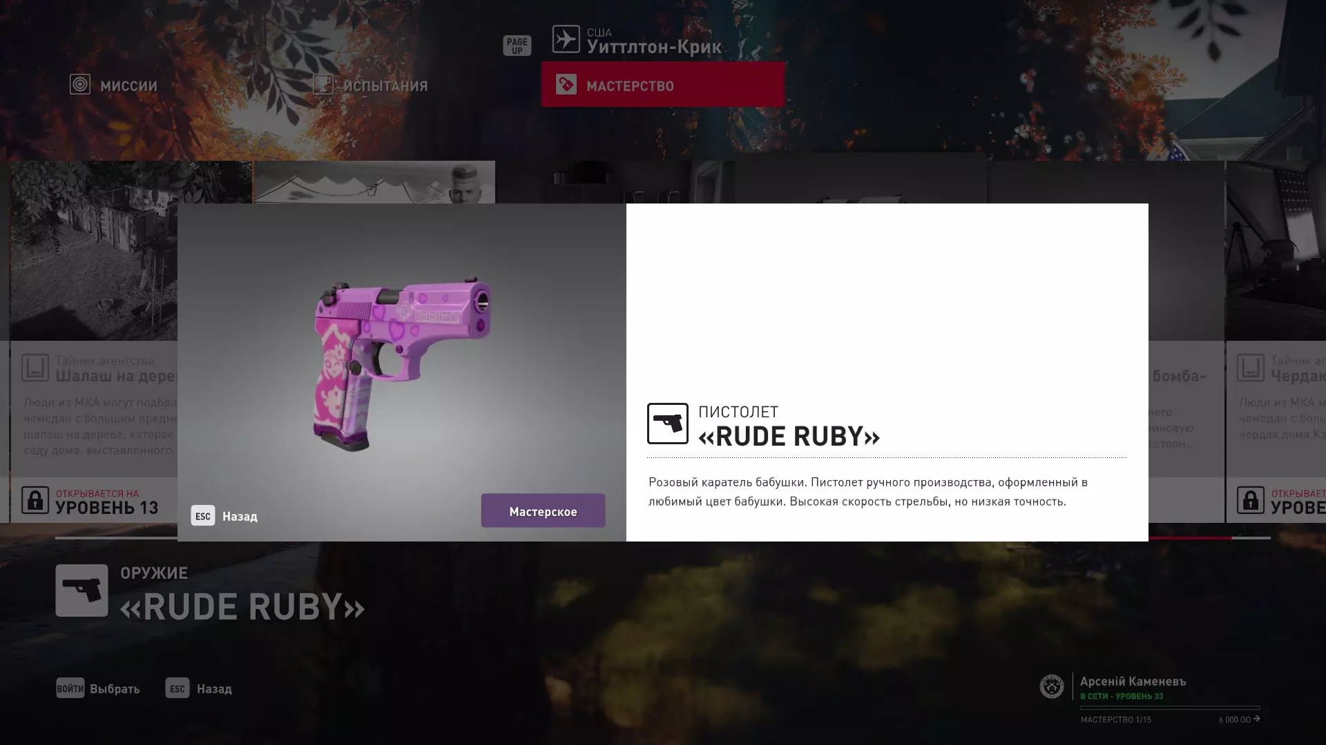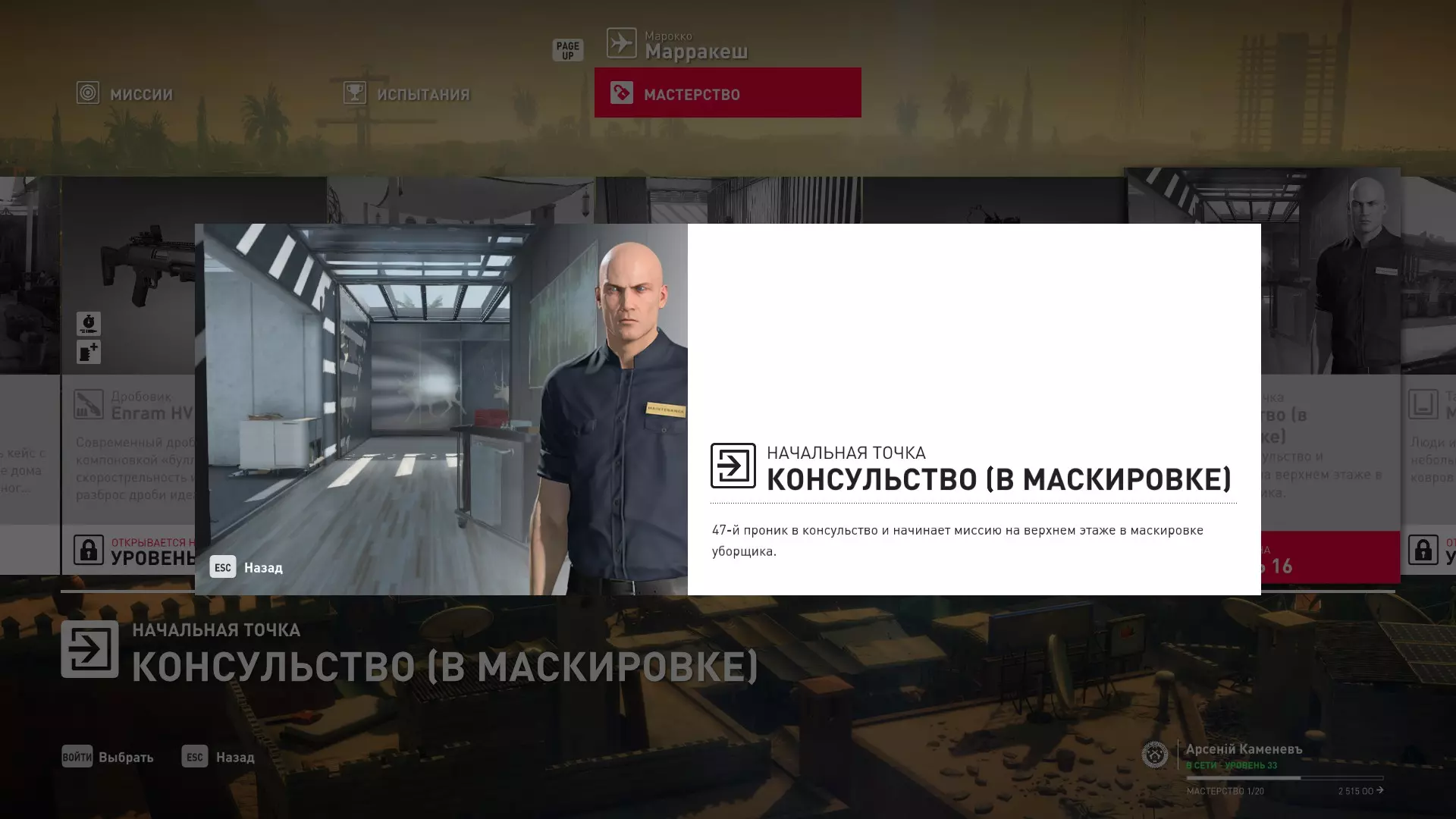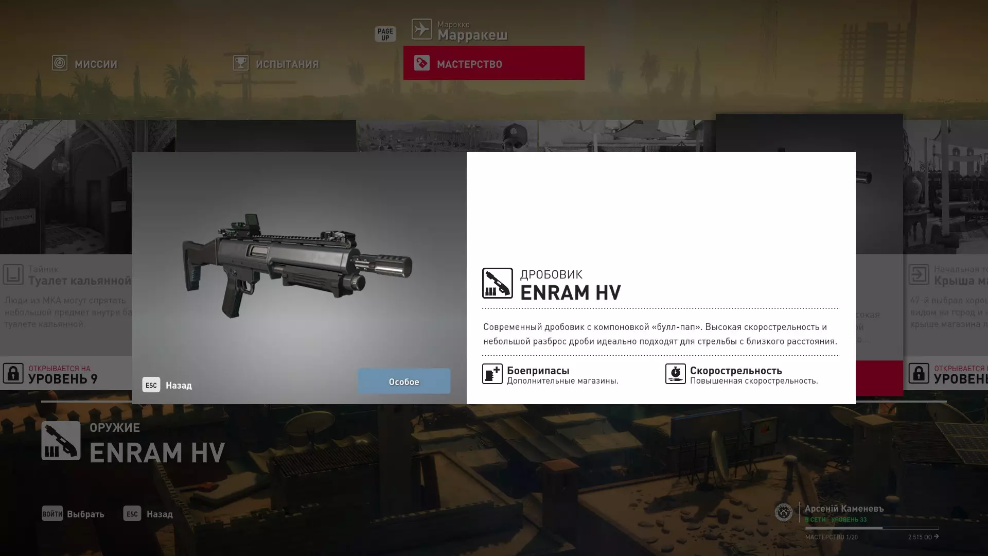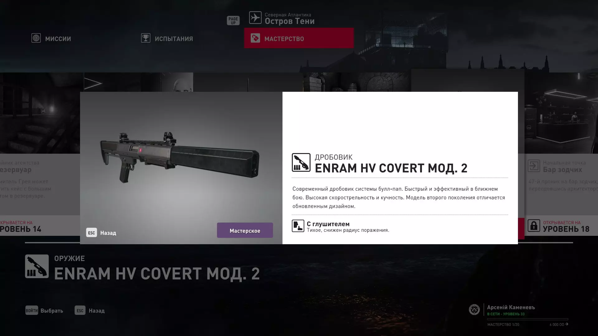 17级熟练度:无 18级熟练度:霰弹枪Enram HV Covert mod.2以及建筑师伪装下在工匠酒吧的初始出生点