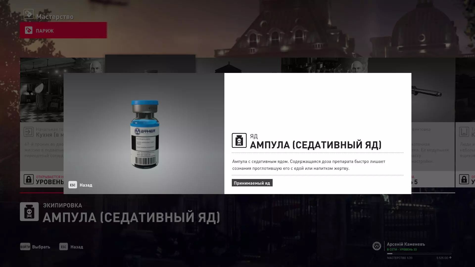 技能等级 第一季 巴黎 2级技能:厨房起始点,伪装成服务员,配备镇静剂(安眠药)安瓿