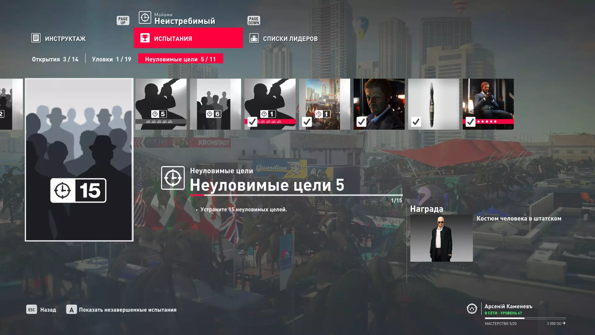 试炼:难以捉摸的目标5 描述:消灭15个难以捉摸的目标 奖励:西装人服装