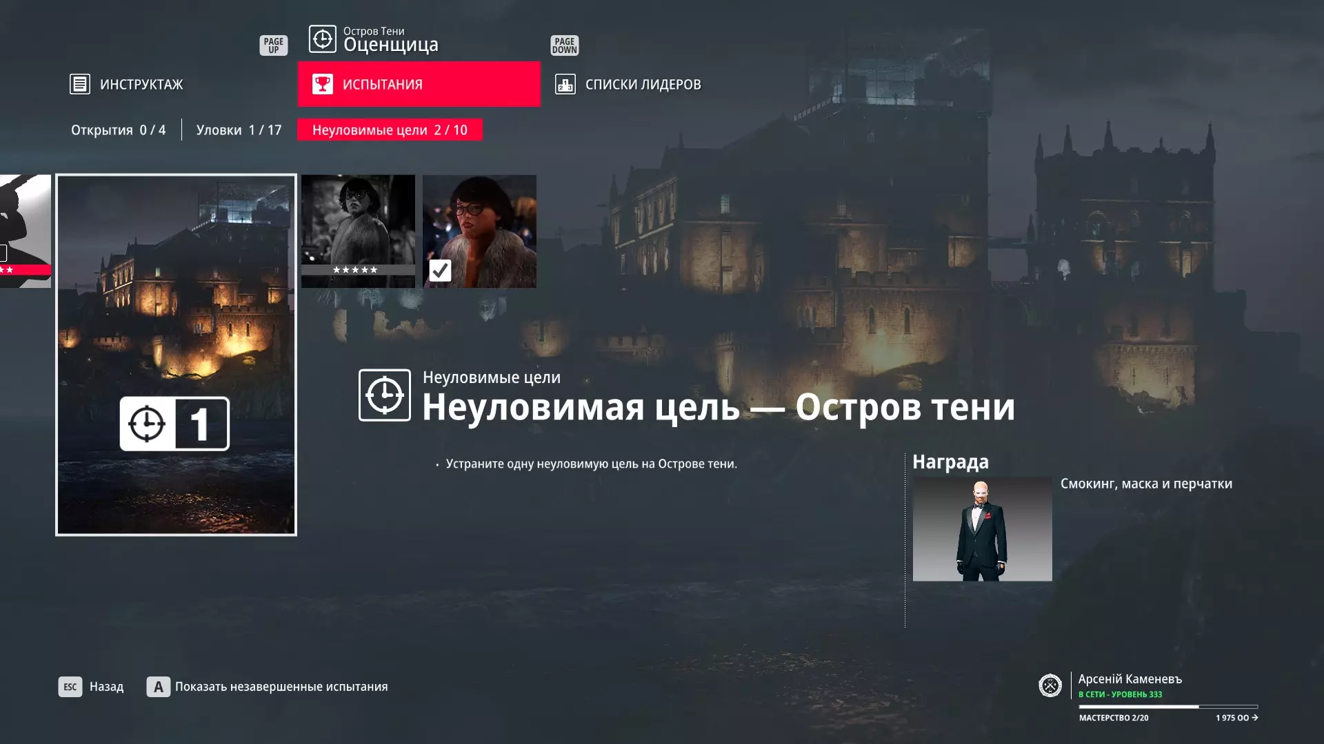 试炼:难以捉摸的目标 - 暗影岛 描述:在暗影岛上消灭一个难以捉摸的目标 奖励:西装、面具和手套