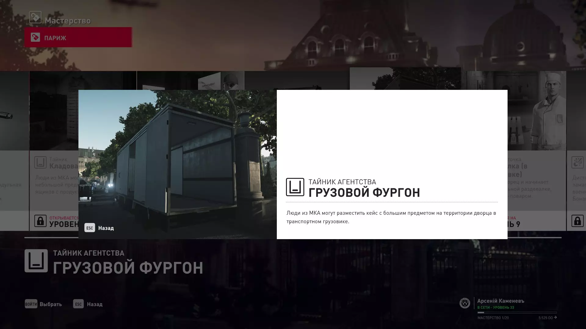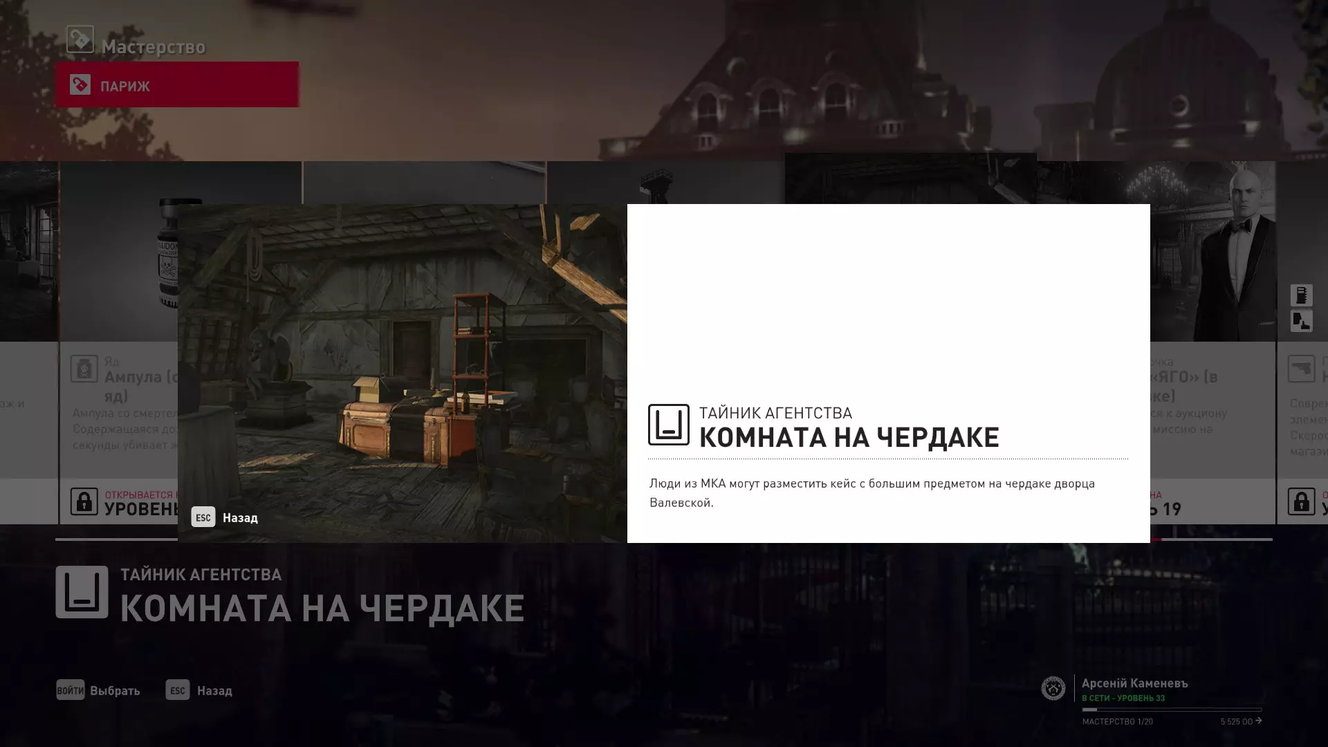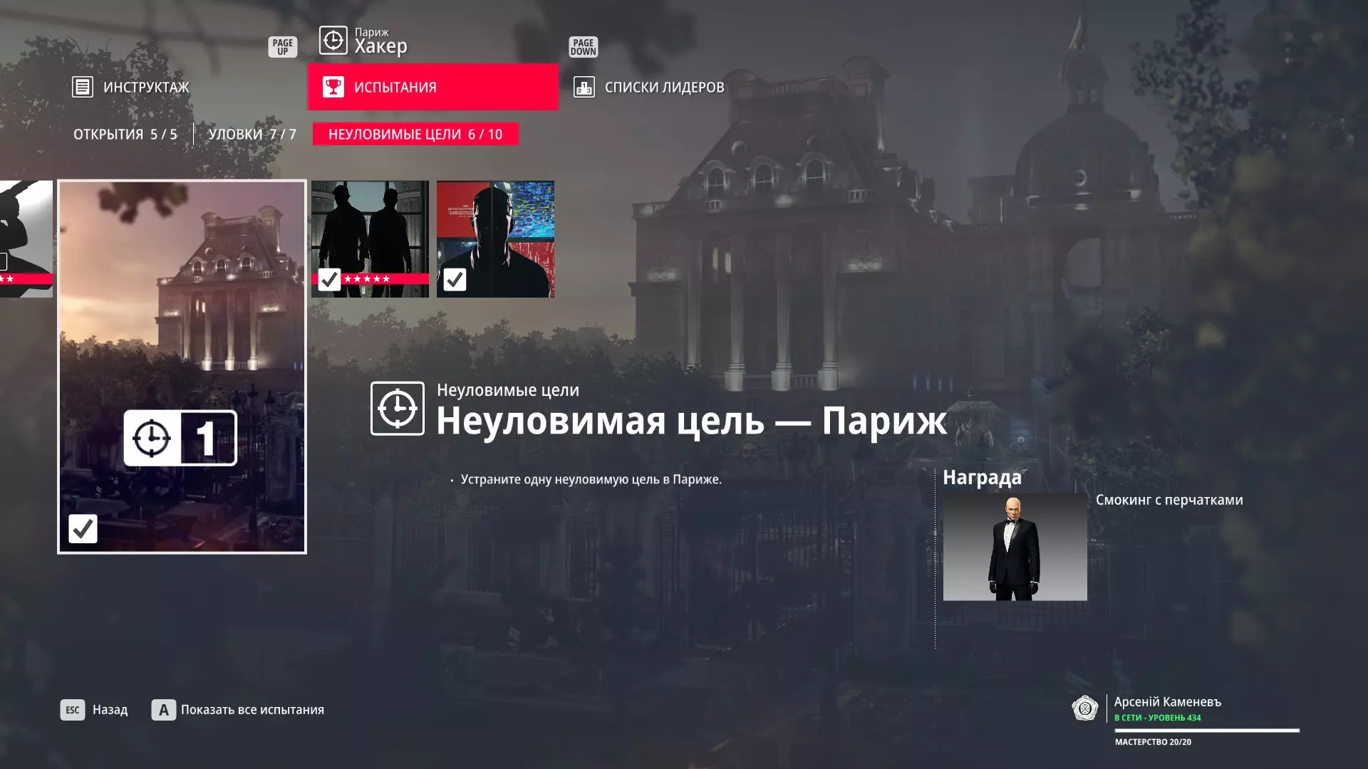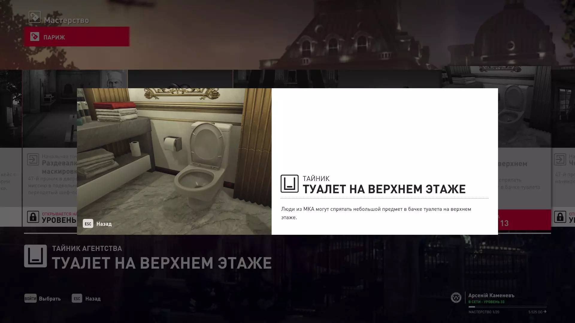 提示:成就【Бесшумный убийца】的获取条件与普通游戏相同,但没有换装限制。即:不可被发现且不可滥杀无辜。换装无限制。可以击晕任何人,关键是尸体不被发现。 挑战:无法捕捉的目标 - 巴黎 描述:在巴黎消灭一个无法捕捉的目标 奖励:晚礼服配手套
