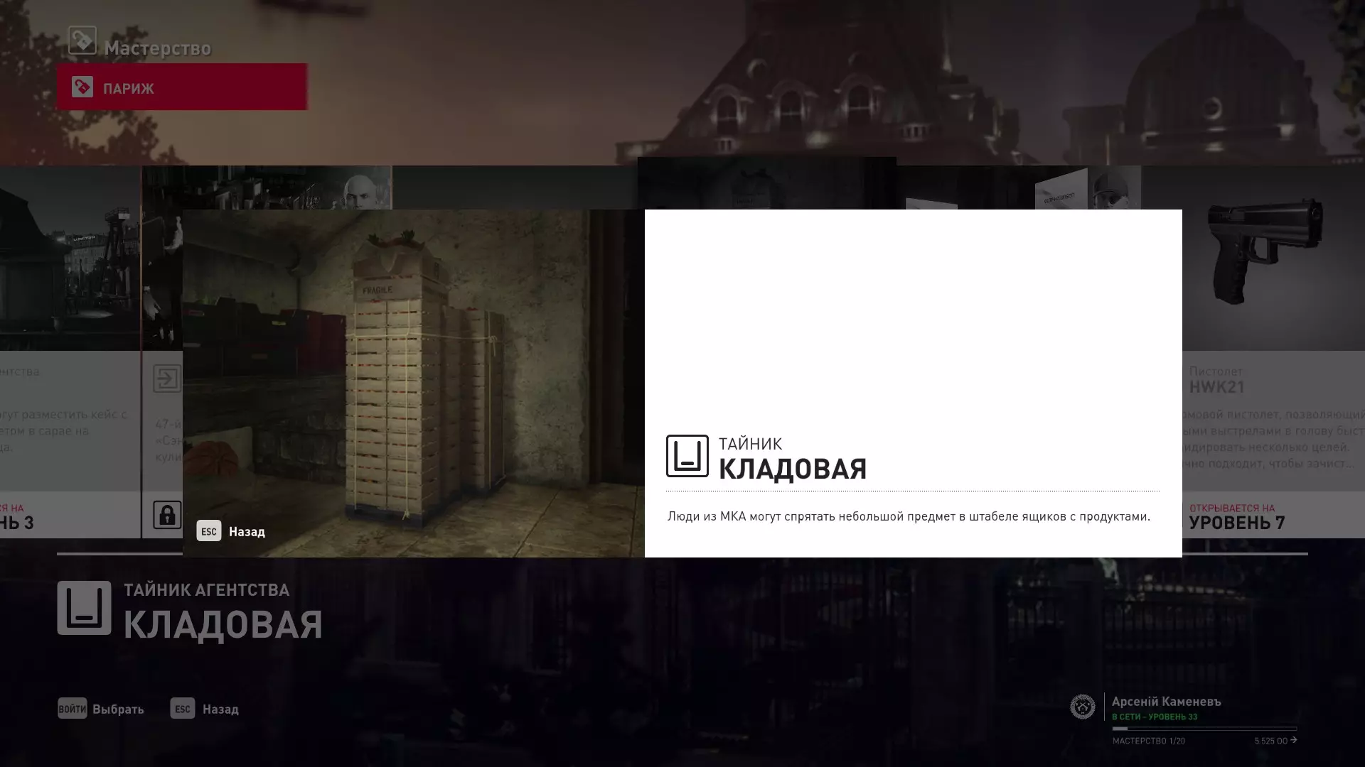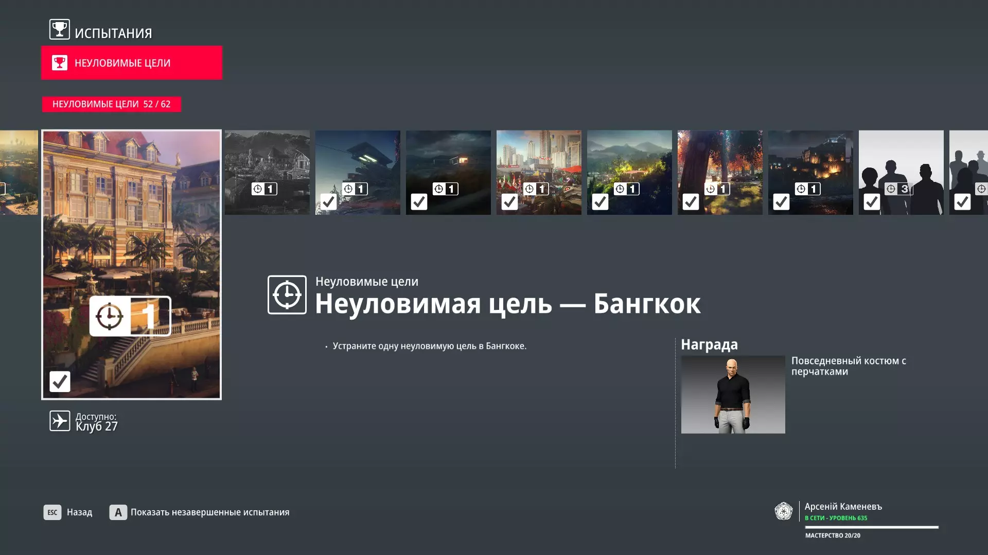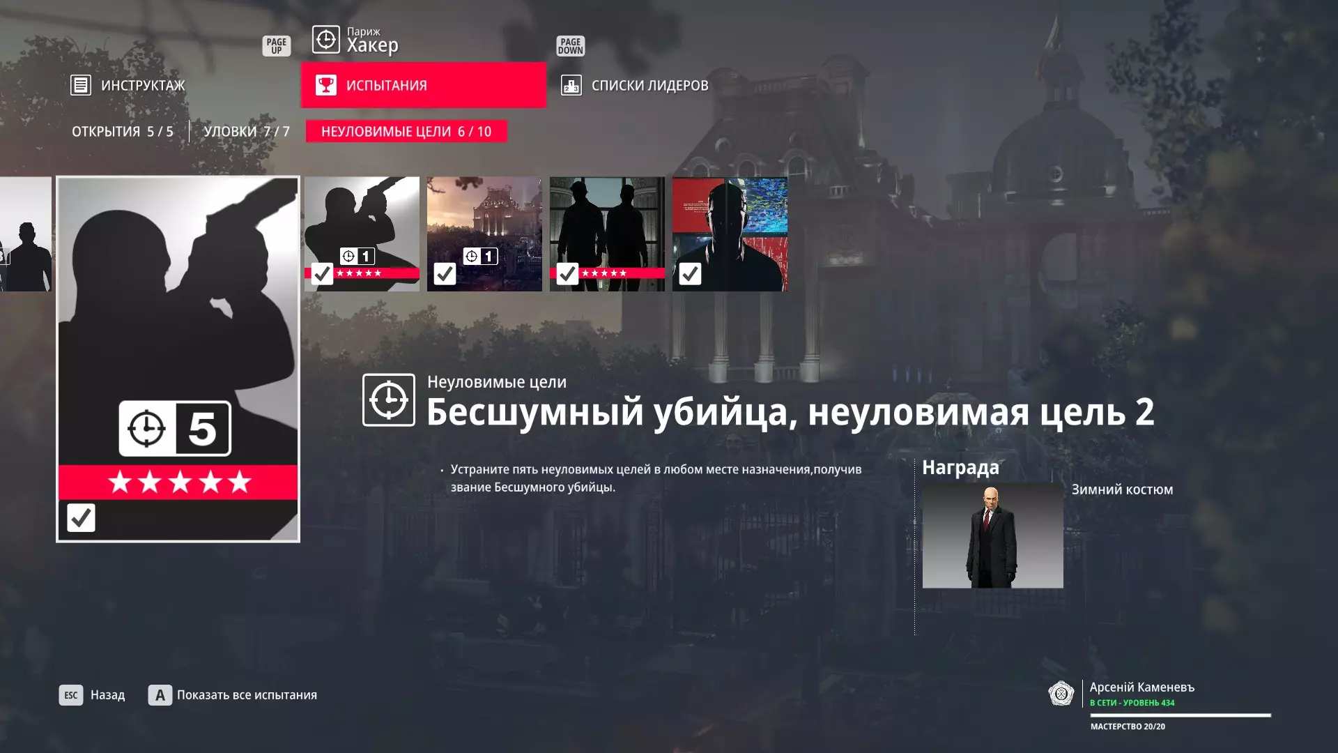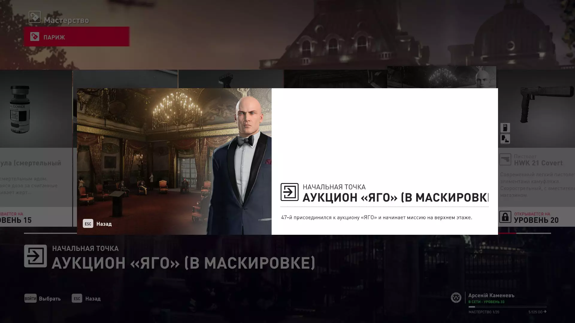 提示:成就【Бесшумный убийца】的获取条件与普通游戏相同,但没有换装限制。即:不可被发现且不可滥杀无辜。换装无限制。可以击晕任何人,关键是尸体不被发现。 挑战:无法捕捉的目标 - 巴黎 描述:在巴黎消灭一个无法捕捉的目标 奖励:晚礼服配手套