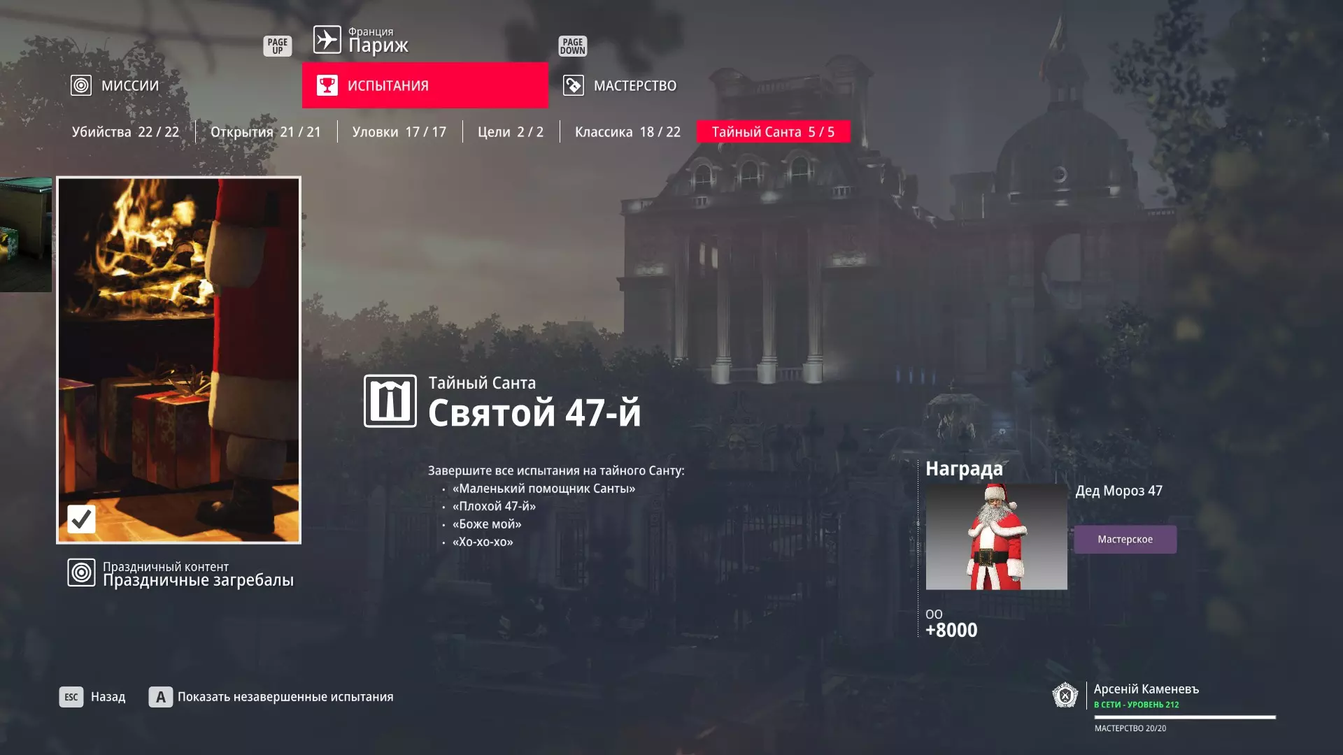 试炼:圣徒47号 描述:完成秘密圣诞老人的所有试炼 奖励:【圣诞老人47】服装