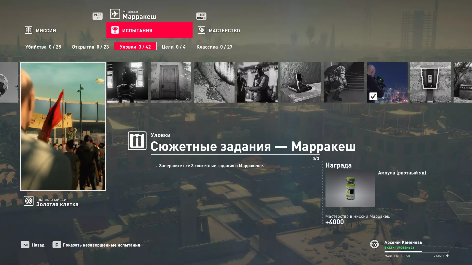第一季试炼(第二部分) 试炼:剧情任务 - 马拉喀什 描述:完成马拉喀什的全部3个剧情任务——【兔子洞】、【争执】和【黄金时段】。 奖励:呕吐毒素安瓿