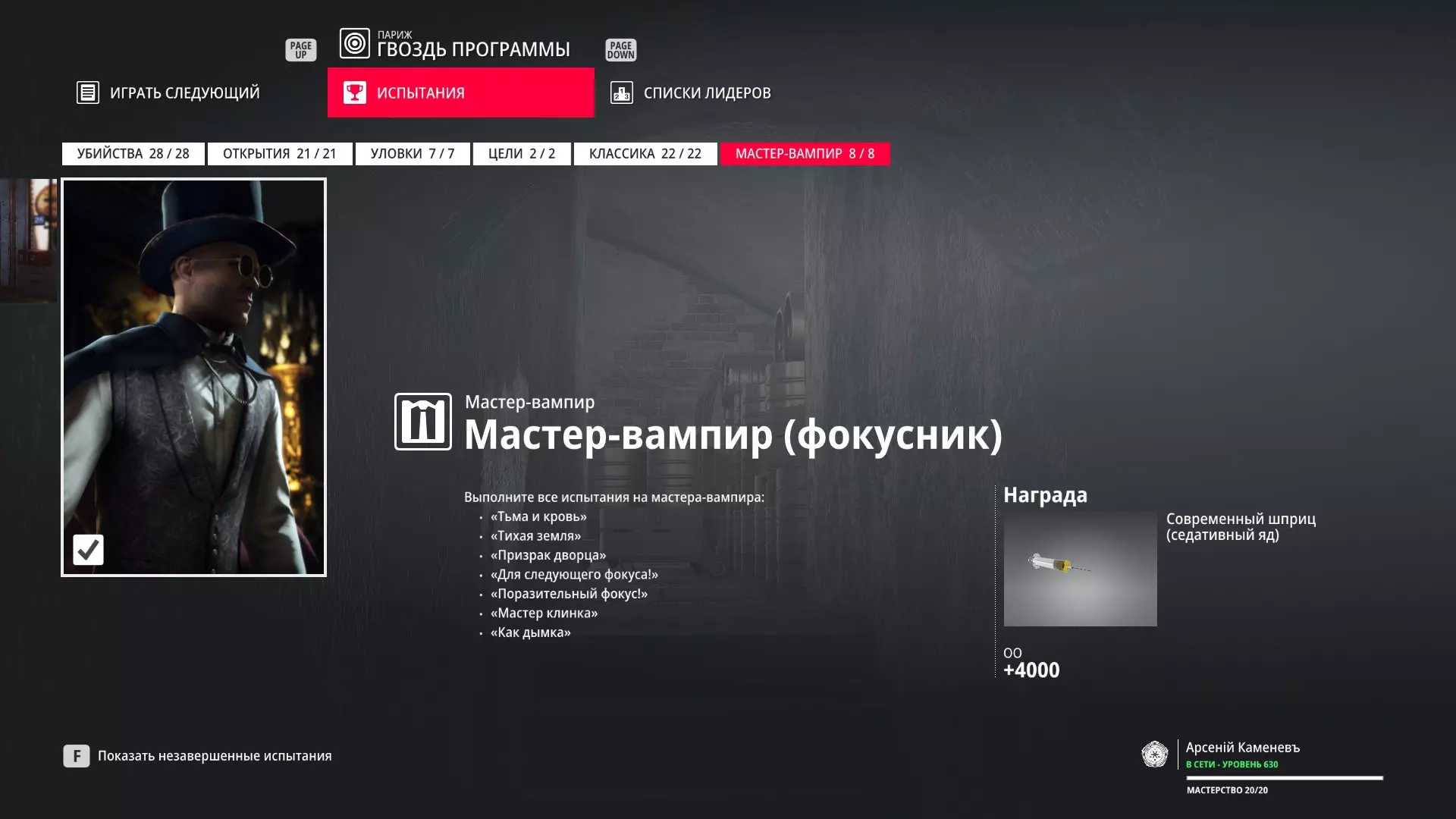 注意:必须完成此处指定的任务,其他剧情任务不计入试炼。其他任务也是如此。 试炼:吸血鬼大师 描述:完成所有吸血鬼大师试炼 奖励:现代注射器(镇静核心)