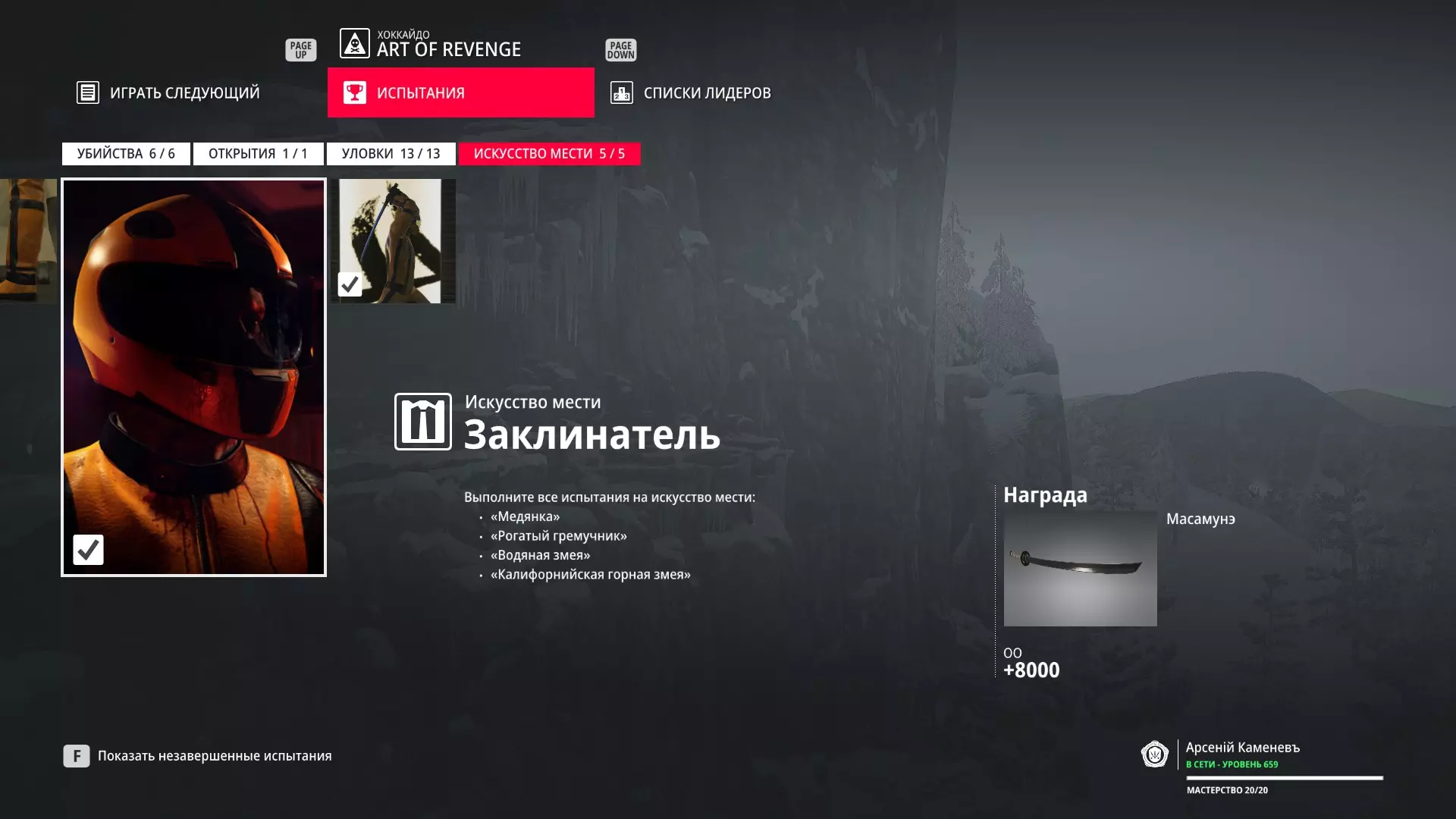 注意:这些试炼仅在“北海道雪祭”活动期间(1月21日至2月12日)开放。 试炼:复仇之术 描述:完成所有复仇之术试炼 奖励:正宗(日本刀)