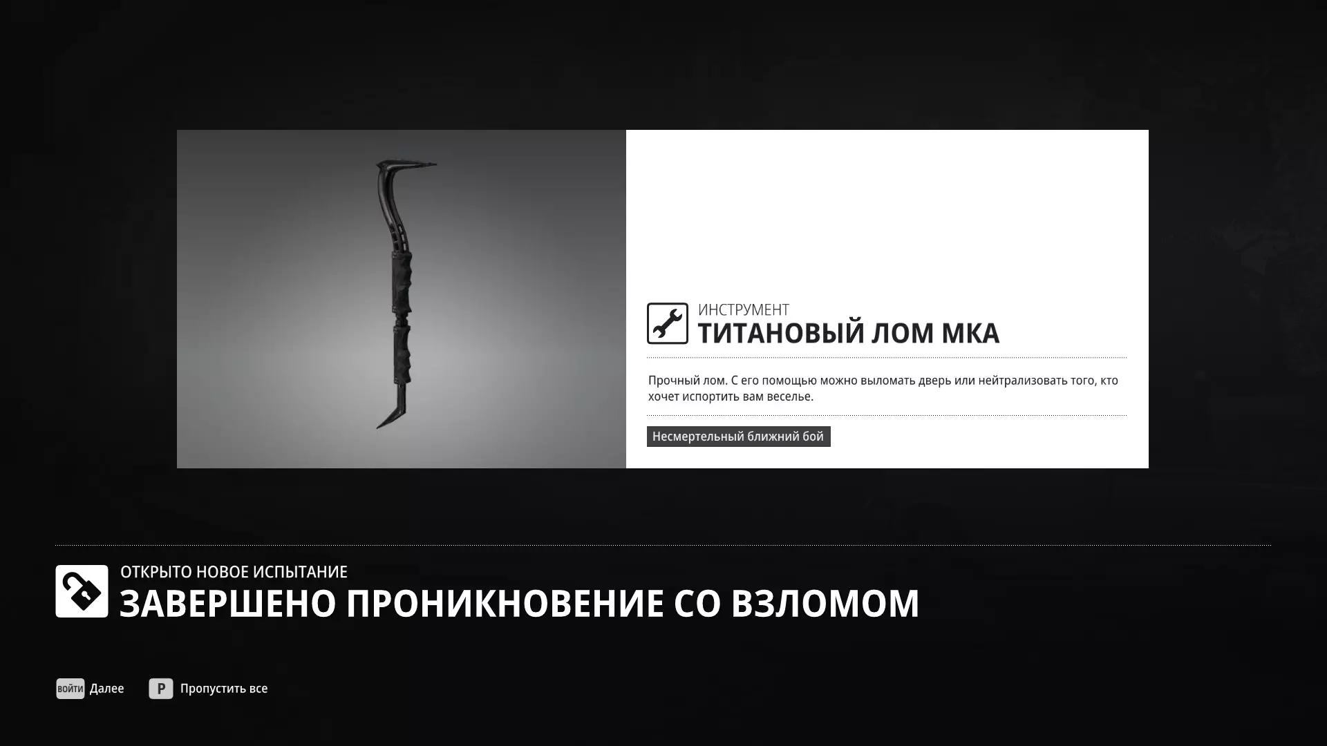 试炼:剧情任务 - MKA建筑群 描述:完成MKA建筑群中的全部3个剧情任务:【安全第一】、【光荣守卫】和【最终条件】 奖励:撬棍