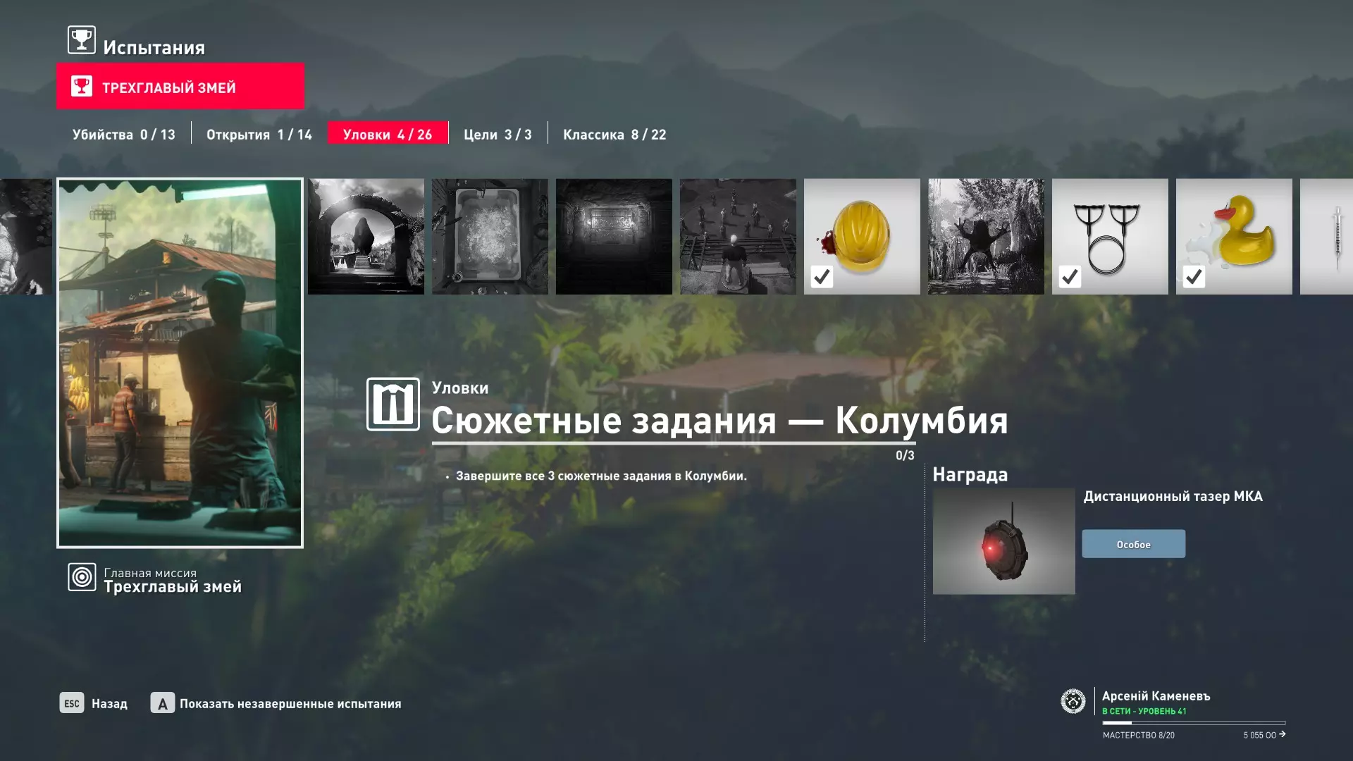 注意:如果该系列挑战无法完成,请将游戏语言切换为英语(通过游戏内设置)。 挑战:剧情任务 - 哥伦比亚 描述:完成哥伦比亚的全部3个剧情任务——【圣地】、【狩猎技巧】和【石之心】 奖励:远程泰瑟枪MKA