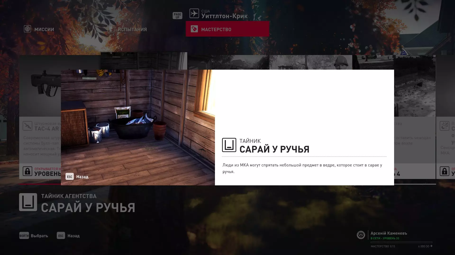 威尔顿溪 2级熟练度:突击步枪TAC-4 AR Auto mod.2和溪流旁谷仓内的MKA宝箱