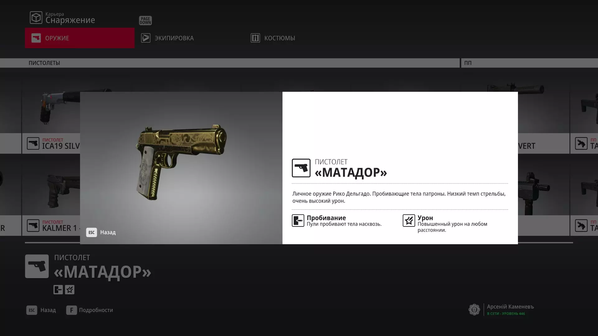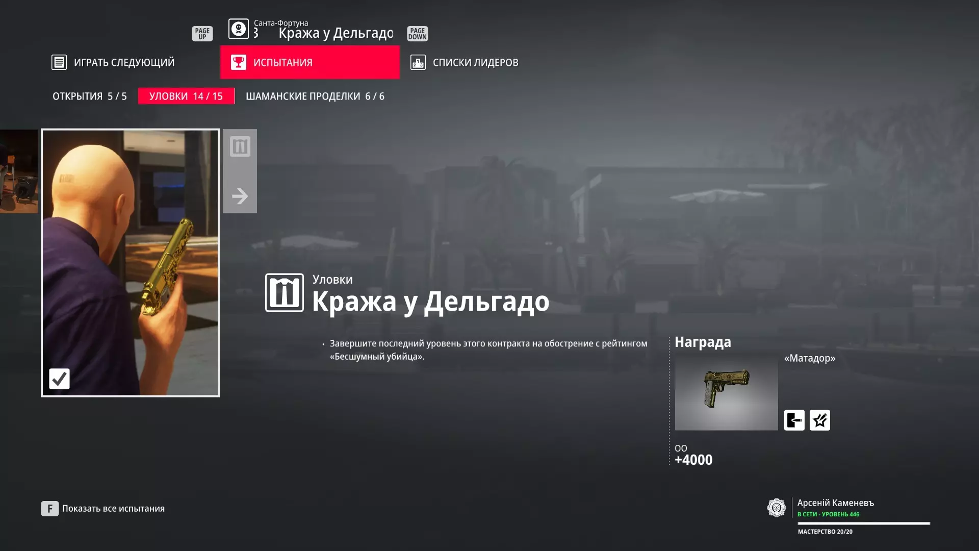 试炼:德尔加多的盗窃 描述:以“无声杀手”评级完成该合约的最后一个强化关卡 奖励:“斗牛士”手枪