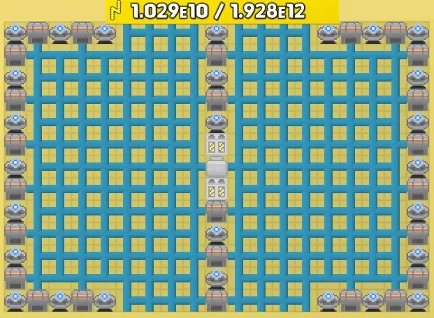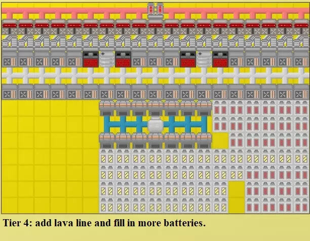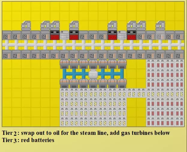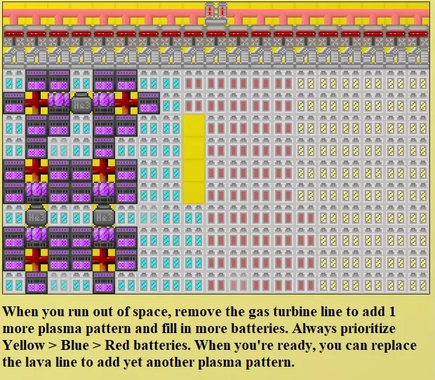 当你拥有4组等离子图案(20个涡轮机)后,就不需要再增加了,因为此时按下电源按钮,继续增加只会消耗你的最大电池容量,而不会提升加成效果。还有一种替代的等离子图案,在每格基础上效果相同,只需移除等离子管道,将5个涡轮机连接改为3个涡轮机连接。这让你可以在两种图案之间选择:一种是30k能量/ tick,另一种是50k能量/ tick。如果你希望改变能量生成与最大存储的比例,这样就能实现3或5的倍数(例如使用每种图案各2组来达到160k)。 编辑:由于等离子管道存在一个bug,更好的图案是移除管道,直接连接3个涡轮机。通过交替方向,这种图案在游戏后期也能使用,以达到每tick的最大能量输出。别忘了找时间回去把它弄得好看些! 后电石版本