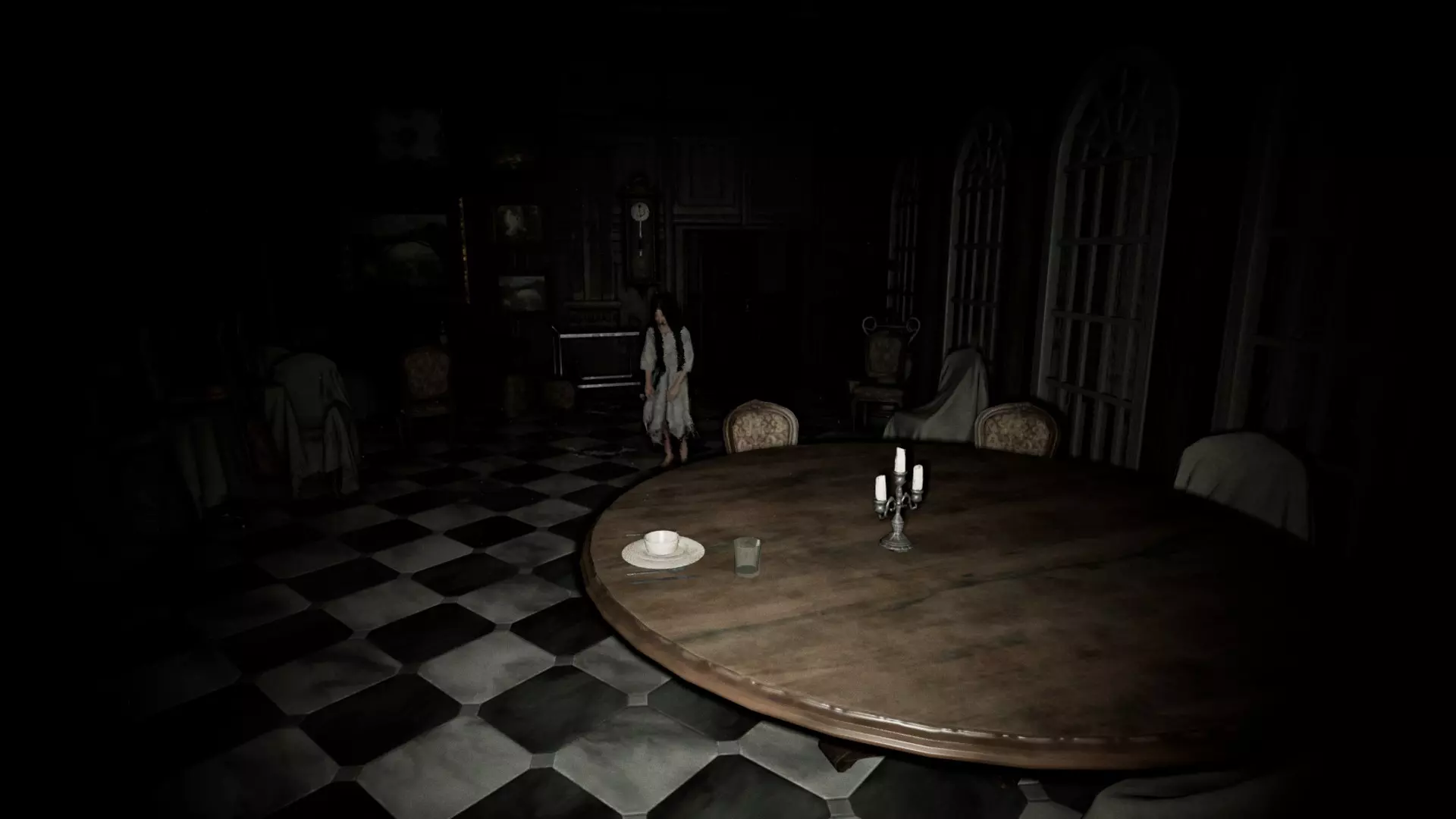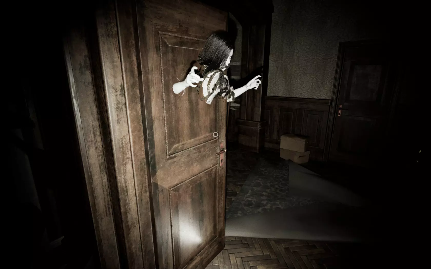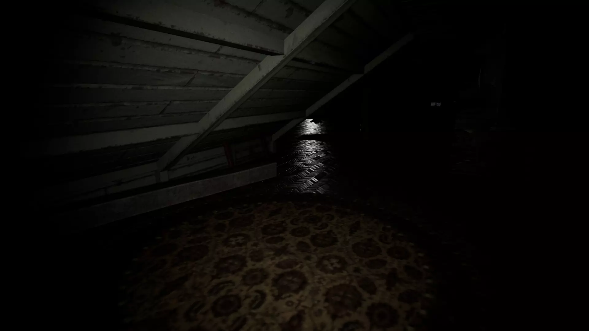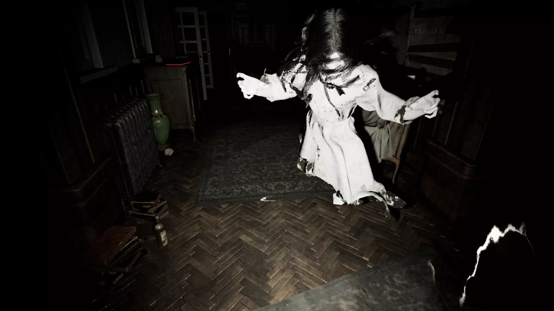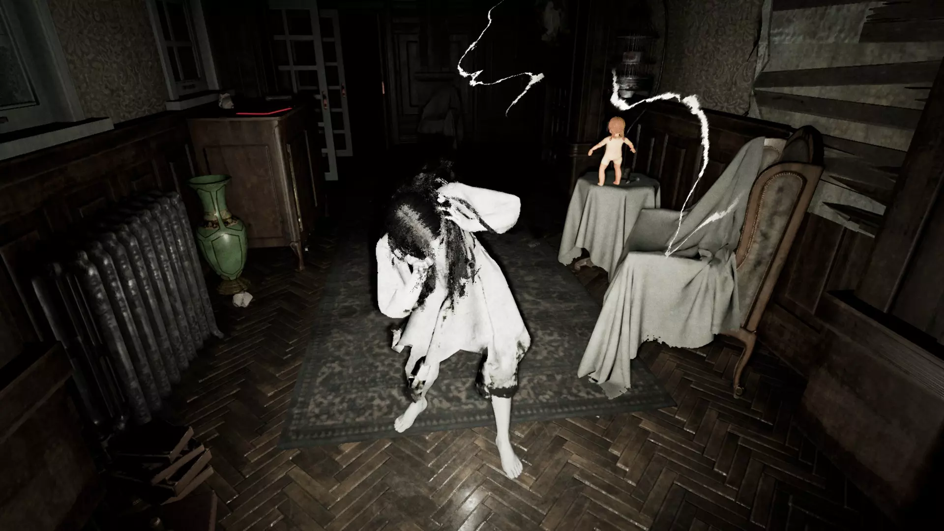 除了白光外,它还会发出咕噜声。仅凭咕噜声往往很难判断它的位置或来源。需要注意的是,这所房子有多个房间和多扇门,几乎所有区域都是相互连通的。熟悉房子的布局是很理想的。如果你听到它的声音,先花点时间猜测它在哪里。如果在不明情况时就跑出去,很可能会撞见它。步行能让你更容易定位它。由于它在不断移动,听到声音时停下来,更容易判断它的方向。步行还能让你在看到它发出的白光靠近时及时做出反应。跑步虽然可行,但你必须非常警惕,并且知道何时以及向哪个方向跑。她的白色光芒有助于你提前发现她,但如果她看到你,你会听到一个声音,并且很可能已经被她杀死(不过在早期阶段她速度较慢,你还有机会逃跑)。白色光芒的优势在于它能穿透地面,所以当你在房子里走动并听到她的声音时,可以抬头看向天花板,如果看到光芒,就能知道她在哪里。有时候关掉手电筒能帮助你更好地看到她。光芒比咕噜声更可靠,但要注意避免将其与窗户和木地板上的闪电闪光,或是手电筒照在镜子或罐子上的反光混淆。