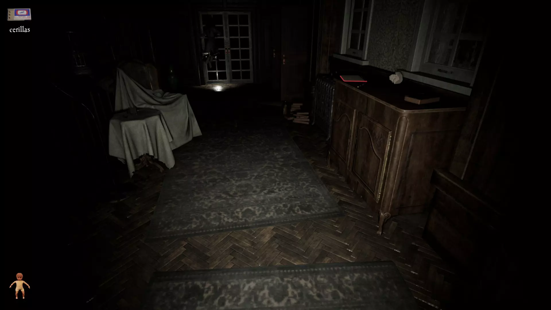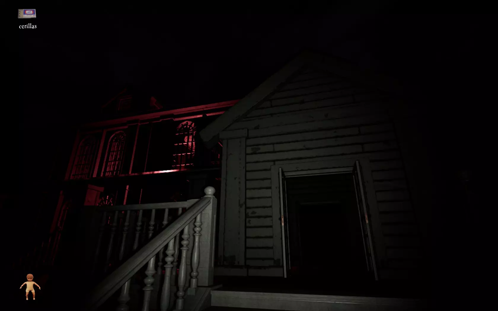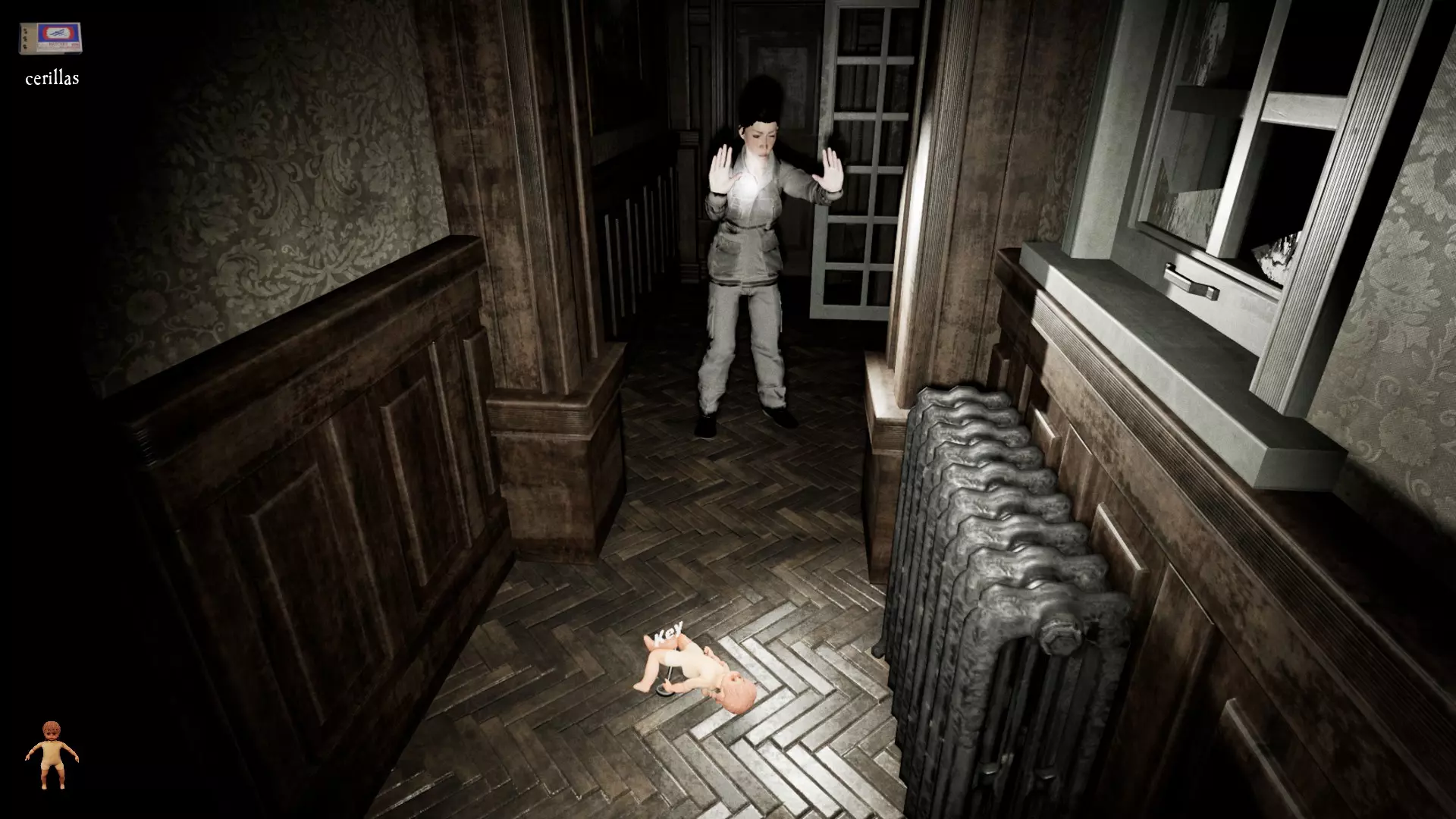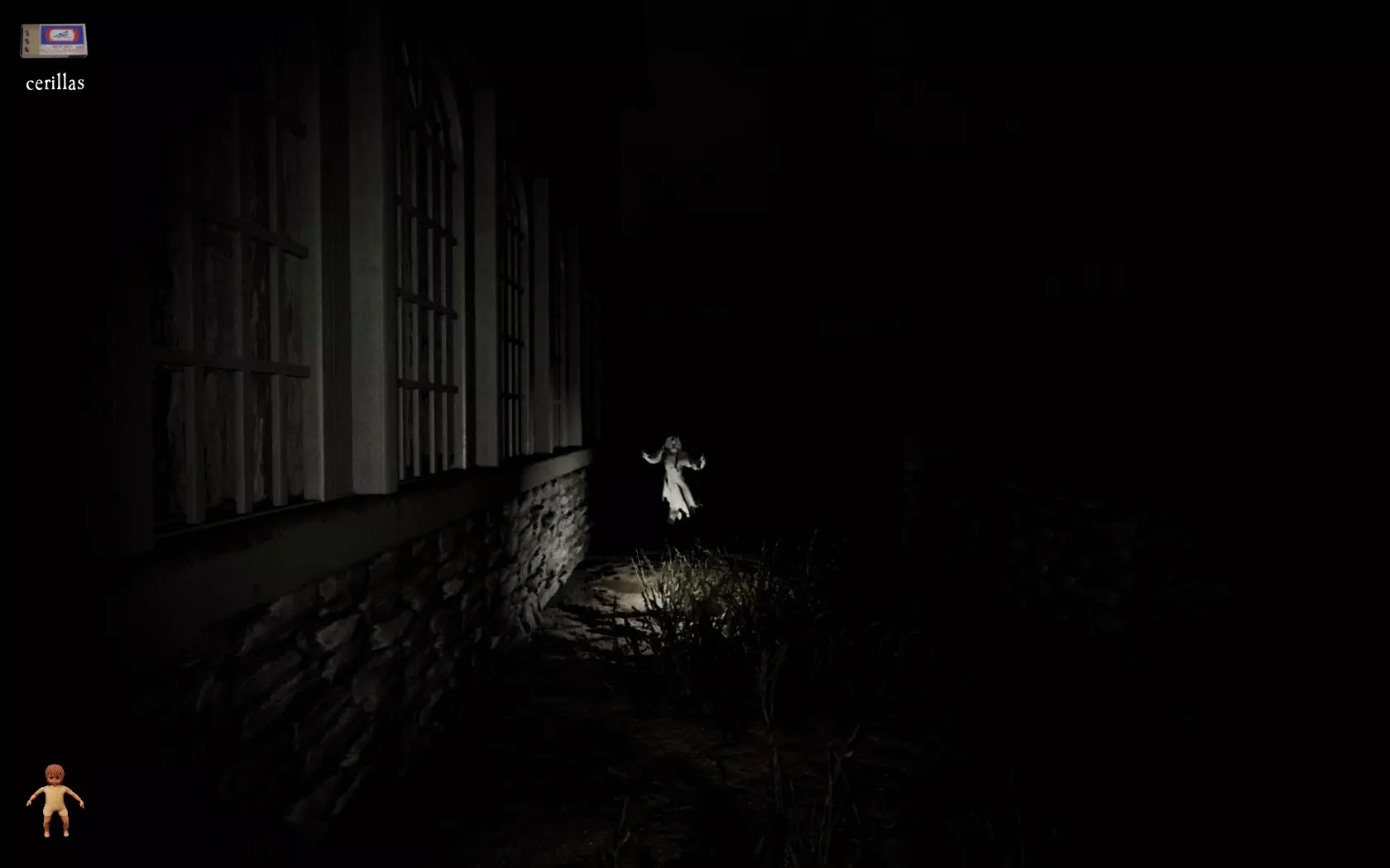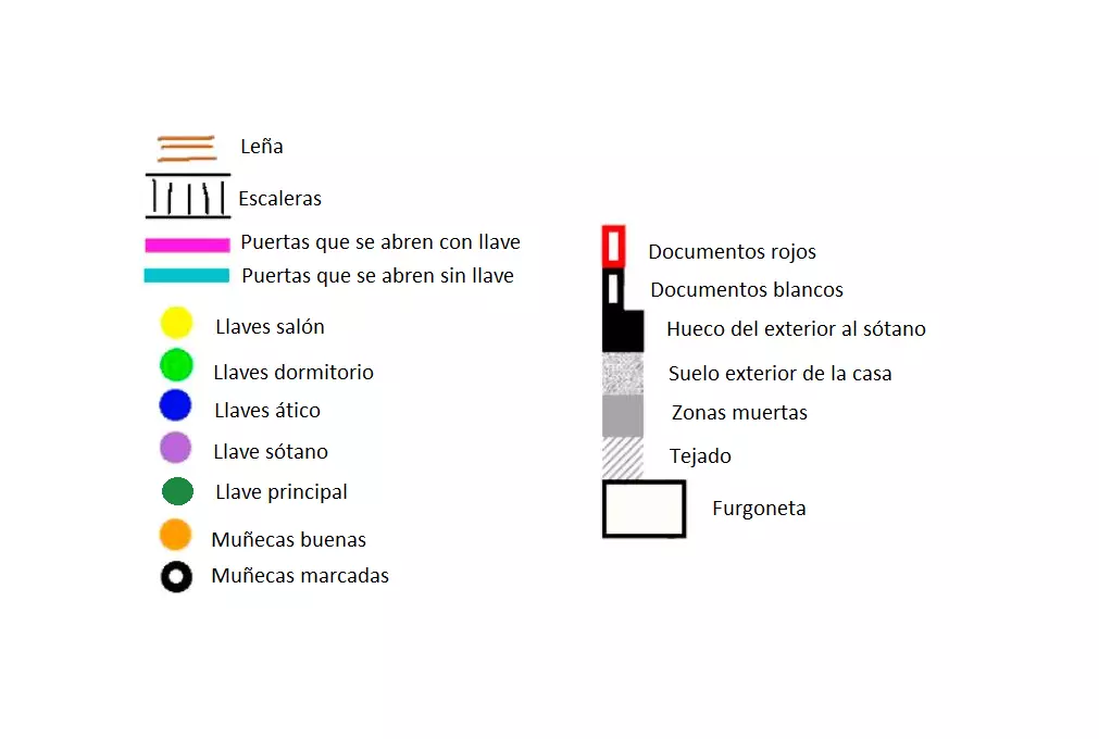 由于最终目标是到达锅炉处,从外部走或许能救我们一命(并非总是如此,但能省去一条危险得多的路)。为此,你必须拿到地下室里的主钥匙,它在厨房楼梯下方缺口处的那扇门后面。一条不错的路线是从两扇正门中的任意一扇走出房子,然后通过花园里的洞口下到地下室,直达锅炉室。这并不能保证你不会被抓住,但能避免我们不得不在房子里四处走动并犯下某些错误,比如在走廊里转弯或撞到桌子。门也可能给我们带来麻烦,因为它们既可以向内开也可以向外开,有时你会被卡住。有时楼梯会阻碍我们移动,甚至可能因为栏杆而暂时被困住(在怪物的最终阶段,这可能会让你丧命)。走外侧的另一个好处是,由于房子几乎全是窗户和玻璃幕墙,通过它们很容易定位怪物。有时你只需待在一个地方,等着看它经过,然后去相反的方向。如果你站在熔炉左侧的角落里,站在柴火家具上(此时柴火家具应该已经没有了),怪物就无法攻击你。这只能让你喘口气,因为你必须离开这个地方去寻找娃娃,而且可能在其他任何地方被怪物抓住。