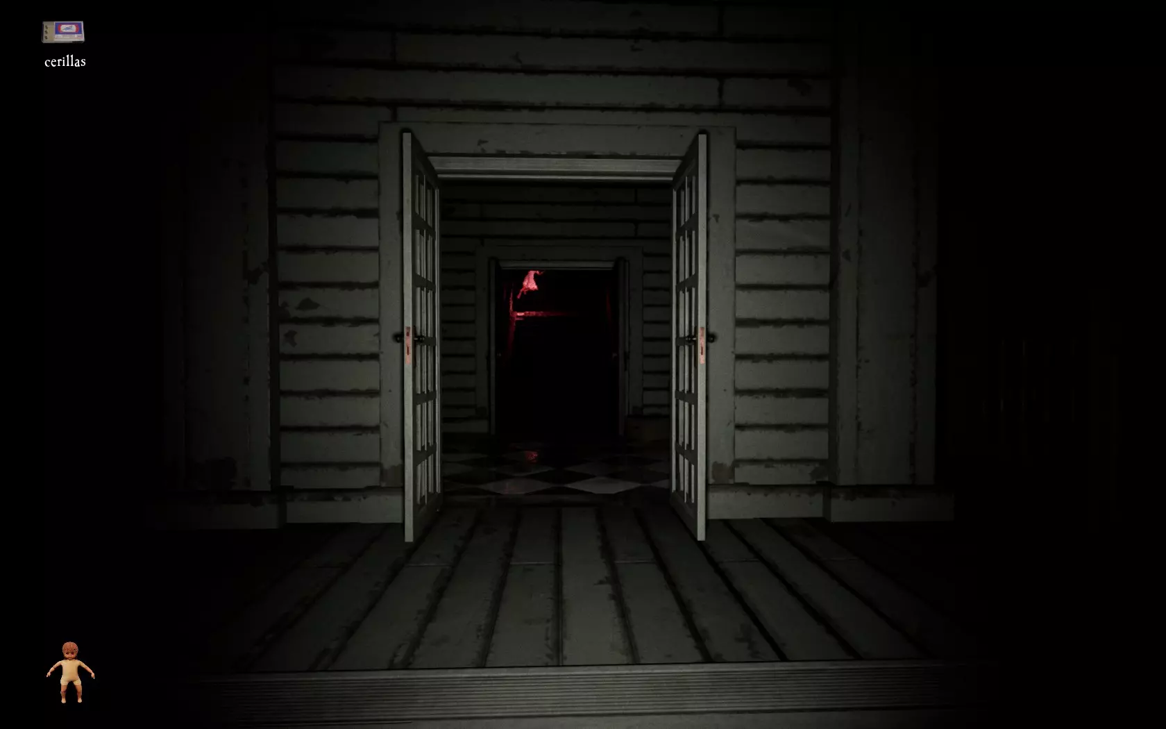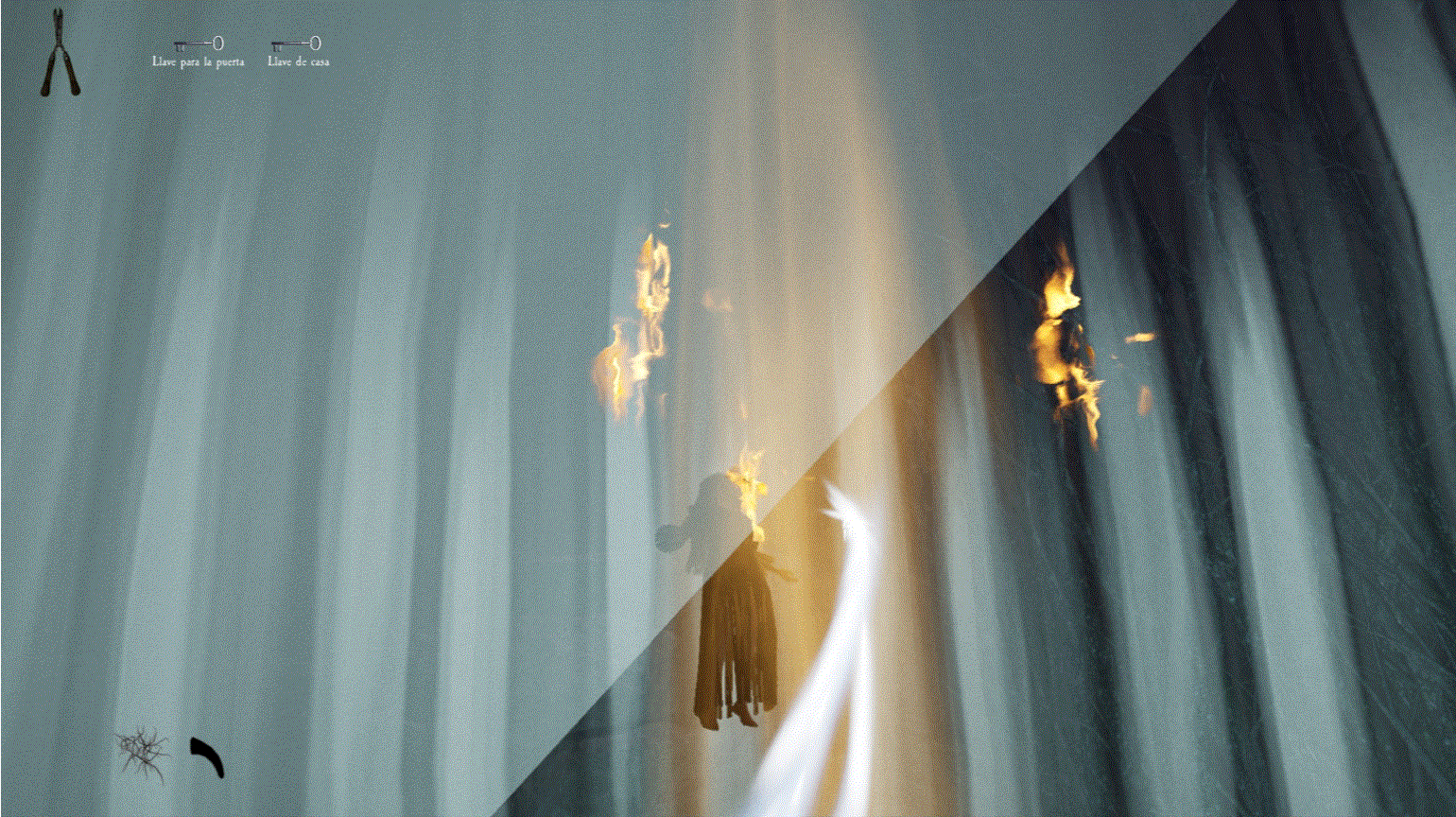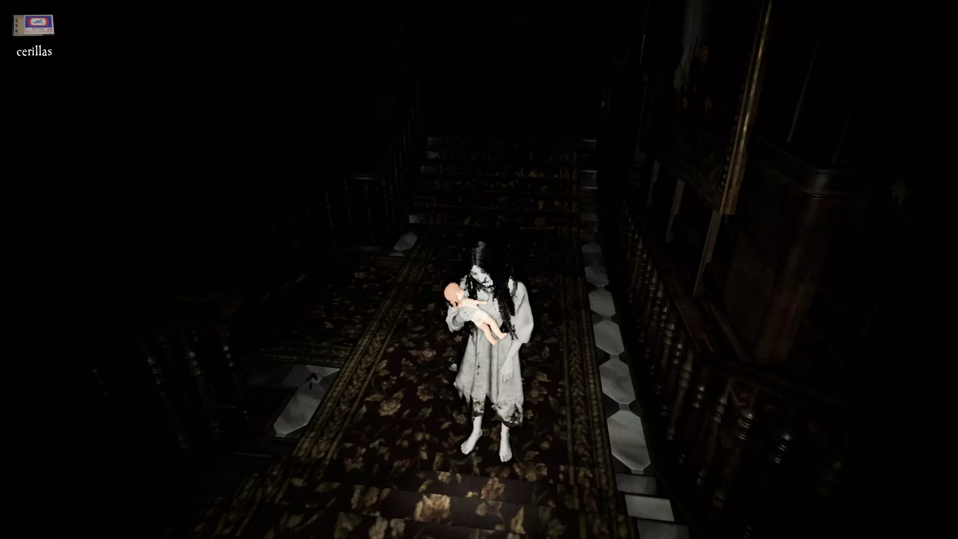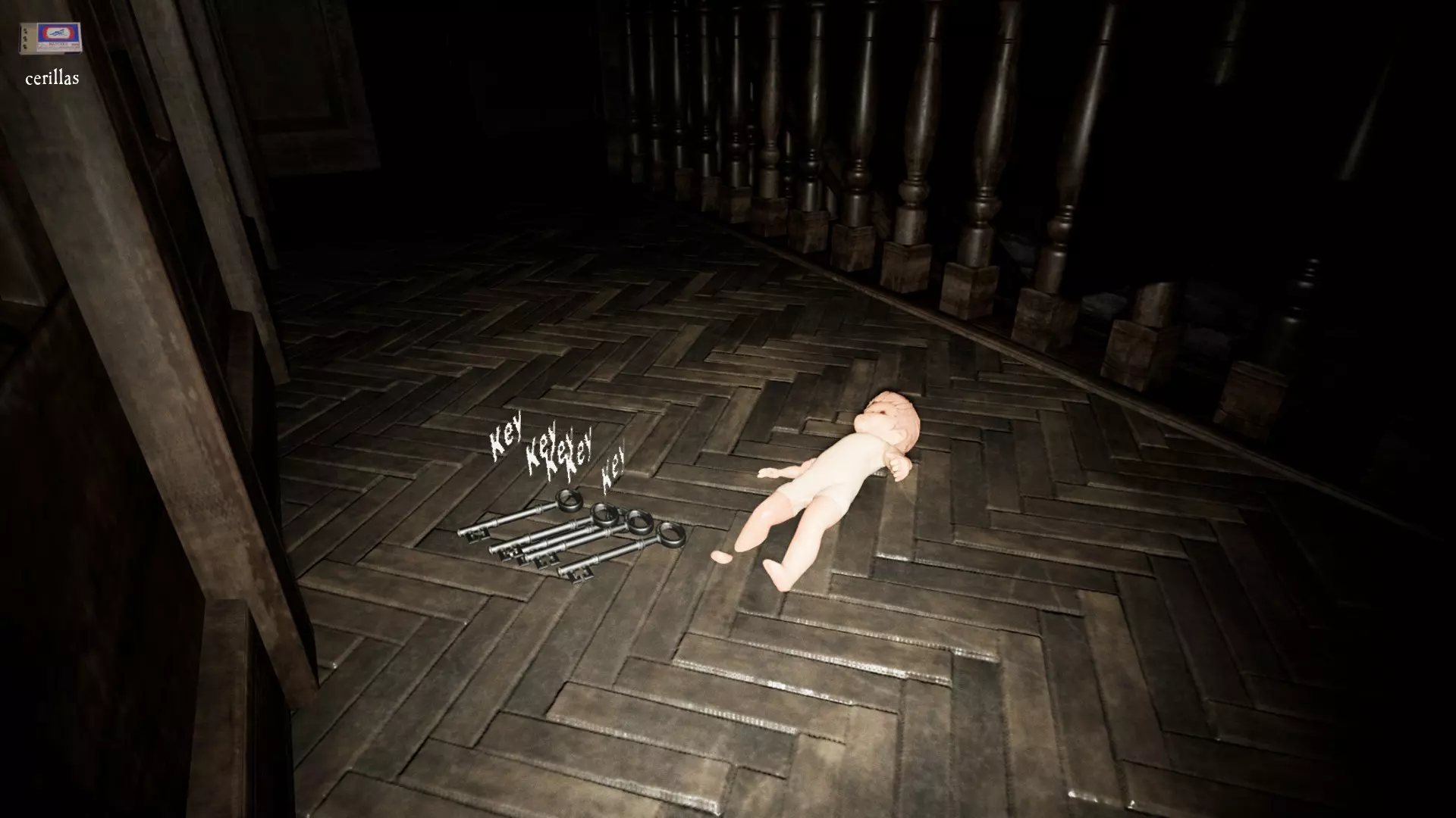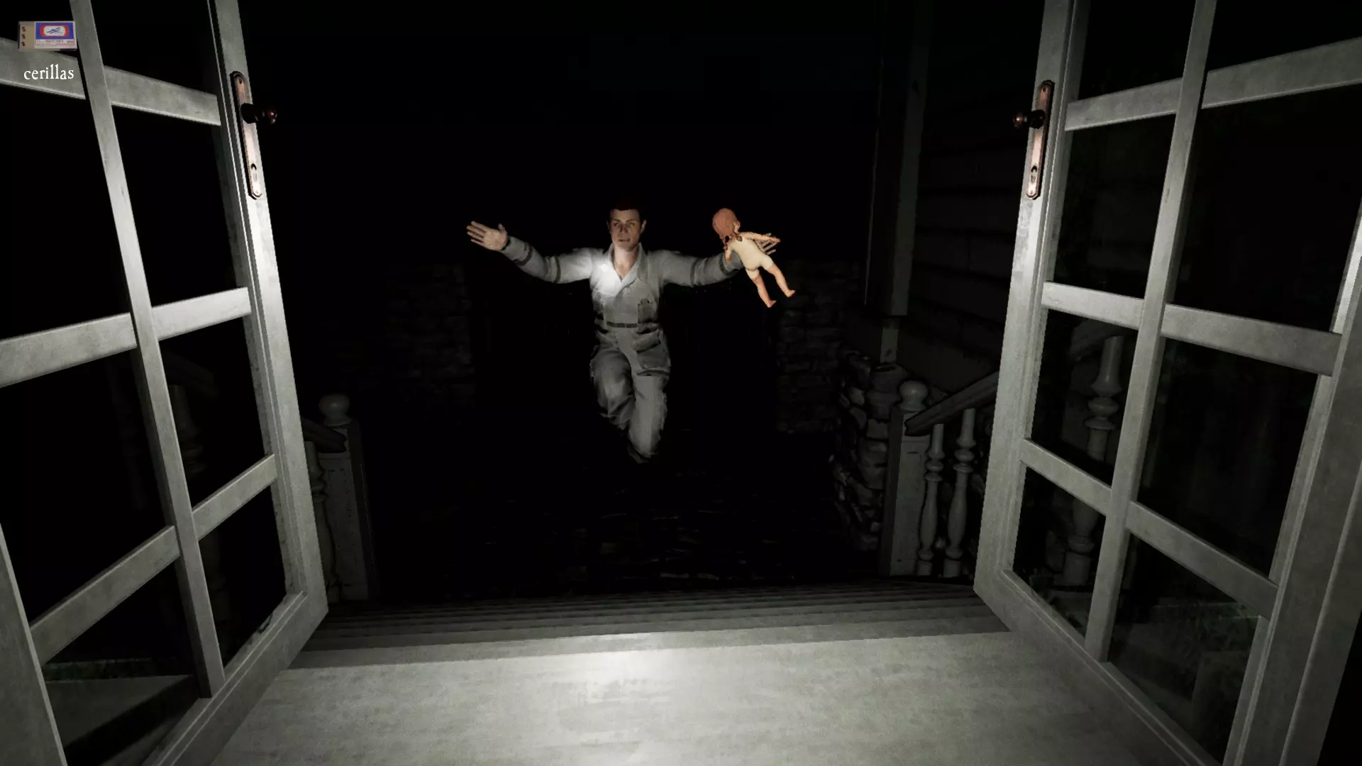 由于最终目标是到达锅炉处,从外部走或许能救我们一命(并非总是如此,但能省去一条危险得多的路)。为此,你必须拿到地下室里的主钥匙,它在厨房楼梯下方缺口处的那扇门后面。一条不错的路线是从两扇正门中的任意一扇走出房子,然后通过花园里的洞口下到地下室,直达锅炉室。这并不能保证你不会被抓住,但能避免我们不得不在房子里四处走动并犯下某些错误,比如在走廊里转弯或撞到桌子。门也可能给我们带来麻烦,因为它们既可以向内开也可以向外开,有时你会被卡住。有时楼梯会阻碍我们移动,甚至可能因为栏杆而暂时被困住(在怪物的最终阶段,这可能会让你丧命)。走外侧的另一个好处是,由于房子几乎全是窗户和玻璃幕墙,通过它们很容易定位怪物。有时你只需待在一个地方,等着看它经过,然后去相反的方向。如果你站在熔炉左侧的角落里,站在柴火家具上(此时柴火家具应该已经没有了),怪物就无法攻击你。这只能让你喘口气,因为你必须离开这个地方去寻找娃娃,而且可能在其他任何地方被怪物抓住。