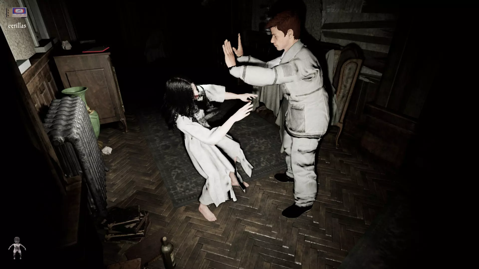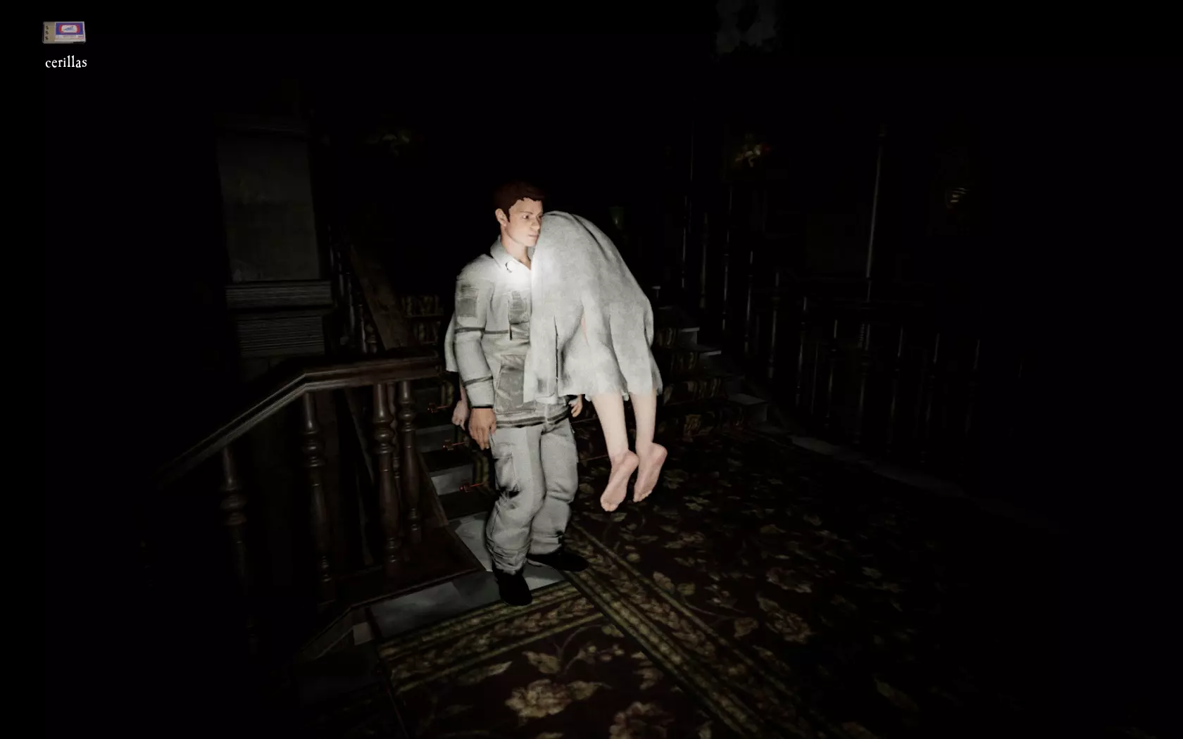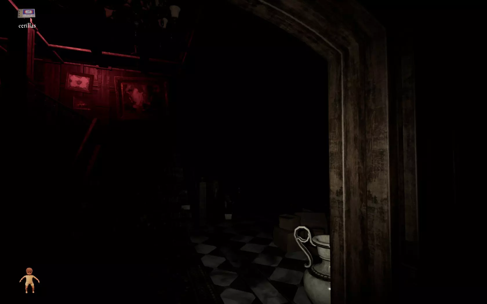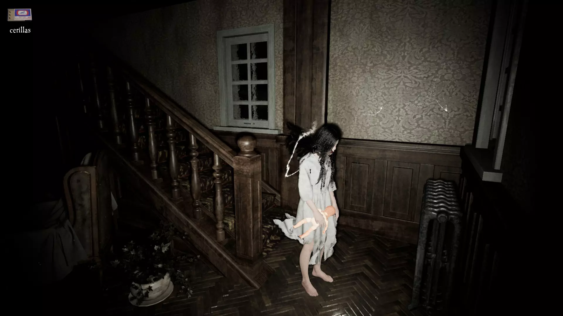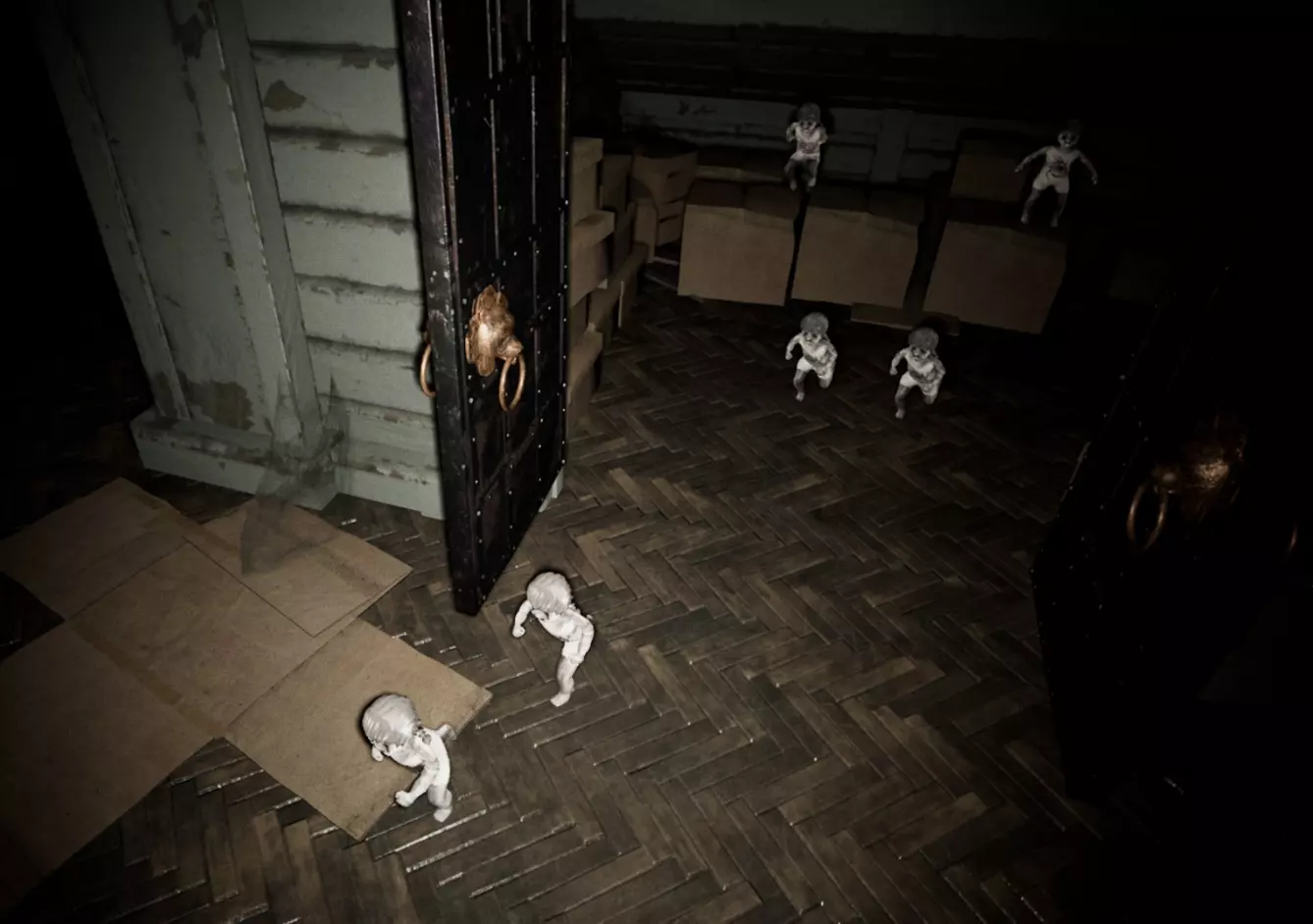 由于最终目标是到达锅炉处,从外部走或许能救我们一命(并非总是如此,但能省去一条危险得多的路)。为此,你必须拿到地下室里的主钥匙,它在厨房楼梯下方缺口处的那扇门后面。一条不错的路线是从两扇正门中的任意一扇走出房子,然后通过花园里的洞口下到地下室,直达锅炉室。这并不能保证你不会被抓住,但能避免我们不得不在房子里四处走动并犯下某些错误,比如在走廊里转弯或撞到桌子。门也可能给我们带来麻烦,因为它们既可以向内开也可以向外开,有时你会被卡住。有时楼梯会阻碍我们移动,甚至可能因为栏杆而暂时被困住(在怪物的最终阶段,这可能会让你丧命)。走外侧的另一个好处是,由于房子几乎全是窗户和玻璃幕墙,通过它们很容易定位怪物。有时你只需待在一个地方,等着看它经过,然后去相反的方向。如果你站在熔炉左侧的角落里,站在柴火家具上(此时柴火家具应该已经没有了),怪物就无法攻击你。这只能让你喘口气,因为你必须离开这个地方去寻找娃娃,而且可能在其他任何地方被怪物抓住。