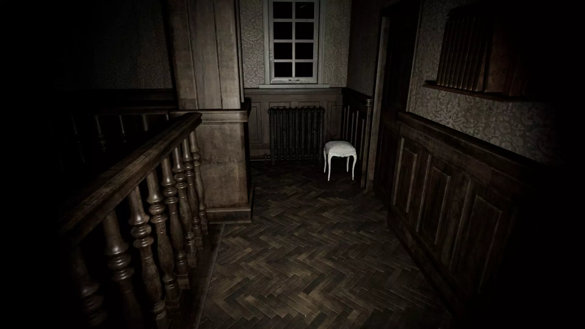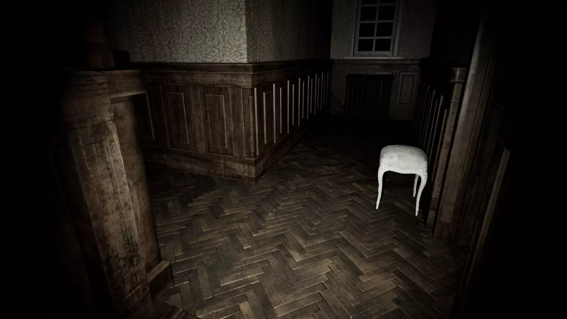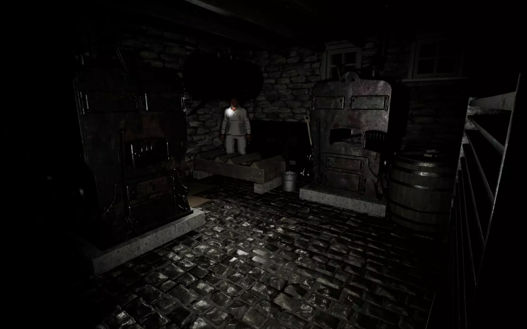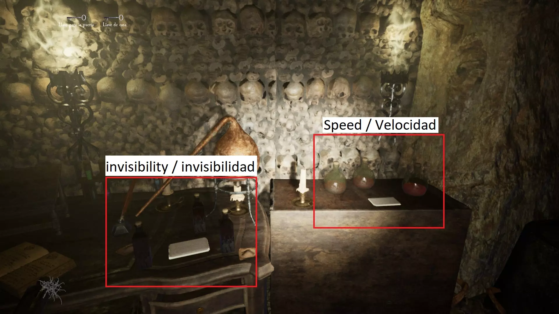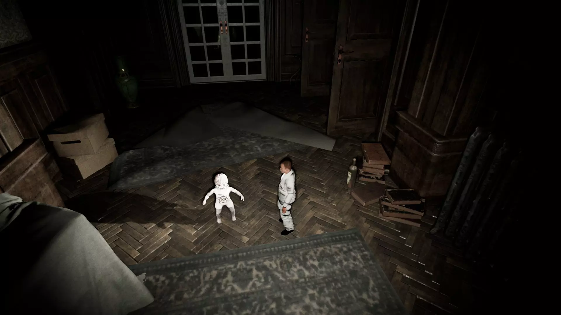 由于最终目标是到达锅炉处,从外部走或许能救我们一命(并非总是如此,但能省去一条危险得多的路)。为此,你必须拿到地下室里的主钥匙,它在厨房楼梯下方缺口处的那扇门后面。一条不错的路线是从两扇正门中的任意一扇走出房子,然后通过花园里的洞口下到地下室,直达锅炉室。这并不能保证你不会被抓住,但能避免我们不得不在房子里四处走动并犯下某些错误,比如在走廊里转弯或撞到桌子。门也可能给我们带来麻烦,因为它们既可以向内开也可以向外开,有时你会被卡住。有时楼梯会阻碍我们移动,甚至可能因为栏杆而暂时被困住(在怪物的最终阶段,这可能会让你丧命)。走外侧的另一个好处是,由于房子几乎全是窗户和玻璃幕墙,通过它们很容易定位怪物。有时你只需待在一个地方,等着看它经过,然后去相反的方向。如果你站在熔炉左侧的角落里,站在柴火家具上(此时柴火家具应该已经没有了),怪物就无法攻击你。这只能让你喘口气,因为你必须离开这个地方去寻找娃娃,而且可能在其他任何地方被怪物抓住。