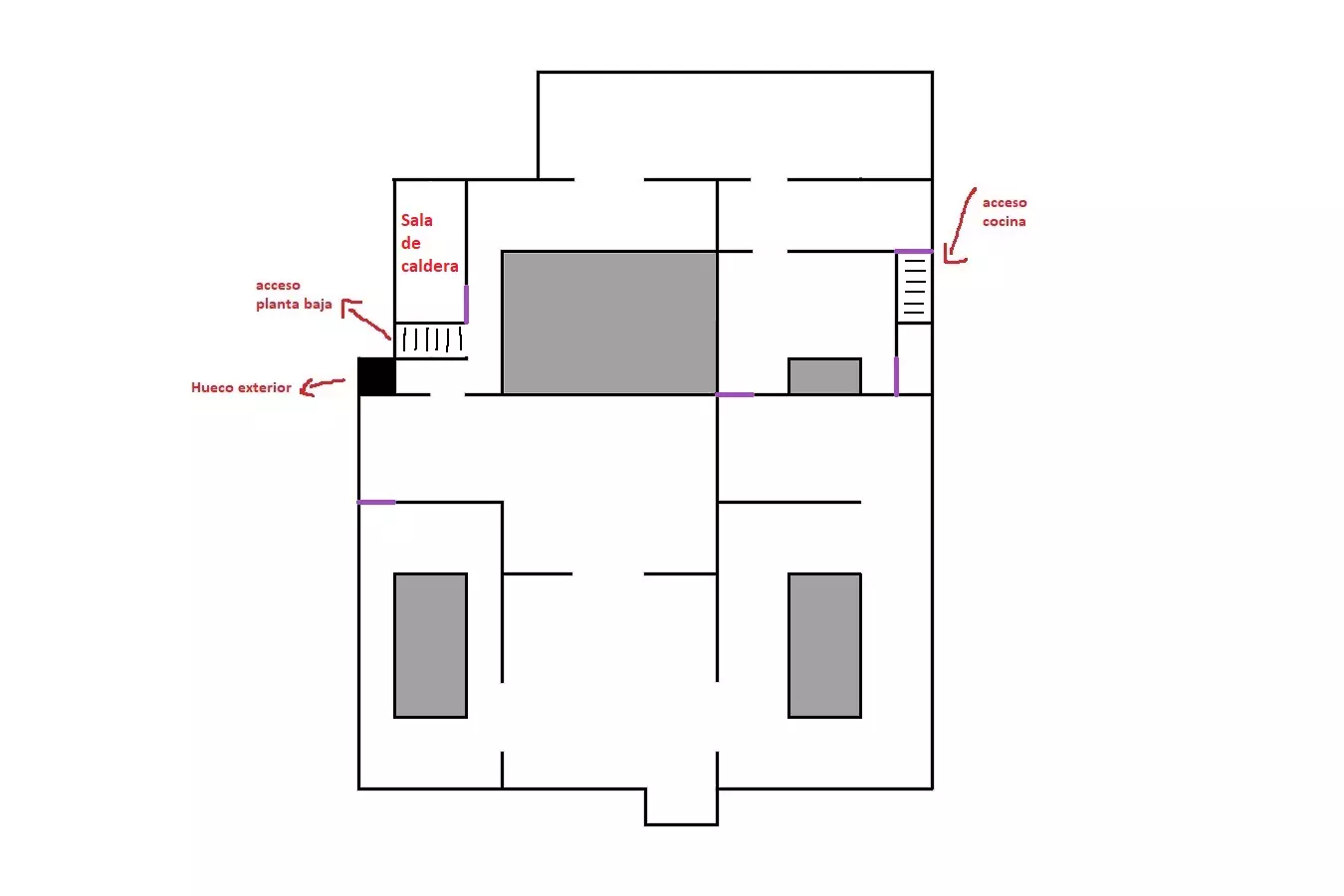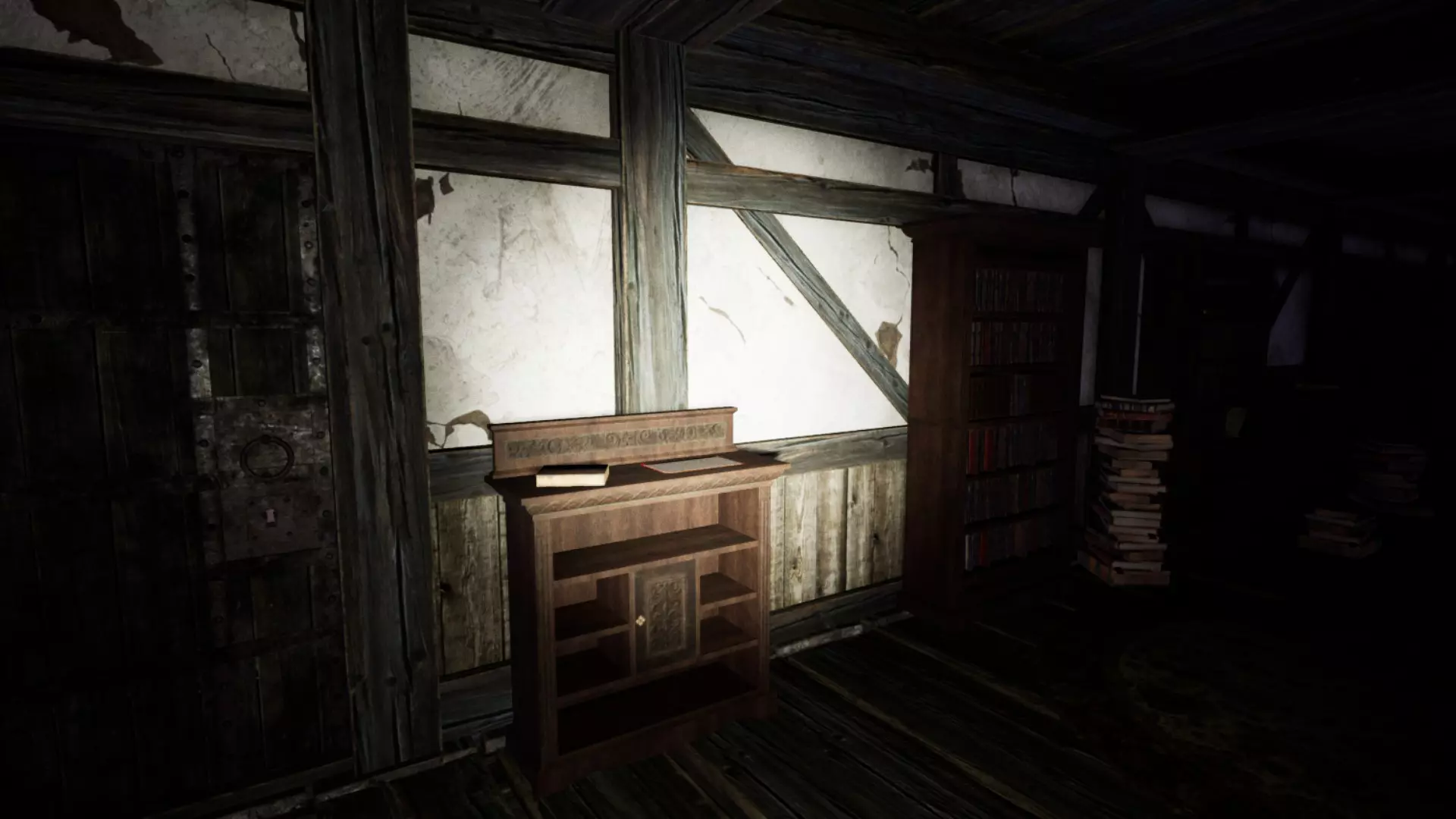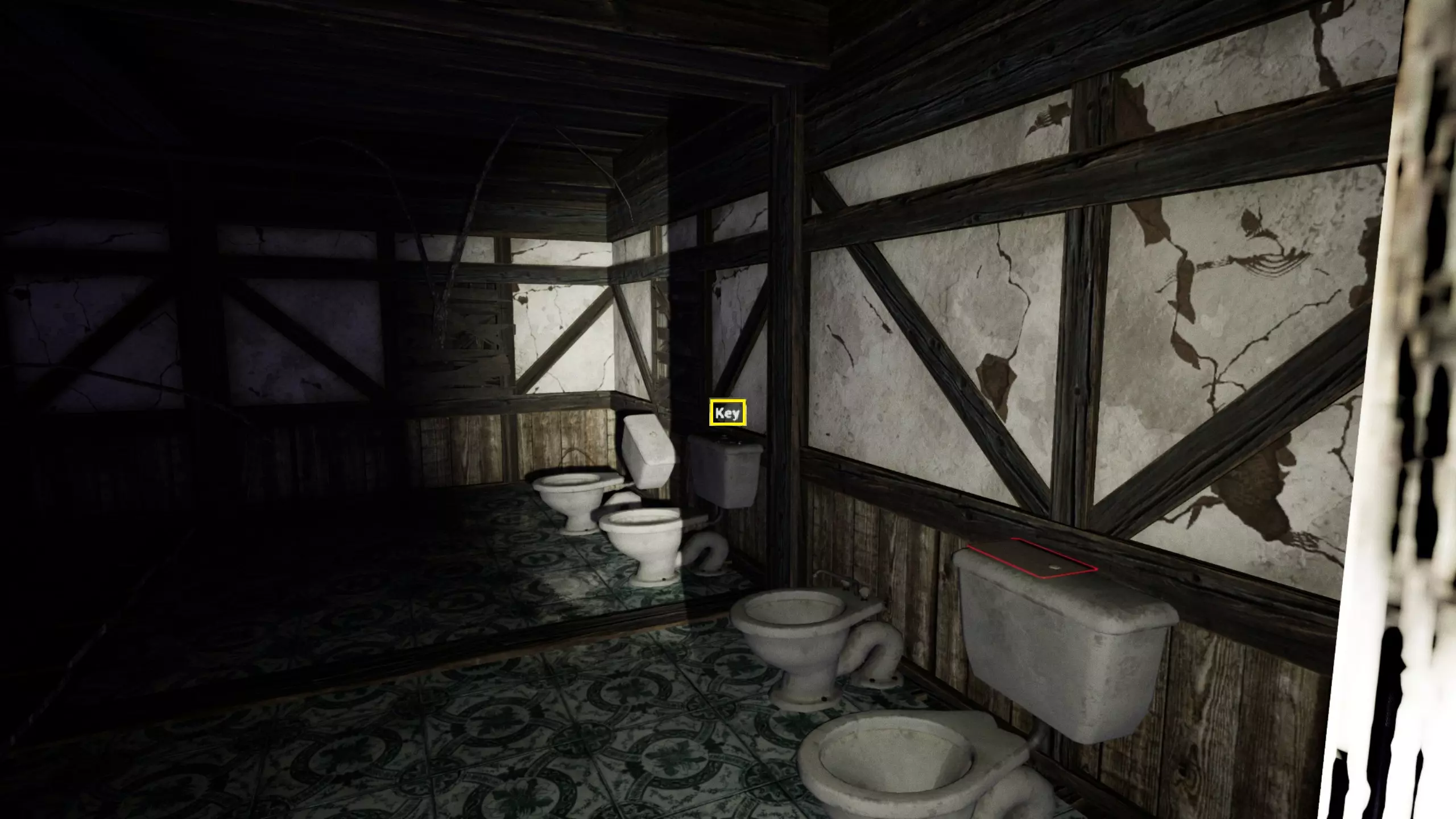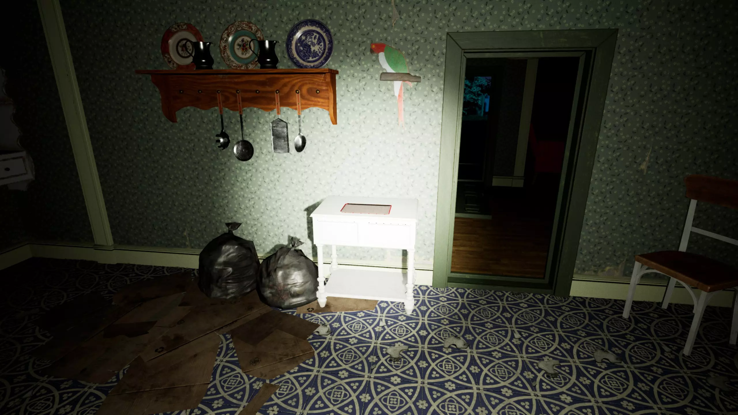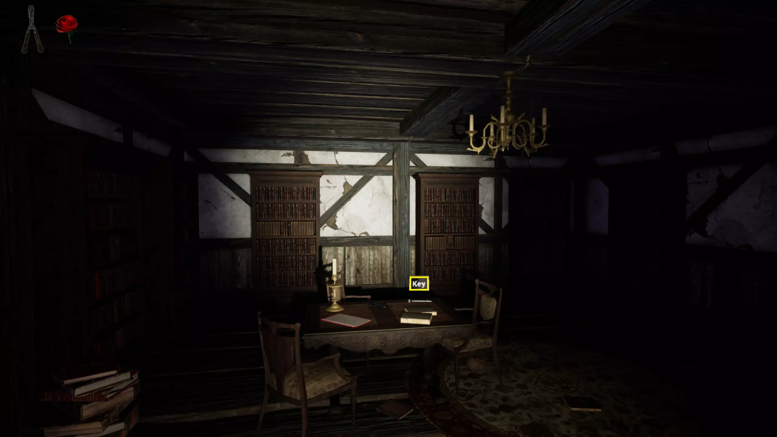由于最终目标是到达锅炉处,从外部走或许能救我们一命(并非总是如此,但能省去一条危险得多的路)。为此,你必须拿到地下室里的主钥匙,它在厨房楼梯下方缺口处的那扇门后面。一条不错的路线是从两扇正门中的任意一扇走出房子,然后通过花园里的洞口下到地下室,直达锅炉室。这并不能保证你不会被抓住,但能避免我们不得不在房子里四处走动并犯下某些错误,比如在走廊里转弯或撞到桌子。门也可能给我们带来麻烦,因为它们既可以向内开也可以向外开,有时你会被卡住。有时楼梯会阻碍我们移动,甚至可能因为栏杆而暂时被困住(在怪物的最终阶段,这可能会让你丧命)。走外侧的另一个好处是,由于房子几乎全是窗户和玻璃幕墙,通过它们很容易定位怪物。有时你只需待在一个地方,等着看它经过,然后去相反的方向。如果你站在熔炉左侧的角落里,站在柴火家具上(此时柴火家具应该已经没有了),怪物就无法攻击你。这只能让你喘口气,因为你必须离开这个地方去寻找娃娃,而且可能在其他任何地方被怪物抓住。