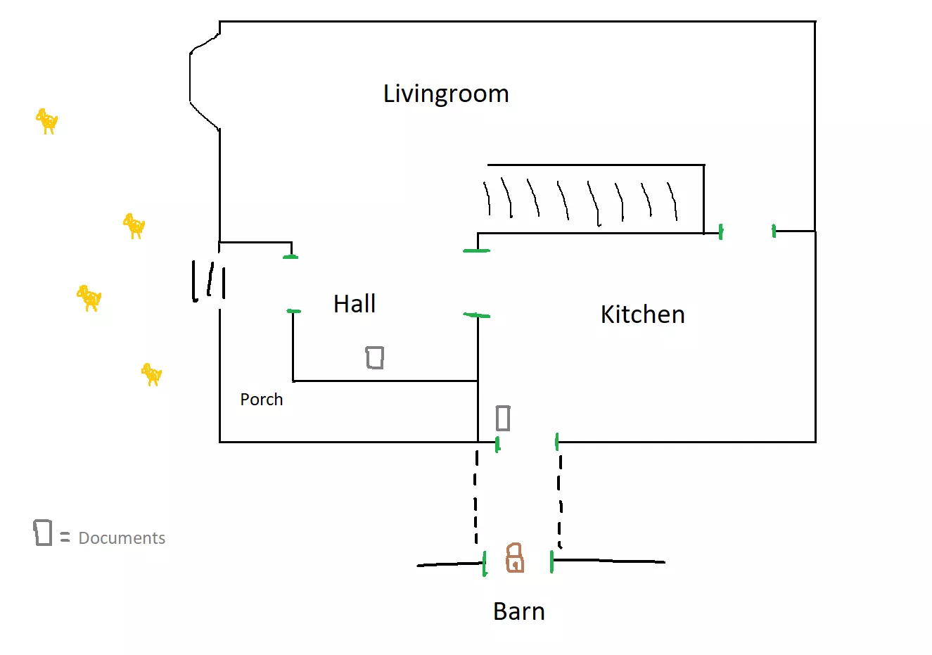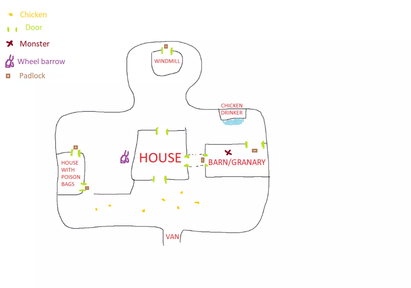 LEYENDA: Esta historia se remonta a cuando Milicent y su marido compraron esta vieja granja. Decidieron comprarla porque era muy barata, aunque nunca entendieron por qué. Los anteriores propietarios eran nativos y decían que el molino tenía propiedades curativas mágicas. Cuando les vendieron la casa, les dieron unos amuletos. Milicent y Joe los tomaron como simples regalos. También les dieron una caja que colocaron en el cementerio porque, según los nativos, atrapaba el mal. Después de un año viviendo en la granja, un día apareció un anciano muy delgado que les pidió algo de comida. El marido de Milicent se negó y le echó de la granja. El hombre se marchó amablemente. Una semana más tarde, Joe se puso muy enfermo, sentía un hambre insaciable y ya no volvió a ser el mismo. Milicent comenzó a alimentarlo con animales vivos, pero no fue suficiente, su hambre no cesaba. Semanas después intentó atacarla. Desesperada por esos acontecimientos, Milicent decidió utlizar la caja que le dieron los nativos. Consiguió empujar a su marido dentro de ella y la caja lo absorbió. La cerró y le prendió fuego. Parecía que la pesadilla había terminado. Años después de esos acontecimientos, Karen y su marido Joe heredaron la granja. Eran una familia con dos hijos. Al igual que los anteriores propietarios, les gustaban las cosas baratas y compraron un gran cargamento de pesticida a buen precio, estaba caducado. Un día Karen paseaba por el jardín y encontró la vieja caja. La abrió pero no encontró nada dentro. De ella salía un aire maloliente y Karen empezó a sentir hambre. Pasaron los días, Karen tenía cada vez más hambre y se enfadaba con facilidad. Engordó y su pelo empezó a blanquearse y a caerse. Karen empezó a comerse los pollos de la granja, crudos... hasta que un día se comió a sus hijos. Joe, derrotado por la desgracia, decide usarse a sí mismo como cebo y sacrificarse para encerrar a Karen en el granero. OBJETIVO: Capturar al monstruo y llevarlo a la furgoneta. 1º. Encontrar la cizalla en la casa central. Está en el piso de en medio. 2º. Abrir la puerta de la casita (2 puertas) donde está el veneno. Y si no juegas solo, abre la puerta del molino. 3º. Recoge algunas bolsas de veneno y ve al bebedero de pollos y dejalas allí (pulsa la tecla 2). 4º. Ve a la cocina y coge una sartén, luego sal a buscar un pollo, aturdelo y cogelo. 5º. Abre el granero y ve al bebedero de pollos, llénalo de agua, pon veneno y moja al pollo. 6º. Encuentra al monstruo y dale el pollo envenenado. Aprovecha el tiempo mientras se lo come y ve a por más. Repite esto hasta que el monstruo quede envenenado. Recógelo con la carretilla y déjalo en la furgoneta. A TENER EN CUENTA: Si el monstruo come algún pollo no envenenado, se recupera y el marcador de pollo subirá (usa la tecla TAB para verlo). No es necesario que te robe el pollo, puede cogerlo de la zona de la granja por sí mismo. Si te pilla y no llevas ningún pollo, mueres. Si no estás jugando solo, solo estarás herido y necesitas ir al molino para recuperarte. Para ello necesitas una estatuilla de ángel situada en la parte superior de la casa central. Si juegas pvp puedes ir a curarte solo. Si juegas Coop. entonces, otro jugador que tenga esta estatuilla debe ir al molino contigo y curarte. Cuando el contador de pollos sea cero, es decir el monstruo se ha comido todos los pollos envenenados, caminará erráticamente y después de un rato caerá al suelo, normalmente por la zona del principio. Ve a coger la carretilla, recoge al monstruo y déjalo en la furgoneta. CONSEJOS: Vigila donde está el monstruo y evítalo desde la distáncia. (ya que si te ve se lanzará corriendo a por ti y será dificil esquivarlo. Si sois varios, uno de vosotros puede centrase en vigilar de lejos al monstruo e informar al resto mientras se encargan del veneno y los pollos. O bien hacerlo entre todos con una buena comunicación). Lleva unas bolsas de veneno al bebedero de pollos y déjalas allí. El agua dura 2 minutos hasta que se acaba. Intenta que el monstruo no vaya a la zona donde están las gallinas, sino recuperará vida. Puedes intentar que te siga cuando lleves un pollo envenenado y corra tras de ti hacia la zona que te interesa, hasta que se lo des. El agua envenenada permanece durante un tiempo limitado, intenta aprovecharlo, puedes usar la casa, el granero o la casita como atajos cuando veas al monstruo en otra zona. Puedes soltar pollo envenenado en los lugares que quieras y ahí se quedan. Ponlos en zonas estratégicas. Puedes tener unos 4 pollos envenenados al mismo tiempo. No aparecerán nuevos pollos hasta que el monstruo se coma alguno. Un pollo normal aturdido sólo dura unos 30 segundos antes de levantarse y huir. El monstruo tarda unos 12 segundos en tragarse uno. Para conseguir el logro Rusty Old Locks (Romper todas las cerraduras de la granja), debes abrir la puerta del granero que da al bebedero de las gallinas. Se abre desde el interior.Debes abrirla antes de que lo haga el monstruo, porque si no lo haces, al cabo de un rato el monstruo la abrirá y tendrás que volver a empezar. Se entra al granero desde el paso que hay desde la cocina. MAPAS Más abajo están los mapas de la granja así como la localización de las 24 notas, los posibles respawns de las cizallas, las estatuillas de ángel, y otras localizaciones como el veneno, el molino, las gallinas, los candados a romper, la carretilla o el bebedero. FINAL SECRETO: Cuando tengas al monstruo en la carretilla no lo dejes en la furgoneta. Ve al cementerio, por donde está el molino, a la derecha (con la casa a tus espaldas), busca una caja abierta. Deja el monstruo allí. Puedes ir a la furgoneta y terminar la misión, ¡PERO! hay otro secreto. Coge un pollo y envenénalo. Déjalo en la caja. Aparecerá un gran pollo verde que puedes matar a sartenazos. Ve a la furgoneta y termina la misión. Granja, Notas (logro) Notas: 24 en total. 1 En la caseta donde es