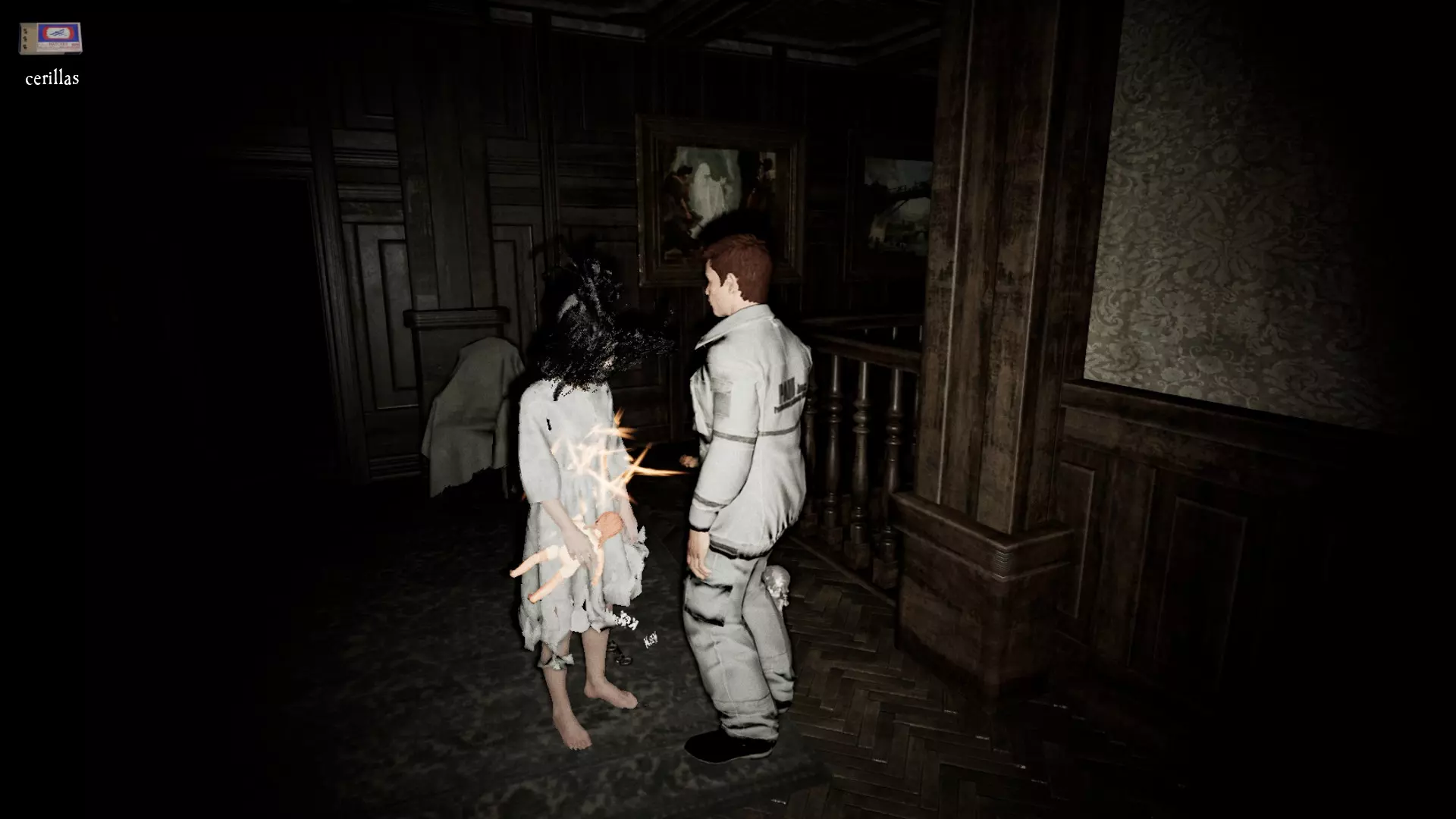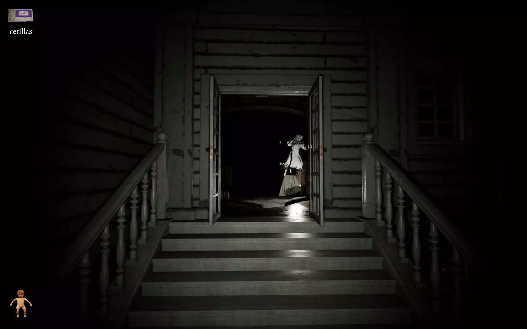 接下来你需要做的是找到钥匙。顺序总是:客厅、卧室、阁楼和地下室,因为从第一把钥匙开始,下一把会出现在用这把钥匙打开的某个房间里,再下一把则出现在用前一把钥匙打开的房间里,依此类推。还有第五把钥匙,它不是通关必需的,但要获得其中两个成就则需要它。 女孩 女孩名叫艾米丽,似乎被一个或多个恶灵附身。你第一次见到她时,她会在房子里平静地走动。她倾向于去你所在的地方,如果你站着不动,她就会紧挨着你站着。如果你迟迟找不到钥匙并打开所有房间,艾米丽很可能会变身并进入怪物模式。这通常发生在时钟敲响后大约3分钟。你会通过听到一声可怕的呻吟意识到这一点。如果你动作迅速,她的第一次变身会在你烧掉第一个标记娃娃时发生。