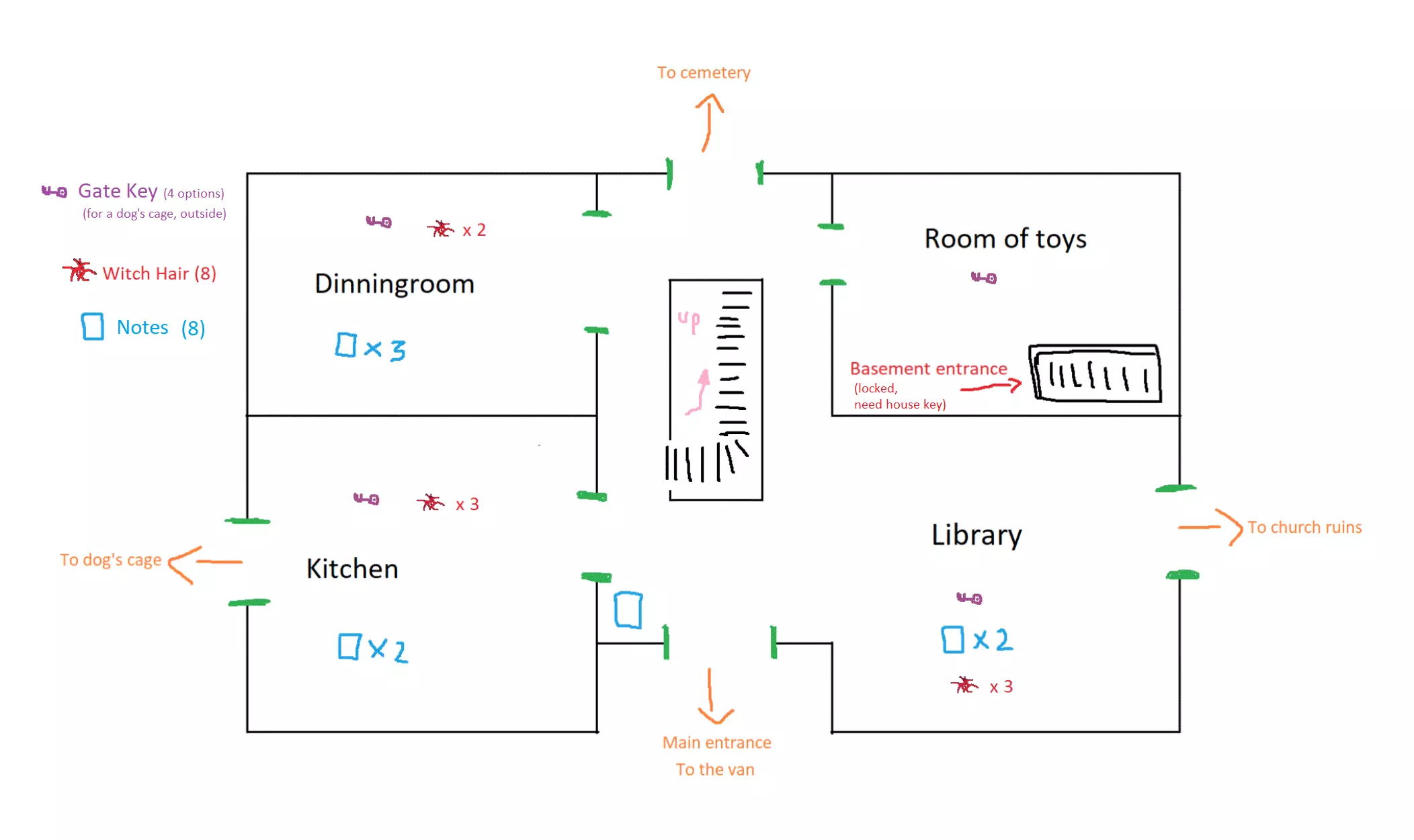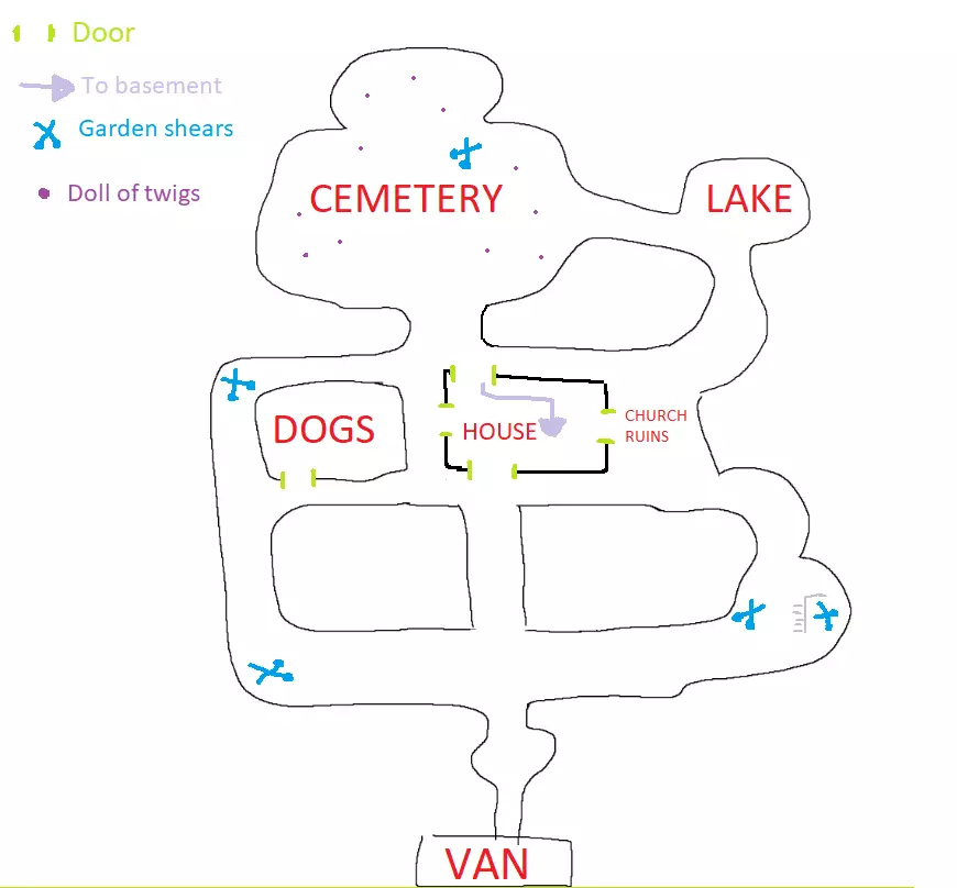 成就【Beat the Game Developer III】的漏洞:在单人游戏模式下于森林场景中20分钟内获胜。 开始单人游戏,然后接受合作模式邀请并赢得游戏。 地图: 在此地图中,你可以找到各种笔记、女巫毛发的位置,以及钥匙、修枝剪可能出现的不同地点和地图的主要区域。