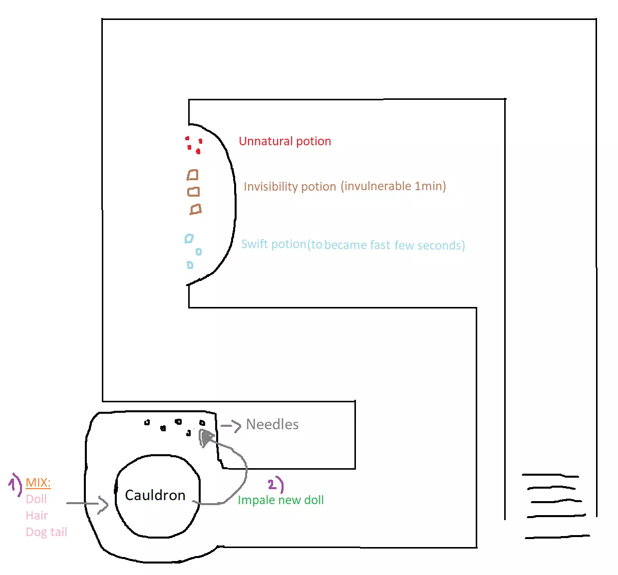 目标:抓住女巫 1. 拿一把修枝剪,它们在木车里(你可以在地图部分查看其位置)。 2. 拿一朵玫瑰。它们在森林里,靠近树木。 3. 进入房子并找到两把钥匙。一楼有狗笼的钥匙。在楼上你会找到地下室的钥匙。在地图上你可以看到钥匙的不同刷新点。 4. 拿一绺女巫的头发(它们在房子里,通常在桌子、床或浴室里)。 5. 放出狗(它们在房子外面的一个大笼子里)。 6. 剪掉其中一只的尾巴(你需要修枝剪)。 7. 从墓地拿一个根娃娃(你需要修枝剪)。 8.快速回到房子并打开地下室(地下室在玩具房内,从墓地进入房子后,向左转,房间尽头有一个活板门)。在隧道尽头找到大锅,将材料混合放入锅中。会出现一个树枝玩偶,拿起它并将其插入墙上的指针中。 重复整个过程9次。 第9次:找到女巫的尸体并将其带到货车上。 注意事项: 如果女巫抓住你,除非你拿着一朵玫瑰,否则你会死亡。 如果你和其他人一起玩,当你被抓住且没有玫瑰时,你会变成一只老鼠。 你必须前往净化湖恢复(它在墓地旁边的一个角落里。查看地图)。记住,在恢复人形后,你需要重新拿起修枝剪和玫瑰。 当你捡起根娃娃时,会有一个影子追着你想要抢走它(它不会杀死你,也不会把你变成老鼠,只会把你推倒在地并夺走娃娃)。你必须快速及时赶到坩埚那里。如果被它抓住,它会把娃娃带走并出现在同一个地方,但你不能浪费时间,因为女巫变得越来越凶猛。当你被女巫或影子攻击时,不会丢失你携带的材料(毛发、尾巴)。 药水: 在地下室有3种药水供你使用。一些用于大幅提速(3瓶,效果立即生效,持续30秒) 另一些用于隐身(3瓶,生效需几秒钟,持续1分钟)。对影子无效。