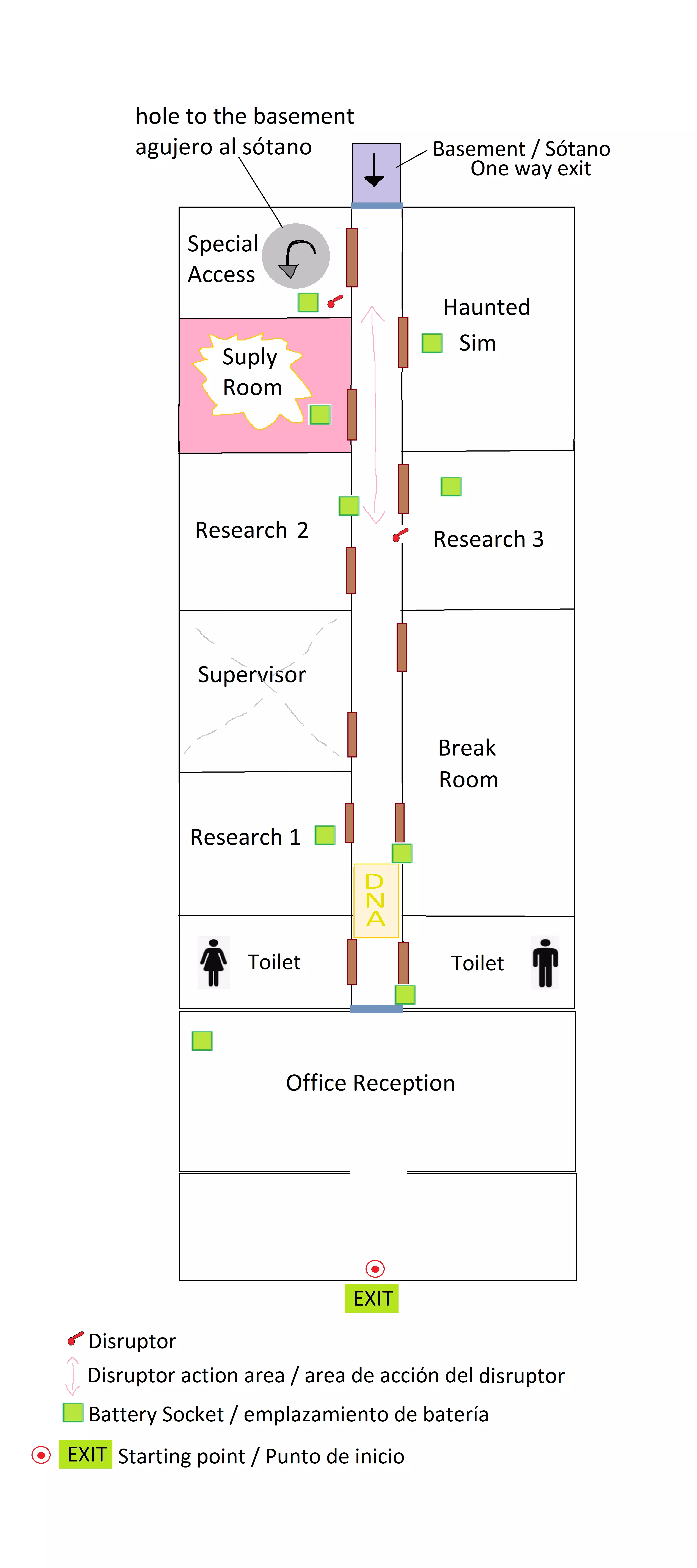 Ha habido un apagón y la central se ha quedado sin energía. Los monstruos encerrados en celdas escaparán si la batería de la puerta de su celda se agota. Usa las baterías y los cargadores para retenerlos y aguanta hasta que el suministro eléctrico se reestablezca. Si escapan muchos entes se activará el proceso de autodestrucción y todo será eliminado, tú morirás. Inicio: Nada más empezar, entra en la sala de recepción y al fondo izquierda coge de la mesa una batería y coloca la otra en el hueco de la pared detrás del escritorio. Abre la puerta de entrada a las oficinas y recorre todo el pasillo (te detendrán unos segundas en la zona de extracción voluntaria de ADN) continúa recto hasta casi el final y entra en la penúltima puerta de la izquierda donde dice Suply Room (a menos que quieras hacer logros, no necesitas abrir ninguna otra sala de esa planta). Pon una batería a cargar y coge 6 objetos distintos (rosa, muñeca, paja, retrato, cráneo y pollo) y una batería si no llevas. Sal y entra por la puerta del final a la izquierda llamada Special Access. Coloca la batería que tienes en el lugar correspondiente (no hace falta que esté al 100% porque es solo para darle una vez) y presiona el botón que abrirá la compuerta. Vuelve al Suply Room, coge una batería al 100%y tírate por el agujero, te llevará al sótano. Situación: En el sótano hay: 8 celdas de contención con un ente encerrado en cada una y con una batería en la puerta que permite que la puerta quede cerrada mientras la batería tenga energía. También hay una celda independiente con un monstruo mayor (no usa batería), una zona central de carga de baterías, un incinerador (usa batería), disruptores a lo largo de los pasillos (se alimentan de las baterías de cada zona), y la unidad de contención menor (con dos baterías que tardan en descargarse y solo se abrirá si aguantas el tiempo suficiente). QUÉ HAY QUE HACER: Aguanta el tiempo suficiente con las celdas cerradas hasta que las baterías de la unidad de contención menor (Lesser Container Unit) se agoten y se liberen unas sombras. Ciérrala lo antes posible poniendo dos baterías nuevas. Tras ello continúa conteniendo a los monstruos en sus celdas. Si aguantas lo suficiente, Shang (un peligroso ente encerrado en una celda especial) se liberará. Tendrás que debilitarlo varias veces (unas 5 o 7 aprox. según los jugadores que haya) usando los disruptores hasta derribarlo. Vuelve al proceso de contener a los monstruos en sus celdas hasta que vuelva a descargarse la unidad de contención menor. Vuelve a cerrarla colocando baterías nuevas y en poco tiempo las muñecas marcadas (hay 30 si juegas solo y añade 10 muñecas por cada jugador extra) serán liberadas. Debes buscarlas y quemarlas en el incinerador (tienes una sobre la mesa de la celda de Emily (celda 4, Alfa loop). El incinerador necesita una batería para poder usarlo (consume bastante energía así que hay que recargarlo con frecuencia). Durante esta etapa la unidad de contención menor volverá a abrirse, trata de cerrarla. Cómo usar las baterías: Recógelas por las distintas zonas del mapa. Puedes cargarlas en la planta de arriba en el cargador de la sala de suministros (donde están los distintos objetos para calmar momentáneamente a cada monstruo ante un ataque) o mucho mejor en el sótano en una zona repleta de cargadores (ya que la partida se va a desarrollar abajo). Recuerda que cuando una batería todavía tiene energía, emite una luz verde, eso puede hacerte ganar tiempo, basta con asomarte al pasillo para saber cuál ha fallado. Ten en cuenta que no puedes extraer o intercambiar baterías ya colocadas hasta que la que está en uso se agote. Si quieres acelerar el proceso para poder colocar una que tengas cargada, puedes abrir y cerrar la puerta varias veces hasta agotarla y poner la tuya (cada botonazo consume 5 de energía). Esto puede ser útil en un momento dado si desear controlar mejor los tempos o las zonas. Cómo devolver un ente a una celda: (y evitar la autodestrucción) Si hay entes que han escapado, devuélvelos a su celda usando los disruptores. Si el ente queda atrapado en la zona de acción del disruptor (los pasillos donde están las puertas de las celdas), devolverá al ente a una celda vacía. Contra más entes libres haya más rápido avanza el contador de la autodestrucción. Devolver entes a sus celdas te hará ganar tiempo deteniendo temporalmente la cuenta atrás. "Revivir": Para recobrar la forma humana basta con ir a la zona de descontaminación (en el sótano) o de extracción voluntaria de ADN (en la planta superior). Ya que subes a "curarte", puedes aprovechar para volver a la suply room y coger otros 6 objetos y batería y bajar por el agujero. Asegúrate de que la puerta tiene batería para acceder a la planta superior. DESARROLLO ETAPA FINAL: En la etapa final tendrás que ser rápido ya que mantener a las entidades en sus celdas será mucho más difícil. Una vez las muñecas malditas son liberadas (esto sucede un tiempo después de la segunda vez que recargas la unidad de contención menor tras derribar a Shang) deberás ir cargando la batería del incinerador (que está justo antes de subir las escaleras) para poder quemarlas (puedes comprobar las que faltan presionando la tecla TAB, recuerda que tienes una sobre la mesa de la celda 4). Para protegerte de los enemigos puedes centrarte solo en las baterías 1 y 5 (sobretodo la 5 que es la más próxima al horno) (o también si puedes y sois varios, en las 2 y 6). Tener en cuenta que las muñecas abrirán las celdas y agotarán las baterías (además de las sombras de la unidad de contención menor que también se abrirá), de modo que múltiples entidades escaparán al mismo tiempo. Puedes devolver a varias entidades a la vez usando el disruptor cuando estas estén en alguno de los pasillos. Asegúrate de tener al menos una batería por pasillo o no podrás usar el disruptor. Ten en cu