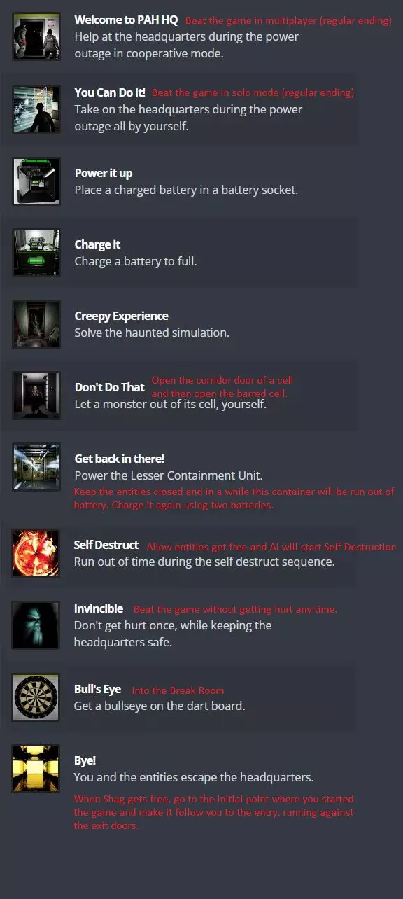 紧急停电应急预案: 1. 将电池放入插座为特定区域供电。 2. 开启紧急入口活板门。 3. 开启单向门。 4. 保持拘留室通电并关闭。 5. 保持小型收容单元通电。 6. 立即修复电池和系统故障。 闹鬼模拟:PAH Inc.用于新员工培训的简单追逐体验模拟。必须通电才能激活。进入后,需完成模拟才能离开。部分员工未能从该模拟中返回。(在模拟场景中,你会发现另一张便条:“穿过另一边,走向火焰”。) 小型收容单元:小型收容单元内部收容了许多小型灵体。它采用了超自然磁力技术。如果该单元断电,小型灵体可能会逃脱。重新启动单元可使所有小型灵体回到其内部。自由游荡的小型灵体将引发问题。 拘留牢房:下层的拘留牢房用于关押超自然存在。它们由超自然护盾技术保护。只要牢房处于启动状态,它们就不应能逃脱。仅由电池供电的单元格可能会出现故障。 备用电力系统:办公室配备了应急电力系统。可以将电池放入插座为附近区域供电。你可以在供应室找到电池。可以使用充电站为电池充电。电池可能随时出现故障,请立即更换。该系统存在错误,可能会偶尔出现故障。 自毁系统:如果有过多实体逃脱,自毁程序将启动。自毁程序会摧毁建筑内的所有东西。请立即将实体送回其单元格。干扰器异常现象:办公室周围安装了干扰系统。使用拉杆启动系统。如果系统启动,将发射一道激光,削弱超自然实体。它还能够将超自然分子传送到空牢房中。这项技术需要大量电力。在电力中断期间,使用拘留牢房电池的能量。